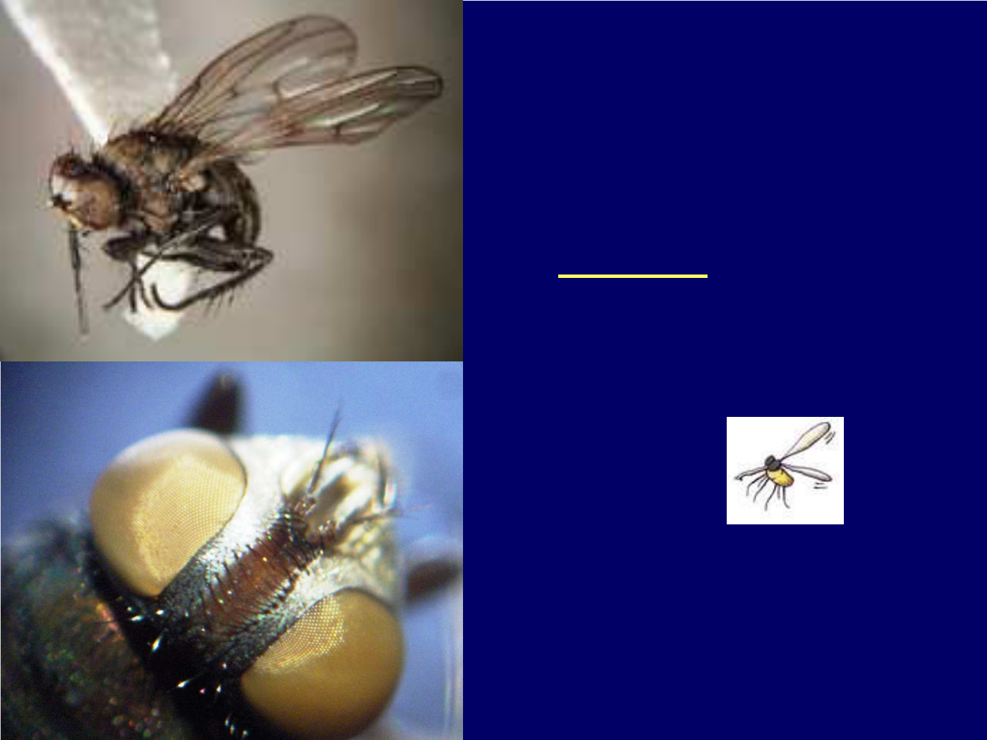 DIPTERA SUBORDENS: Brachycera Mosca Mutucas Nematocera Mosquitos ORDEM DIPTERA SUBORDENS: • Brachycera Infra-ordens • MUSCOMORPHA: Moscas • TABANOMORPHA: Mutucas • TABANOMORPHA: Mutucas • Nematocera Mosquitos e borrachudos BrachyceraBrachycera (moscas)moscas) Brachycera (mutucas) BrachyceraBrachycera (moscas)moscas) Nematocera (mosquitos) DÍPTEROS BRACHYCERA MUSCOMORPHA MoscasMoscas Tabanus (Cabeça)DÍPTEROS BRACHYCERA TABANOMORPHA CICLO HOLOMETÁBOLO Moscas Mutucas MUSCOMORPHA Calyptratae (Caliptra = escama) MUSCIDAE • Tamanho médio, cor variada • Arista nua ou plumosa. • Aparelho bucal funcional • Faixas negras no mesonoto• Faixas negras no mesonoto DIPTERA MUSCOMORPHA: MOSCAS Aparelho bucalAparelho bucal MUSCIDAE: Muscinae Stomoxys calcitransMusca domestica Haematobia irritans Musca domestica 4 listras R1+R2 R4+R5 M1+M2 R1+R2 “m” Musca domestica Matéria em decomposição 75 – 150 ovos X Incubação = 24 hs Pupal = 14 a 28 dias Stomoxys calcitrans (moscas dos estábulos) 4 faixas Larva de Stomoxys calcitrans Forma de “S” Alimentação X dia Vida = 30 dias 60 - 800 ovos 20 – 50 ovos/dia Matéria orgânica = fezes Pupal = 30 dias Several stable flies (Stomoxys calcitrans) feeding on a dog.Dantas-Torres Parasites & Vectors 2008 1:25 Mato Grosso: the prevalence of T. evansi infection is serologically estimated to be around 30% . Dogs are regarded as efficient reservoirs of T.evansi, which is the T.evansi, which is the causative agent of a severe disease affecting horses, commonly known as mal de cadeiras or surra. Haematobia irritans (moscas do chifre) Haematobia irritans Ectoparasita dia e noite Preferência corporal Larva de Haematobia irritans CALLIPHORIDAE Moscas varejeiras. • Azulados, violáceos, esverdeados ou cúpreos, com reflexos metálicos. •Produtoras de miíases. • Gêneros importância animal: • Cochliomyia •Phaenicia • Chrysomya moscas das bicheiras Conforme a biologia desses insetos, as respectivas afecções que causam são de duas categorias: • 1 – Biontófagas; • 2 – Necrobiontófagas.• 2 – Necrobiontófagas. Cochliomyia hominivorax (azulada) C. macellaria (verde brilhante) 3 faixas no mesonoto Califorídeos de tamanho médio amarelados Larvas de C. hominivorax Biologia Cochliomyia (Espiráculos) C. hominivoraxC. macellaria Troncos traqueais Forma de dedos separados Chrysomyia (Moscas alimentando-se) SARCOPHAGIDAE: Sarcophaga Fêmeas larvíparas HIPPOBOSCIDAE São moscas hematófagas de aves e alguns mamíferos. Melophagus ovinus Falsos carrapatos dos ovinos Vivíparos Ciclo de vida do Melophagus ovinus Larva é depositada sobre a lã.Pupa Adultos saem da pupa. HIPPOBOSCIDAE Pseudolynchia canariensis Gasterophilus nasalis olhos pequenos separados nos dois sexos • Operculados, com 1,5 mm. • Coloração amarelo-castanha • Presos em pêlos: G. intestinalis • G. nasalis – intermandibular e garganta; • G. haemorrhoidalis – boca. Gasterophilus: G. nasalis; G. intestinalis; G. haemorroidalis • G. haemorrhoidalis – boca. L3 : 10 a 12 meses. • Ao se aproximarem provocam correria e pânico – pode levar a fraturas; • Migração pela faringe, esôfago e estômago pode causar irritação local • Larvas no piloro podem obstruir ou dificultar passagem alimentar Gasterophilus nasalis (Larvas no duodeno) Oestridae Oestrus ovis Larviposição do Oestrus Oestrus ovis Oestrose Placa peritrema CUTEREBRIDAE; Dermatobia hominis Mosca do Berne insetos zoofílicos CUTEREBRIDAE Mosca do Berne: insetos zoofílicos Dermatobia hominis Stomoxys e Musca: Ovos deOvos de Dermatobia hominis Dermatobia hominis (mosca do berne) como vetores foréticos e Hospedeiros intermediários Larva do Berne Larvas de 1o instar de Dermatobia hominis eclodindo Dermatobia hominis (Adulto emergindo) Diptera SUBORDEM: Brachycera Infra-ordem TABANOMORPHA Tabanídeos MutucasMutucas Moscas do cavalo Fêmeas/hematófagas TABANOMORPHA: Tabanus (Cabeça) Chrysops Massa de ovos de Tabanidae PupaPupa LarvasLarvas 8 estágios8 estágios Inimigos Naturais das Moscas