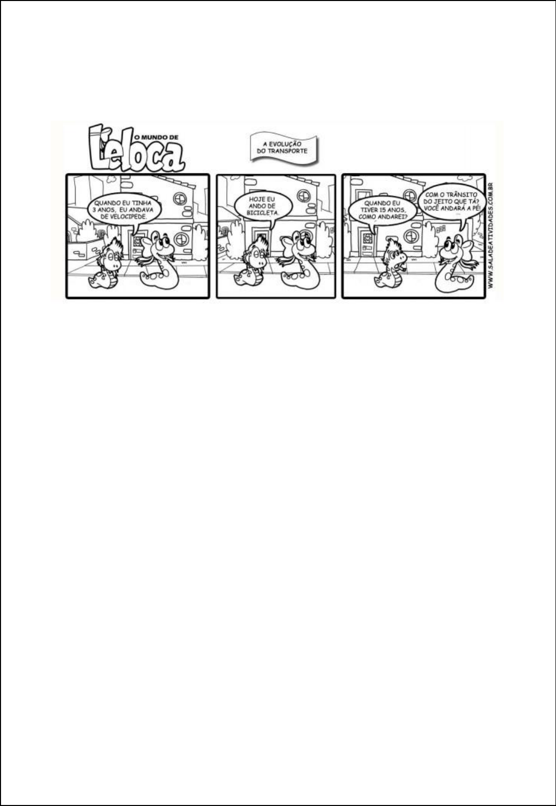 E.E.B.M. Pref. Portinho Bittencourt Data: ___/___/2019 Mais educação - Língua Portuguesa Profª: Thayná Fernandes Rafael. Aluno (a): Turma: Atividades de Interpretação de Texto: Leia a tira. De acordo com esse texto, o personagem estava pensando: (A) somente no seu passado. (B) somente no seu presente. (C) somente no seu futuro. (D) no seu passado, presente e futuro. No último quadrinho, o que a personagem quis dizer sobre o trânsito? (A) Que está mais ou menos. (B) Que no futuro estará pior. (C) Que pode melhorar. (D) Que já foi bom. Em que modo estão os verbos: ando e andava? (A) No indicativo. (B) No subjuntivo. (C) No imperativo. (D) No infinitivo. 04- No terceiro quadrinho, o verbo ter, dá ideia de: (A) presente (B) passado (C) futuro (D) presente e passado
