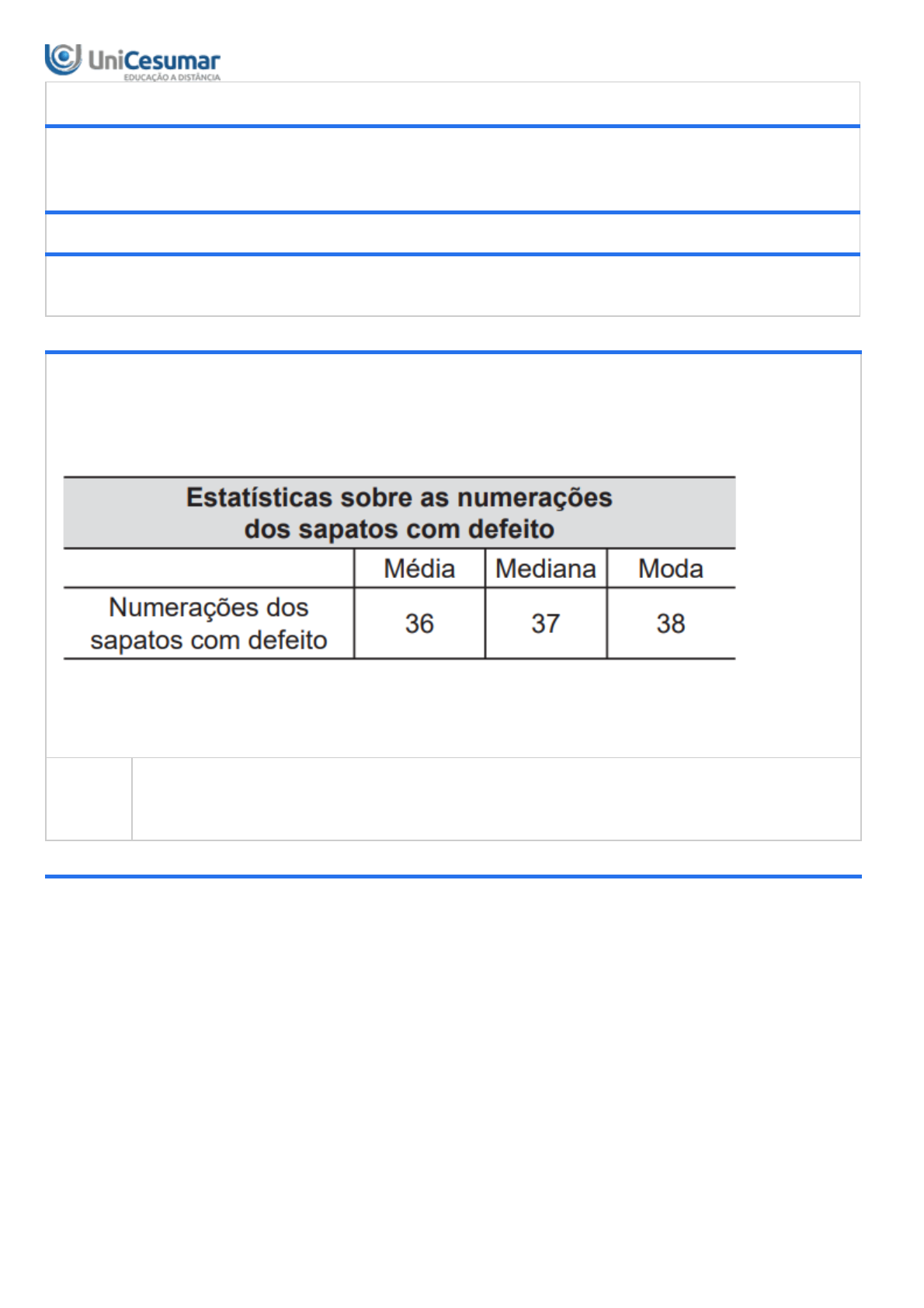 17/08/2019 Unicesumar - Ensino a Distância 1/7 Protocolo de Finalização Nº 000014379438 O aluno EVALDO CÉSAR SAMPAIO com RA 1929393-5 finalizou a atividade ATIVIDADE 2 - ENG SOFT - ESTATÍSTICA - 2019C em 17/08/2019 00:04:56 ATIVIDADE 2 - ENG SOFT - ESTATÍSTICA - 2019C Período:05/08/2019 08:00 a 20/08/2019 23:59 (Horário de Brasília) Status:ABERTO Nota máxima:0,50 Nota obtida: 1ª QUESTÃO Uma loja que vende sapatos recebeu diversas reclamações de seus clientes relacionadas à venda de sapatos de cor branca ou preta. Os donos da loja anotaram as numerações dos sapatos com defeito e fizeram um estudo estatístico com intuito de reclamar com o fabricante. A tabela contém a média, a mediana e a moda desses dados anotados pelos donos da loja. Disponível em: <http://portal.inep.gov.br/> Acesso em: 07 dezembro. 2018 (adaptado). Sendo assim, com base no enunciado e na tabela, podemos afirmar que: RESPOSTA: Se somarmos todos os sapatos defeituosos com numeração 36, e do total dessa soma dividirmos pela quantidade total de sapatos com numeração 36, teremos uma proporção da quantidade de sapatos defeituosos do número 36, em relação ao total de sapatos de numeração 36. 2ª QUESTÃO 17/08/2019 Unicesumar - Ensino a Distância 2/7 A história da teoria das probabilidades teve início com os jogos de cartas, dados e de roleta. Esse é o motivo da grande existência de exemplos de jogos de azar no estudo da probabilidade. A teoria da probabilidade permite que se calcule a chance de ocorrência de um número em um experimento aleatório. Sendo assim, depois de jogar um dado em forma de cubo e de faces numeradas de 1 a 6, por 10 vezes consecutivas, e anotar o número obtido em cada jogada, constituiu-se a seguinte tabela de distribuição de frequências. Disponível em: <https://projetomedicina.com.br/wp-content> Acesso em: dezembro. 2018 (adaptado). Com base nas informações da tabela, pode-se afirmar que: RESPOSTA: Dentre as três medidas de posição, média, mediana e moda, a soma dos valores que as mesmas possui, é um número maior ou igual 7. 3ª QUESTÃO Uma empresa de cosméticos comercializa cinco diferentes tipos de produtos e os armazena em uma estante de 90 por 90 de posições. Em cada posição da estante, ficam armazenadas 2 caixas de xampu, 2 de condicionador, 3 de hidratante, 10 de tintura e 5 de demaquilante. Sabendo que cada caixa contém 20 frascos de um produto, qual a probabilidade de selecionar um frasco do produto, sendo esse frasco uma tintura? Disponível em:<http://portal.inep.gov.br/provas>. Acesso em: 07 dezembro. 2018 (adaptado). RESPOSTA:45,45% 4ª QUESTÃO Dia de gincana na escola é uma verdadeira festa. Elas são um momento em que todas as turmas têm oportunidade de se encontrar e brincarem juntas. Além da competitividade saudável, elas estimulam a cooperação e valorizam o trabalho em equipe. Enquanto em algumas escolas elas acontecem rotineiramente, em outras elas são reservadas para datas comemorativas, o que faz com que sejam ainda mais especiais. É possível formar uma equipe a partir da cada turma. Entretanto, dependendo da quantidade de alunos, dentro de uma mesma classe podem ser formadas várias equipes. Disponível em: <https://bit.ly/2J79aZj> Acesso em: 11 dezembro. 2018. Suponha que a etapa final de uma gincana escolar consistia em um desafio de conhecimentos. Cada equipe escolheria 10 alunos para realizar uma prova objetiva, e a pontuação da equipe seria dada pela mediana das notas obtidas pelos alunos. As provas valiam, no máximo, 10 pontos cada. Ao final, a vencedora foi a equipe Ômega, com 7,8 pontos, seguida pela equipe Delta, com 7,6 pontos. Um dos alunos da equipe Gama, a qual ficou na terceira e última colocação, não pôde comparecer, tendo recebido nota zero na prova. As notas obtidas pelos 10 alunos da equipe Gama foram 10; 6; 8; 9; 7; 6; 7; 8; 6; 0. Se o aluno da equipe Gama que faltou tivesse comparecido, essa equipe: 17/08/2019 Unicesumar - Ensino a Distância 3/7 RESPOSTA:Permaneceria na terceira posição, independentemente da nota obtida pelo aluno. 5ª QUESTÃO Para atuar na área de vendas é preciso ter veia de vendedor, afirma Luís Augusto Ildefonso da Silva, consultor de varejo e diretor de relações institucionais da Associação Brasileira de Lojistas de Shopping (Alshop). Segundo o consultor, os consumidores estão mais informados e exigentes, portanto, objetividade no atendimento, foco nas necessidades do cliente e informações sobre o produto ou serviço a ser comercializado são primordiais para uma boa venda. Disponível em: <https://carreiras.empregos.com.br/mercado/profissao-vendedor/>. Acesso em: 21 abril. 2018 (adaptado). Analise os dados da tabela a seguir, referente aos valores de vendas em reais, para uma amostra de determinado número de vendedores. Com base nos dados apresentados, qual foi o valor de venda que mais ocorreu entre os vendedores? RESPOSTA:2000,00. 6ª QUESTÃO 17/08/2019 Unicesumar - Ensino a Distância 4/7 Um país não se faz só de estereótipos, ou o Brasil seria apenas a terra do samba, da praia, da Amazônia, do Carnaval. Felizmente, somos também a terra do axé, do maracatu, da bossa nova, da mistura. Do cerrado, dos cânions, das serras, do Pantanal. Do Réveillon mais famoso do mundo, sim, mas também das festas de reinado, de São João, do Boi Bumbá. Mas mais do que isso: o Brasil sabe sempre inventar mais um pouquinho. Todo verão surge uma nova praia do ano. Espaço para isso é o que não falta num litoral de mais de nove mil quilômetros de extensão. Com essas diversas opções para férias, lazer, descanso, faz com que o Brasil seja muito forte na área turística, assim o desenvolvimento da atividade turística no Brasil relaciona-se especialmente com os possíveis efeitos na redução da pobreza e das desigualdades por meio da geração de novos postos de trabalho e da contribuição para o desenvolvimento sustentável regional. Disponível 