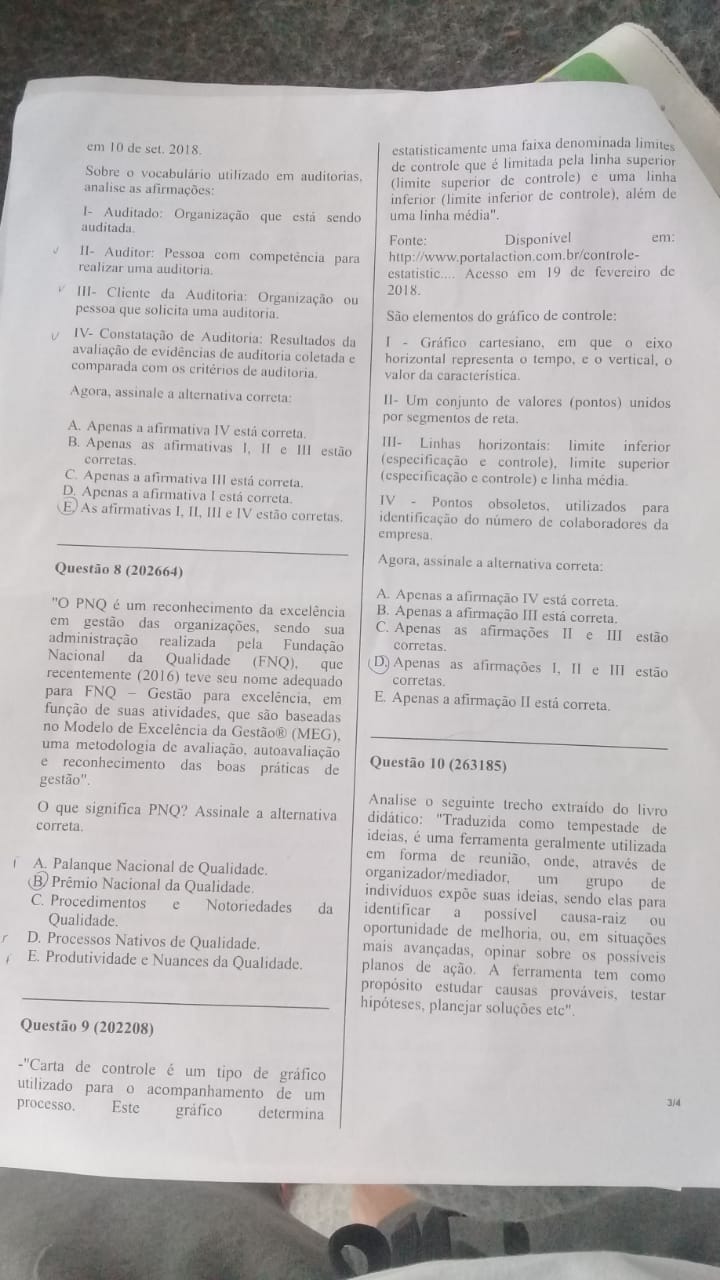 Analise seguinte trecho extraido do livro didatico: "Traduzida como tempestade de ideias uma ferramenta geralmente utilizada forma reunido, onde, atraves de organizador/mediador grupo de individuos expoe suaS ideias, sendo clas para identificar a possivel causa-raiz ou oportunidade de melhoria, ou, em situacoes mais avancadas, opinar sobre possiveis planos de acao A ferramenta tem como proposito estudar causes provaveis, testar hipoteses, plancjar solucoes etc" Assinale a alternativa correta. O que significa PNO? A. Palanque Nacional de Qualidade. B. Premio Nacional da Qualidade. C. Procedimentos e Notoriedades da Qualidade. D. Processos Nativos de Qualidade. E. Produtividade e Nuances da Qualidade.