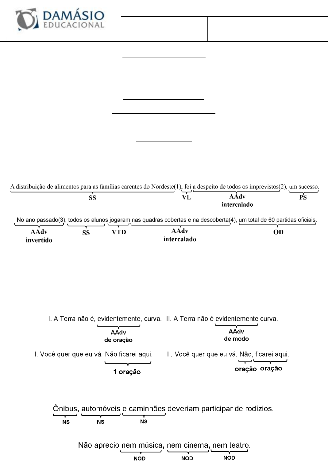 Tribunal de Justiça Professor Eloy Gustavo eloygustavo@uol.com.br Aulas 11 Vírgula / Ponto e Vírgula Damásio Educacional / Professor Eloy Gustavo / Língua Portuguesa 1 Vírgula: Etimologia e Definição Etimologia: diminutivo do latim virga (vara). Definição: Celso Cunha, 2001: “A vírgula marca uma pausa de pequena duração. Emprega-se não só para separar elementos de uma oração, mas também orações de um só período.” Virgulação do Período Simples 1. Entre Termos Naturalmente Ligados Separando termos naturalmente ligados (S de V; VL de PS; V de O; OD de OI; CN do seu núcleo; a maioria dos AAs do seu núcleo): vírgula equivocada. 2. Adjunto Adverbial I Sempre é possível isolar por vírgula o adjunto adverbial que tem mobilidade na frase. Caso ele seja longo ou esteja deslocado, a vírgula é mais desejável. Obs.: uma vez que a posição típica desse adjunto adverbial é no final da frase, considera-se que esteja deslocado quando: 1) aparece no começo da oração – diz-se que ele está invertido. 2) aparece entre outras funções da oração – diz-se que ele está intercalado. Vírgula 1: Vírgula equivocada, pois separa sujeito de verbo. Vírgula 2: Vírgula aceitável, desde que se acrescente outra antes de “a despeito de” para, assim, isolarem o adjunto adverbial intercalado entre o verbo e predicativo. Vírgula 3: Vírgula aceitável, marca a inversão do adjunto adverbial. Vírgula 4: Vírgula aceitável, desde que se acrescente outra antes de “nas quadras” para, assim, isolarem o adjunto adverbial intercalado entre o verbo e objeto direto. II Certos advérbios podem não aceitar vírgula, sob pena de se desvincularem do termo a que se ligam. 3. Coordenação de Termos Separam-se por vírgula termos coordenados entre si, a menos que venham ligados pelas conjunções “e” “ou” e “nem” que não estejam em polissíndeto. Tribunal de Justiça Professor Eloy Gustavo eloygustavo@uol.com.br Aulas 11 Vírgula / Ponto e Vírgula Damásio Educacional / Professor Eloy Gustavo / Língua Portuguesa 2 Exercício 1 (VUNESP – PC-SP / Escrivão de Polícia Civil 2013) Leia o cartum. Assinale a alternativa em que a frase do cartum está reescrita corretamente, no que se refere à pontuação. – Dando continuidade à série “Culinária Saudável”, a) vamos fazer um leitão à pururuca, hoje, sem utilizar a carne de porco. b) vamos fazer, um leitão à pururuca hoje, sem utilizar a carne de porco. c) vamos fazer um leitão à pururuca, sem utilizar hoje, a carne de porco. d) vamos fazer, um leitão à pururuca, sem utilizar a carne de porco hoje. e) vamos fazer um leitão à pururuca, sem utilizar, hoje a carne de porco. Exercício 2 (Auxiliar de Controle Externo - Tribunal de Contas – RJ) Dos trechos abaixo, aquele em que se introduziu uma ou mais vírgulas indevidamente é: a) (...) tudo o que podia ter sido, e não foi (...) b) Porque a vontade, mesmo, era a de me abraçar com ele (...) c) Faz, hoje, nove anos que Clodoaldo Pereira da Silva Moraes (...) d) Eu tirava um prazer extraordinário dessas incursões, ao seu quarto quente de sono (...) Exercício 3 (FUNIVERSA – PC-DF 2009/ Agente de Polícia) O trabalho, nos Estados Unidos, é – em termos absolutos – incomparavelmente mais marcado pelo conhecimento científico... As vírgulas que isolam "nos Estados Unidos" são provocadas pelo(a) a) inserção da expressão de natureza adverbial. b) opção estilística do autor. c) necessidade de enfatizar o nome do país. d) deslocamento do sujeito. e) obrigação de indicar o deslocamento de uma função sintática na ordem direta. 4. Predicativo (Leitura) 4.1 O predicativo com verbos nocionais pode ser confundido com um adjunto adnominal, quando colocado contíguo a um substantivo. Para se evidenciar a sua natureza de predicativo, ele poderá ser isolado por vírgula. 4.2 Se o predicativo, pela sua posição, não corre o risco de ser confundido com o adjunto adnominal, a vírgula pode ser colocada para fins de ênfase. 4.3 No caso da inversão do predicativo, a vírgula passa a ser obrigatória. Tribunal de Justiça Professor Eloy Gustavo eloygustavo@uol.com.br Aulas 11 Vírgula / Ponto e Vírgula Damásio Educacional / Professor Eloy Gustavo / Língua Portuguesa 3 5. Casos Particulares 5.1 Nome do lugar no início da datação: São Paulo, 1 de janeiro de 2008. 5.2 Termos invertidos em pleonasmo: Os meninos, eu os vi ainda agora. 5.3 Expressões explicativas (isto é, a saber, ou seja...): Estudaremos a matéria mais agradável, ou seja, Gramática. 5.4 Expressões corretivas (ou melhor, quer dizer...): Economia, quer dizer, Gramática não será dada hoje. 5.5 Expressões outras (além disso, aliás, com efeito, no mais...): O que você esperava, aliás, com isso. 5.6 Aposto: A Gramática, matéria pouco querida, é fácil. 5.7 Vocativo: O professor de Economia faltou hoje, caros alunos. 5.8 Omissão de verbo: Nós iremos ao cinema; você, ao teatro. 5.9 Palavras repetidas: Cedo, cedo partiremos. 5.10 Conjunções coordenativas no começo da oração coordenada: A Gramática é uma matéria árida, porém todos devemos estudá-la. A Gramática é uma matéria árida; porém todos devemos estudá-la. A Gramática é uma matéria árida. Porém todos devemos estudá-la. 5.10 Conjunções coordenativas intercaladas: A Gramática é uma matéria árida, todos devemos, porém, estudá-la. A Gramática é uma matéria árida; todos devemos, porém, estudá-la. A Gramática é uma matéria árida. Todos devemos, porém, estudá-la. Virgulação do Período Composto 1 As orações coordenadas assindéticas e as sindéticas não iniciadas por “e” Regra: separam-se entre si, por vírgula: 2 As coordenadas iniciadas por “e” Regra: em geral não recebe vírgula: Tribunal de Justiça Professor Eloy Gustavo eloygustavo@uol.com.br Aulas 11 Vírgula / Ponto e Vírgula Damásio Educacional / Professor Eloy Gustavo / Língua Portuguesa 4 Caso