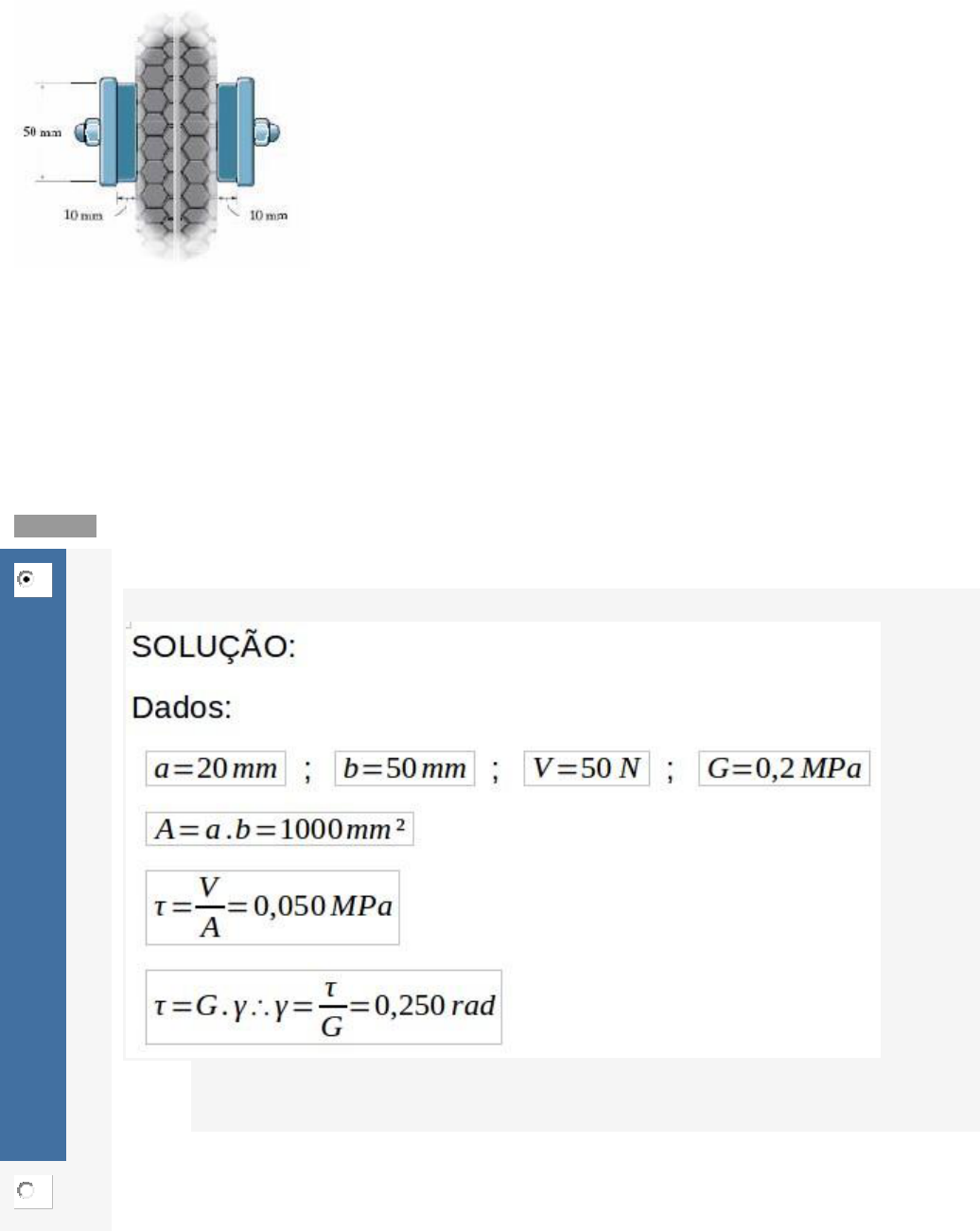 Questão 1/5 - Resistência dos Materiais As sapatas do freio do pneu de uma bicicleta são feitas de borracha. Se uma força de atrito de 50 N for aplicada de cada lado dos pneus, determine a deformação por cisalhamento média na borracha. As dimensões da seção transversal de cada sapata são 20 mm e 50 mm. G=0,20 MPa. τ=V/Aτ=V/A τ=G.γτ=G.γ Nota: 20.0 A 0,250 rad Você acertou! (aula 2, tema 3) B 0,500 rad C 250 rad D 500 rad Questão 2/5 - Resistência dos Materiais Observe a figura, que mostra dois diagramas tensão-deformação para dois tipos de materiais. Analise as afirmações abaixo e assinale a alternativa correta. I – o diagrama da esquerda representa o comportamento de um material dúctil; II – materiais frágeis são aqueles que apresentam pouco ou nenhum escoamento antes da falha, por exemplo, o ferro fundido cinzento; III – materiais dúcteis são normalmente escolhidos para projetos estruturais pois, se ficarem sobrecarregados, exibirão grande deformação antes de falhar. Nota: 20.0 A Todas as afirmações ( I, II e III) estão corretas B Apenas as afirmações I e III estão corretas C Apenas as afirmações II e III estão corretas Você acertou! (aula 2, tema 2) A resposta deste problema é dada por definição (ver Hibbeler – Resistência dos Materiais, páginas 60-62). D Apenas as afirmações I e II estão corretas Questão 3/5 - Resistência dos Materiais A coluna é construída de concreto de alta resistência e seis hastes de reforço de aço A-36. Se for submetida a uma força axial de 150 kN, determine o diâmetro exigido para cada haste, de modo que 0,25 da carga seja suportada pelo concreto e 0,75 pelo aço. Dados Eaço=200GPa e Econcreto=29GPa. δ=(P.L)/(A.E)δ=(P.L)/(A.E) Nota: 20.0 A d=35mm B d=45mm Você acertou! (aula 3, tema 2) C d=70mm D d=90mm Questão 4/5 - Resistência dos Materiais Nota: 20.0 A δAD=4,44.10−4mδAD=4,44.10−4m Você acertou! B δAD=1,66.10−4mδAD=1,66.10−4m C δAD=2,95.10−4mδAD=2,95.10−4m D δAD=2,12.10−4mδAD=2,12.10−4m Questão 5/5 - Resistência dos Materiais σ=FAσ=FA; σ=E.εσ=E.ε e εε=Lf−LiLi=Lf−LiLi Nota: 20.0 A Você acertou! Aula 2 tema 3 B C D