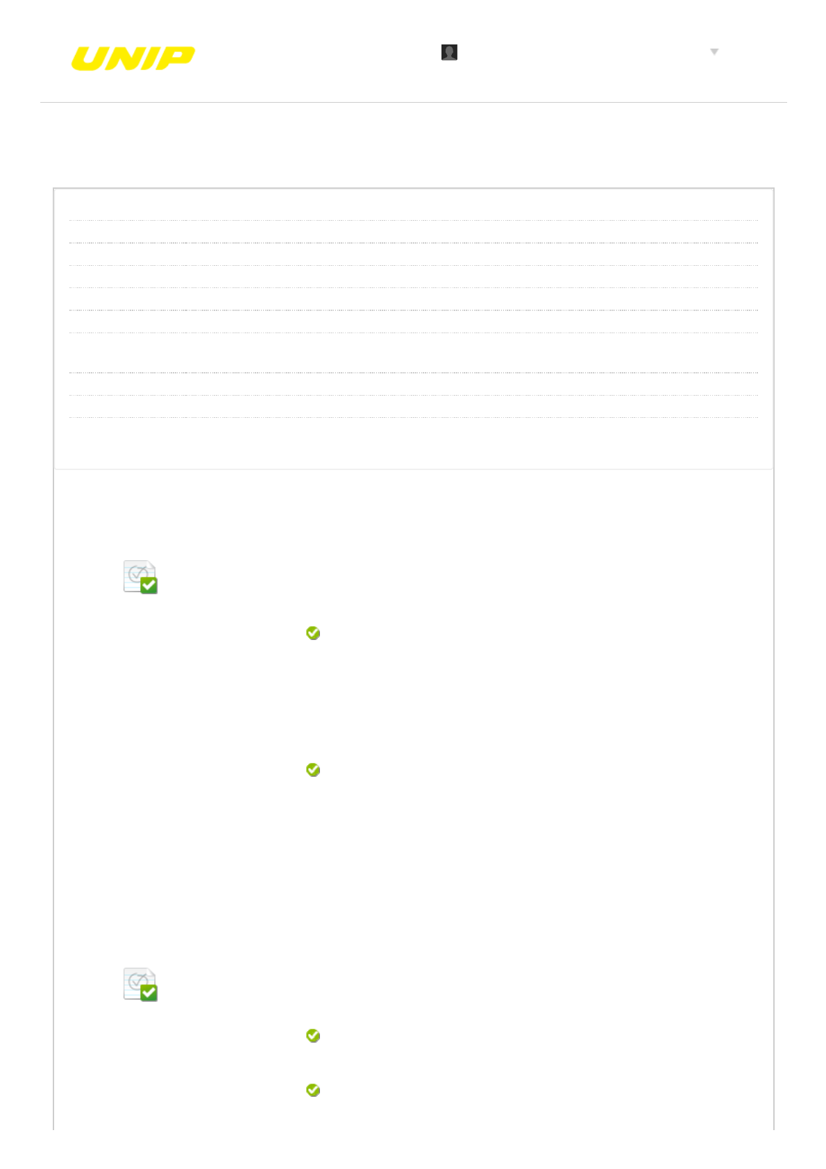 28/08/2019 Revisar envio do teste: ATIVIDADE TELEAULA II – 6864-60_... https://ava.ead.unip.br/webapps/assessment/review/review.jsp?attempt_id=_21736294_1&course_id=_42802_1&content_id=_672918_1&return_… 1/2 Revisar envio do teste: ATIVIDADE TELEAULA II GERENCIAMENTO DE PROJETOS DE SOFTWARE 6864-60_57501_R_20192 CONTEÚDO Usuário gustavo.ferreira14 @unipinterativa.edu.br Curso GERENCIAMENTO DE PROJETOS DE SOFTWARE Teste ATIVIDADE TELEAULA II Iniciado 28/08/19 16:15 Enviado 28/08/19 16:42 Status Completada Resultado da tentativa 0 em 0 pontos Tempo decorrido 27 minutos Autoteste O aluno responde e o resultado do aluno não é visível ao professor. Resultados exibidos Todas as respostas, Respostas enviadas, Respostas corretas, Comentários, Perguntas respondidas incorretamente Pergunta 1 Resposta Selecionada: e. Respostas: a. b. c. d. e. Feedback da resposta: A EAP é uma decomposição hierárquica orientada à entrega do trabalho a ser executado pela equipe do projeto para atingir os objetivos do projeto. São benefícios alcançados com a elaboração da EAP: todas as alternativas estão corretas. apoiar na de�nição do escopo. auxiliar na estimativa de prazo. dar suporte às estimativas de custos. de�nir um pacote de trabalho que pode ser terceirizado. todas as alternativas estão corretas. Resposta: E Pergunta 2 Resposta Selecionada: b. Respostas: a. b. c. De�ne o caminho mais longo do projeto e contém as atividades que possuem folga igual a zero. Trata-se do(a): caminho crítico. corrente crítica. caminho crítico. prazo do projeto. UNIP EAD BIBLIOTECAS MURAL DO ALUNO TUTORIAISCONTEÚDOS ACADÊMICOS 0 em 0 pontos 0 em 0 pontos gustavo.ferreira14 @unipinterativa.ed... 28/08/2019 Revisar envio do teste: ATIVIDADE TELEAULA II – 6864-60_... https://ava.ead.unip.br/webapps/assessment/review/review.jsp?attempt_id=_21736294_1&course_id=_42802_1&content_id=_672918_1&return_… 2/2 Quarta-feira, 28 de Agosto de 2019 16h42min57s BRT d. e. Feedback da resposta: fast tracking. nenhuma das anteriores. Resposta: B Pergunta 3 Resposta Selecionada: d. Respostas: a. b. c. d. e. Feedback da resposta: Os riscos são eventos que podem ocorrer e afetar o projeto de alguma maneira. Assinale a alternativa que está mais correta em relação ao momento do projeto no qual deve ser feita a análise dos riscos. Durante todo o projeto. Todo dia. Em reuniões com o clientes. No planejamento. Durante todo o projeto. No momento da venda. Resposta: D Pergunta 4 Resposta Selecionada: d. Respostas: a. b. c. d. e. Feedback da resposta: Qual o tipo de dependência entre atividades que dependem do número de recursos humanos disponíveis para serem aplicadas? Arbitrada. Interna. Externa. Mandatória. Arbitrada. Sequencial. Resposta: D ← OK 0 em 0 pontos 0 em 0 pontos