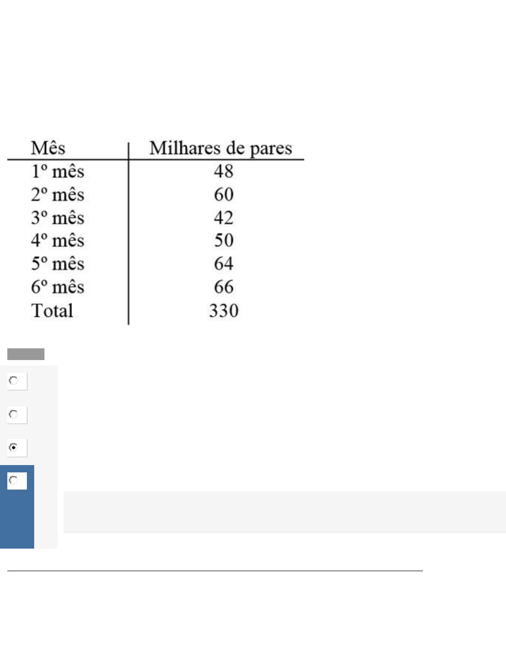 Questão 1/10 - Estatística CASTANHEIRA (2013) “As medidas de posição (ou de tendência central) mais utilizadas são: a média aritmética, a mediana e a moda. As menos utilizadas são: a média geométrica, a média harmônica, a quadrática, a cúbica e a bi quadrática.” O comércio varejista de calçados registrou as seguintes encomendas, em milhares de pares, em uma determinada indústria calçadista, ao longo de um semestre: Podemos afirmar que a média mensal de encomendas é de: Nota: 0.0 A 42 milhares de pares de calçados B 33 milhares de pares de calçados C 50 milhares de pares de calçados D 55 milhares de pares de calçados Para a obtenção da média basta dividir o somatório dos pares vendidos mês a mês pelo total de meses. No caso, 330/6 = 55 milhares de pares de calçados. CASTANHEIRA, N. P.; Estatística Aplicada a todos os níveis. 1° Ed. Curitiba: Intersaberes, 2013, p.59 Questão 2/10 - Estatística CASTANHEIRA (2013) “Para elaborar uma distribuição de frequência, também é necessário conhecer e saber determinar a quantidade de intervalos ou classes. ” Analise as proposições e marque a correta: Um questionário foi aplicado aos dez funcionários do setor de contabilidade de uma empresa, fornecendo os dados apresentados na tabela. Podemos afirmar que: (1) A variável curso é qualitativa ordinal (2) A variável idade é qualitativa ordinal (3) A variável salário é quantitativa continua (4) A variável anos de empresa é quantitativa discreta. (5) A variável curso é qualitativa nominal Estão corretas somente Nota: 0.0 A 1 – 2 – 3 B 3 – 4 – 5 C 2 – 3 – 5 Estão erradas A variável curso é qualitativa ordinal – correta é a qualitativa nominal A variável anos de empresa é quantitativa discreta – correta é quantitativa contínua CASTANHEIRA, N. P.; Estatística Aplicada a todos os níveis. 1° Ed. Curitiba: Intersaberes, 2013, p. 47-48. D 1 – 3 – 4 Questão 3/10 - Estatística Segundo Castanheira (2013) “Os fenômenos estudados em estatística são fenômenos cujo resultado, mesmo em condições normais de experimentação, variam de uma observação para outra, dificultando dessa maneira a previsão de um resultado futuro. Para a explicação desses fenômenos, chamados de aleatórios, adota-se o modelo matemático denominada teoria das probabilidades”. Analise o problema e marque a resposta correta: Joga-se um dado branco e um dado preto. Calcule a probabilidade de ocorrer soma igual a 11. Nota: 0.0 A 5/36 B 1/36 C 1/9 D 1/18 CASTANHEIRA, N. P.; Estatística Aplicada a todos os níveis. 1° Ed. Curitiba: Intersaberes, 2013, p. 137 Questão 4/10 - Estatística Segundo Castanheira (2013) “As medidas de dispersão (ou afastamento) são medidas estatísticas utilizadas para verificar o quanto os valores encontrados em uma pesquisa estão dispersos ou afastados em relação à média ou em relação à mediana. ” Analise as proposições e marque a correta Observe a distribuição abaixo: Podemos afirmar que: Nota: 0.0 A A amplitude total é 10. B O ponto médio da terceira classe é 50 C O total de elementos observados é 24 D A amplitude total é 50. Para a obtenção da amplitude total, basta subtrair o maior valor da classe do menor valor da mesma: 70 – 20 = 50 CASTANHEIRA, N. P.; Estatística Aplicada a todos os níveis. 1° Ed. Curitiba: Intersaberes, 2013, p. 79. Questão 5/10 - Estatística Segundo Castanheira (2013) “Os fenômenos estudados em estatística são fenômenos cujo resultado, mesmo em condições normais de experimentação, variam de uma observação para outra, dificultando dessa maneira a previsão de um resultado futuro. Para a explicação desses fenômenos, chamados de aleatórios, adota-se o modelo matemático denominada teoria das probabilidades”. Analise o problema e marque a resposta correta: Uma urna contém 8 bolas brancas, 7 bolas pretas e 4 bolas verdes. Uma bola é retirada aleatoriamente dessa urna. Calcule a probabilidade de sair uma bola branca. Nota: 0.0 A 8/19 Gabarito Vamos calcular a probabilidade de a bola ter sido branca. Como temos 8 bolas brancas de um total de 19 bolas (8 + 7 + 4), a probabilidade procurada é: P (bola ser branca) = 8/19 CASTANHEIRA, N. P.; Estatística Aplicada a todos os níveis. 1° Ed. Curitiba: Intersaberes, 2013, p. 137 B 7/19 C 4/19 D 11/19 Questão 6/10 - Estatística Segundo Castanheira (2013) “Combinado a experiência e a informação fornecida pela amostra, podemos comumente convenciona a natureza geral da distribuição da população. Essa convenção leva ao que é conhecido como distribuição da probabilidade ou distribuição teóricas” Analise a questão e marque a resposta correta: “Não podem ser listados todos os possíveis valores fracionários da variável e, dessa forma, as probabilidades determinadas por uma função matemática são retratadas, tipicamente, por uma função densidade ou por uma curva de probabilidade.” Refere-se à: Nota: 10.0 A Variável aleatória B Variável aleatória contínua Você acertou! Variável aleatória contínua – Não podem ser listados todos os possíveis valores fracionários da variável e, dessa forma, as probabilidades determinadas por uma função matemática são retratadas, tipicamente, por uma função densidade ou por uma curva de probabilidade. CASTANHEIRA, N. P.; Estatística Aplicada a todos os níveis. 1° Ed. Curitiba: Intersaberes, 2013, p.143 C Variável aleatória discreta D Variável espúria Questão 7/10 - Estatística CASTANHEIRA (2013) “Para elaborar uma distribuição de frequência, também é necessário conhecer e saber determinar a quantidade de intervalos ou classes. ” Analise as proposições e marque a correta: Dada a distribuição de frequências a seguir: Podemos afirmar que o Ponto Médio da quinta classe ou intervalo é: Nota: 0.0 A Pm5 = 5 B Pm5 = 8 C Pm5 =9 Gabarito O ponto médio da 5ª classe é calculado por D Pm5 = 40 Questão 8/10