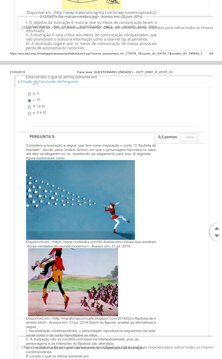 Considere a ilustracao a seguir, que tem como inspiracac o conto "O flautista do Hamelin", escrito pelos Irmaos Grimm, em que personagem hipnotiza os ratos ate eles se afogarem no rio, recebendo um pagamento para isso. A segunda figura ilustra esse conto. Sobre as figuras, analise as afirmativas a seguir. I. Na ilustracao contemporanea o personagem hipnotiza os seguidores da rede social como do conto hipnotizava os ratos. II. A ilustracao nao se constroi com base na intertextualidade, pois as personagens e as intencoes do flautista sao alteradas.
