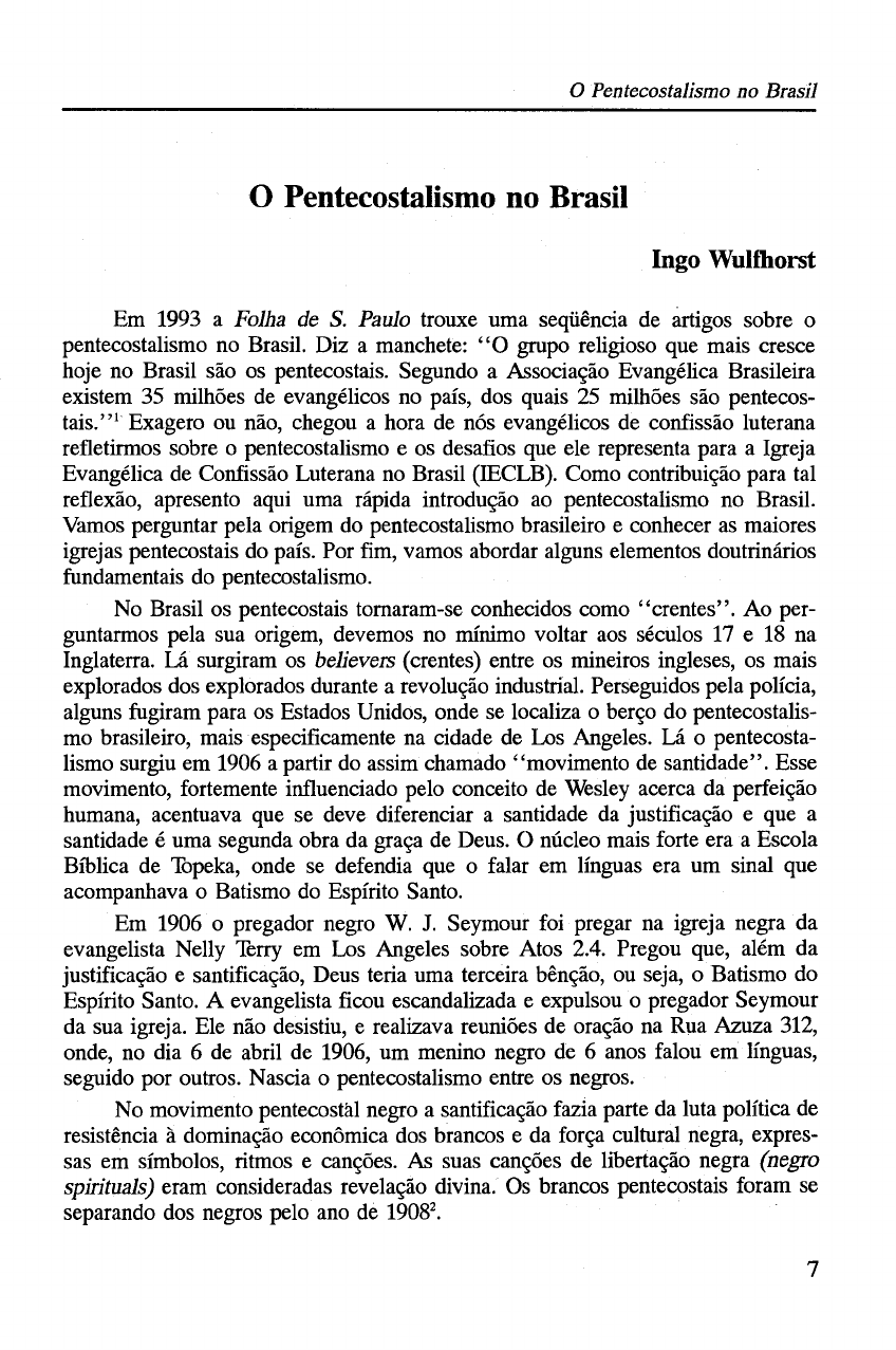 O Pentecostalismo no Brasil O Pentecostalismo no Brasil Ingo Wulfhorst Em 1993 a Folha de S. Paulo trouxe uma seqüência de artigos sobre o pentecostalismo no Brasil. Diz a manchete: “ O grupo religioso que mais cresce hoje no Brasil são os pentecostais. Segundo a Associação Evangélica Brasileira existem 35 milhões de evangélicos no país, dos quais 25 milhões são pentecos tais.” 1 Exagero ou não, chegou a hora de nós evangélicos de confissão luterana refletirmos sobre o pentecostalismo e os desafios que ele representa para a Igreja Evangélica de Confissão Luterana no Brasil (IECLB). Como contribuição para tal reflexão, apresento aqui uma rápida introdução ao pentecostalismo no Brasil. Vamos perguntar pela origem do pentecostalismo brasileiro e conhecer as maiores igrejas pentecostais do país. Por fim, vamos abordar alguns elementos doutrinários fundamentais do pentecostalismo. No Brasil os pentecostais tomaram-se conhecidos como “ crentes” . Ao per guntarmos pela sua origem, devemos no mínimo voltar aos séculos 17 e 18 na Inglaterra. Lá surgiram os believers (crentes) entre os mineiros ingleses, os mais explorados dos explorados durante a revolução industrial. Perseguidos pela polícia, alguns fugiram para os Estados Unidos, onde se localiza o berço do pentecostalis mo brasileiro, mais especificamente na cidade de Los Angeles. Lá o pentecosta lismo surgiu em 1906 a partir do assim chamado “ movimento de santidade” . Esse movimento, fortemente influenciado pelo conceito de Wesley acerca da perfeição humana, acentuava que se deve diferenciar a santidade da justificação e que a santidade é uma segunda obra da graça de Deus. O núcleo mais forte era a Escola Bíblica de Topeka, onde se defendia que o falar em línguas era um sinal que acompanhava o Batismo do Espírito Santo. Em 1906 o pregador negro W. J. Seymour foi pregar na igreja negra da evangelista Nelly Terry em Los Angeles sobre Atos 2.4. Pregou que, além da justificação e santificação, Deus teria uma terceira bênção, ou seja, o Batismo do Espírito Santo. A evangelista ficou escandalizada e expulsou o pregador Seymour da sua igreja. Ele não desistiu, e realizava reuniões de oração na Rua Azuza 312, onde, no dia 6 de abril de 1906, um menino negro de 6 anos falou em línguas, seguido por outros. Nascia o pentecostalismo entre os negros. No movimento pentecostál negro a santificação fazia parte da luta política de resistência à dominação econômica dos brancos e da força cultural negra, expres sas em símbolos, ritmos e canções. As suas canções de libertação negra (negro spirítuals) eram consideradas revelação divina. Os brancos pentecostais foram se separando dos negros pelo ano de 19082. 7 Estudos Teológicos, 35(l):7-20, 1995 Enquanto que para os pentecostais negros Cristo era um Cristo negro dos pobres e oprimidos, também em sua dimensão política, os pentecostais brancos se limitaram à experiência religiosa unicamente voltada para o sagrado, separando a prática religiosa da missão sócio-política3. É nesse pentecostalismo dos brancos nos Estados Unidos que encontramos o berço do pentecostalismo brasileiro. Numa das reuniões pentecostais de Seymour o pastor batista W. H. Durham, de Chicago, estava presente e também falou em línguas. Então levou essa experiência para a sua Igreja em Chicago. Ele ressaltava que a justificação já é o início da santifica ção e que, por conseguinte, o Batismo do Espírito Santo seria a segunda bênção. Reencontramos essa doutrina no pentecostalismo brasileiro, pois na Igreja de Durham em Chicago encontramos o núcleo comum a partir do qual se formariam “ as três vertentes do pentecostalismo brasileiro” : a Assembléia de Deus, a Con gregação Cristã do Brasil e a Igreja Evangélica Quadrangular no Brasil4. 1. Assembléia de Deus Devido a uma profunda recessão econômica existente na Suécia, òs operários suecos Daniel Berg e Gunnar Vingren migraram em 1902 para os Estados Unidos à procura de trabalho e de melhores condições de vida. O batista Daniel converteu- se ao pentecostalismo e participou da Igreja de Durham em Chicago. Mas as Assembléias de Deus aos poucos foram alcançando camadas sociais mais eleva das. Entretanto, a composição de seu quadro de membros continuava se caracteri zando pelas camadas mais populares das cidades e da área rural. Gunnar estudou por quatro anos num seminário batista sueco em Chicago e em 1909 recebeu o Batismo pelo Espírito Santo. Um irmão na fé contou a Daniel e Gunnar uma visão celestial na qual aparecia a palavra “ Para” . Crendo que essa visão seria o chamado para a missão, foram consultar o mapa-mundi e encontraram no mapa do Brasil o estado do Pará. Consideraram este fato como confirmação divina. Procuraram recursos financeiros para a viagem e seguiram para Belém do Pará. Chegaram lá em 1910 e procuraram a Igreja Batista. Não demorou muito e já dirigiam reuniões de oração e de estudo, nas quais ressaltavam o Batismo no Espírito Santo, o falar em línguas e a cura. O pastor batista reagiu de forma contrária a essas idéias e o conflito resultou numa cisão, pois 18 batistas se uniram aos dois missionários suecos e fundaram a primeira Igreja local da Assembléia de Deus em 1911, em Belém. A Assembléia de Deus foi-se propagando pelo nordeste, mas muito devagar para o sul, chegando apenas- em 1927 em São Paulo. Durante o processo de industrialização e urbanização a Assembléia de Deus cresceu muito entre operários de baixa renda, e também na “ explosão” pentecostal a partir da década de 50. Por volta de 1930 cerca de 15.000 pessoas faziam parte da Assembléia de Deus, e hoje ela teria 13 milhões de fiéis, conforme a Associação Evangélica Brasileira (AEVB). O Pentecostalismo no Brasil Não há dúvida de que a Assembléia de Deus cresceu na medida do crescimento da pobreza na periferia das cidades e do cam