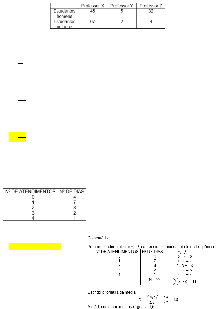 UNIP interativa – Estatística Questionário da Unidade II Pergunta 1 (Enade 2011 – Computação) Em determinado período letivo, cada estudante de um curso universitário tem aulas com um de três professores, esses identificados pelas letras X, Y e Z. As quantidades de estudantes (homens e mulheres) que têm aulas com cada professor é apresentada na tabela de contingência a seguir. A partir do grupo de estudantes desse curso universitário, escolhe-se um estudante ao acaso. Qual é a probabilidade de que esse estudante seja mulher, dado que ele tem aulas apenas com o professor X. a. 61 73 b. 61 155 c. 67 155 d. 22 112 e. 67 112 Pergunta 2 A seguir são apresentadas informações quanto ao número de pessoas atendidas na urgencia no HPS de certa cidade no período de 22 dias. Qual a média de atendimentos? a. Nenhum atendimento. b. 1,5 atendimentos. c. 3 atendimentos. d. 4,5 atendimentos. e. 6 atendimentos Pergunta 3 As informações a seguir indicam o número de acidentes ocorridos com 70 motoristas de uma empresa de ônibus nos últimos 5 anos: Qual é a média de acidentes aproximadamente ocorrida por motorista? a. 2. b. 4. c. 6. d. 8. e. 10. Pergunta 4 As informações a seguir indicam o número de acidentes ocorridos com 70 motoristas de uma empresa de ônibus nos últimos 5 anos: Qual a mediana e a moda de acidentes aproximadamente ocorrida por motorista? a. 𝑀𝑒 = 1 acidente; 𝑀𝑜 = 1 acidente. b. 𝑀𝑒 = 1 acidente; 𝑀𝑜 = 2 acidentes. c. 𝑀𝑒 = 2 acidentes; 𝑀𝑜 = 2 acidentes. d. 𝑀𝑒 = 2 acidentes; 𝑀𝑜 = 3 acidentes. e. 𝑀𝑒 = 3 acidentes; 𝑀𝑜 = 4 acidentes. Pergunta 5 Considere os seguintes resultados relativos a três distribuições de frequência., Foram dadas as seguintes afirmações: I. A distribuição A é assimétrica à esquerda. II. A distribuição B é assimétrica à esquerda. III. A distribuição C é simétrica. Assinale a alternativa com as afirmações corretas. a. I. b. II. c. I e II. d. I e III. e. II e III Pergunta 6 um biologo que estuda uma certa espécie de passaros, estudou o tempo, em dias, que os filhotes levavam para abandonar o ninho. Os dados foram organizados em tabelas e são mostrados a seguir. Se o tempo médio é de 16,4 dias, determine a variância e o desvio padrão. a. s² = 57 dias² e s = 9 dias. b. s² = 67 dias² e s = 7 dias. c. s² = 67 dias² e s = 5 dias. d. s² = 77 dias² e s = 9 dias. e. s² = 77 dias² e s = 7 dias. Pergunta 7 um estudo foi realizado por um professor em três turmas, obetendo a média e o desvio padrão das notas de sua disciplina. Conforme abaixo. Assinale a alternativa correta referente à variabilidade dos dados. a. A turma A possui a menor variabilidade nos dados, pois o CV = 21,25%. b. A turma B possui a menor variabilidade nos dados, pois o CV = 33,85%. c. A turma C possui a menor variabilidade nos dados, pois o CV = 25% d. A turma B possui a maior variabilidade nos dados, pois o CV = 21,25%. e. A turma A possui a maior variabilidade nos dados, pois CV = 33,85%. Pergunta 8 uma distribuidora de refrigerantes fez um levantamento sobre o consumo semanal (em litros) por pessoa, em jan/2002, em uma cidade do litoral, obtendo: Qual é aproximadamente o consumo médio de refrigerantes desde grupo de pessoas? a. 5 litros. b. 4 litros. c. 3 litros. d. 2 litros. e. 1 litro. Pergunta 9 Uma empresa deseja avaliar a distribuição dos salários pagos por hora a seus funcionários. Com os dados coletados foi construída a tabela de distribuição de frequência: Qual é aproximadamente o consumo mediano de refrigerantes deste grupo de pessoas? a. 1 litro. b. 2 litros. c. 3 litros. d. 4 litros. e. 5 litros. Pergunta 10 Uma distribuidora de refrigerantes fez um levantamento sobre o consumo semanal(em litros) por pessoa, em jan/2002, em uma cidade do litoral, obtendo: Qual é o consumo modal de refrigerantes deste grupo de pessoas? a. 0,23 litros. b. 0,74 litros. c. 1,23 litros d. 1,74 litros. e. 2,50 litros.