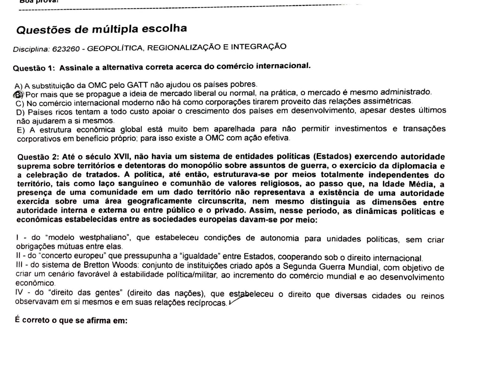 Boa prova! ---------------------------------------------------------------------- ---- - Questões de múltipla escolha Disciplina: 623260 - GEOPOLITICA, REGIONALIZAÇÃO E INTEGRAÇÃO Questão 1: Assinale a alternativa correta acerca do comércio internacional. Al A substituição da OMC pelo GATT não ajudou os países pobres. . . ~ Por mais que se propague a ideia de mercado liberal ou normal, na prática, o mercado é mesmo administrado. e) No comércio internacional moderno não há como corporações tirarem proveito das ~elações assimétricas. . . D) Países ricos tentam a todo custo apoiar o crescimento dos países em desenvolvimento, apesar destes ult1mos não ajudarem a si mesmos. E) A estrutura econômica global está muito bem aparelhada para não permitir investimentos e transações corporativos em benefício próprio; para isso existe a OMC com ação efetiva. Questão 2: Até o século XVII, não havia um sistema de entidades políticas (Estados) exercendo autoridade suprema sobre territórios e detentoras do monopólio sobre assuntos de guerra, o exercício da diplomacia e a celebração de tratados. A política, até então, estruturava-se por meios totalmente independentes do território, tais como laço sanguíneo e comunhão de valores religiosos, ao passo que, na Idade Média, a presença de uma comunidade em um dado território não representava a existência de uma autoridade exercida sobre uma área geograficamente circunscrita, nem mesmo distinguia as dimensões entre autoridade interna e externa ou entre público e o privado. Assim, nesse período, as dinâmicas políticas e econômicas estabelecidas entre as sociedades europeias davam-se por meio: 1 - do "modelo westphaliano", que estabeleceu condições de autonomia para unidades políticas, sem criar obrigações mútuas entre elas. li - do "concerto europeu" que pressupunha a "igualdade" entre Estados, cooperando sob o direito internacional. Ili_ - do sistema_ de Bre~on Woods: -~onjunto ~~ insti~~ições c_riado após a Segunda Guerra Mundial, com objetivo de criar um cenário favoravel à estabilidade poht1ca/m1htar, ao incremento do comércio mundial e ao desenvolvimento econômico. IV - do "direito ?ªs gentes" (direito das nações), que estpbeleceu o direito que diversas cidades ou reinos observavam em s1 mesmos e em suas relações recíprocas. v É correto o que se afirma em: 1 .. 11. apenas B) II . apenas C) Ili. apenas. i 1v, apenas. E) 1 e li, apenas. - - --- - - - - Questão 3: Com referê · · · · afirmativas como corretansc(1Ca) ao per1dodo imediatamente posterior à Segunda Guerra Mundial, avalie as ou erra as (E): 1 - (f) O FMI e o Bird emanaram da Cart d H Woods (1944). a e avana (1947). Por sua vez, o GATT foi criado pelo Acordo de Bretton 2 - (e ) O Congresso dos EUA aprovo t b 1 · · depois evoluiu para a atual Organização uM~ne~a~ d: e~~:eé~~odtc~6~mzação Internacional do Comércio (OIC), que 3 - ((. ) As origens da União Europe· ã · · · após o final da S d G ia . s o provenientes dos movimentos de integração regional da década de 1950 devastados pela ~~~~aª uerra Mundial, quando da necessidade de reconstrução dos países do continente europe~ Assinale a alternativa que apresenta a sequência correta da avaliação. ~ 1E 2C 3E. ~1E 2E 3C. C) 1C 2E 3C. D) 1C 2C 3C. E)1E2C3C. Questão 4: Podemos afirmar que um estudo sistemãtico da dimensão geogrãfica da política se deu a partir: A) Da p~bl!cação das obras de Aristóteles, Maquiavel, Montesquieu e inúmeros outros filósofos da Antiguidade, da lda~_e Media ou da época moderna, que se ocuparam em escrever, por exemplo, sobre a dimensão espacial da pol1tica, por exemplo, a respeito do tamanho e da localização do território, ou a ênfase na importância da geografia ou ainda sobre a localização e a defesa da fortaleza do principe. -.B) De 1945, quando a preocupação dá-se com a chamada escala macro ou continental/planetária, inserida nessa preocupação a questão da disputa do poder mundial, que o Estado é uma grande potência além de qual a melhor estratégia espacial para se atingir esse status. C) De meados dos anos 1970, em que a geopolltica sai do ostracismo e volta a ser novamente estudada agora, como "um campo de estudos", uma área interdisciplinar a exemplo da questão ambiental. D) Da publicaçao das obras do general alemão Karl Haushofer, que acabou por popularizar a geopolítica devido às circunstâncias (ligações, embora problemáticas, com o nazismo e possível contribuição indireta para a obra Mein Kampf, de Hitler), tornando-a tristemente famosa nos anos 1930 e 1940, em especial por meio da sua revista de geopolítica (Zeitschrift für Geopolitik) , editada em Munique, de 1924 a 1944, e com u~a tiragem mensal que começou com 3 mil e chegou a atingir a marca dos 30 mil exemplares, algo ?ast~nte expressivo para a ép~ca. 4) Da publicação da obra Politische Geographie (Geografia Política), de ~nednch Ratzel. Co~ Ratzel, in1c1a-se um estudo sistemático da dimensão geográfica da política, no qual a espac1ahdade ou a terntonahdade do Estado era o principal objeto de preocupações. Questão 5: A respeito do Acordo Geral de Tarifas e Comércio (GATT), é correto afirmar que: A) o mesmo dispõe sobre as infrações na falta de definição do valor de mercadorias/produtos ~ serem exportados _e que servirá de base para a fixação dos preços de carregamento, frete e seguro no mercado interno de cada pais :99~ª~t~~ acordo que se tomou inoperante quando houve a criação da Organização Mundial do Comércio em ' · ·ça A rdo Geral de Tarifas e Comércio (GATT) de 1947. subst1tu1 o ao co d t m·na o do valor de uma mercadoria para fins do cálculo de tarifas e quotas que ~) _Definiu regra_s pa~ ªao \e~ d~ e~abelecimento de direitos anti-dumping, ou de medidas compensatórias. incidam em sua impo ~ç . , t b I os critérios para o Código sobre Normas Técnicas, firmado na Rod
