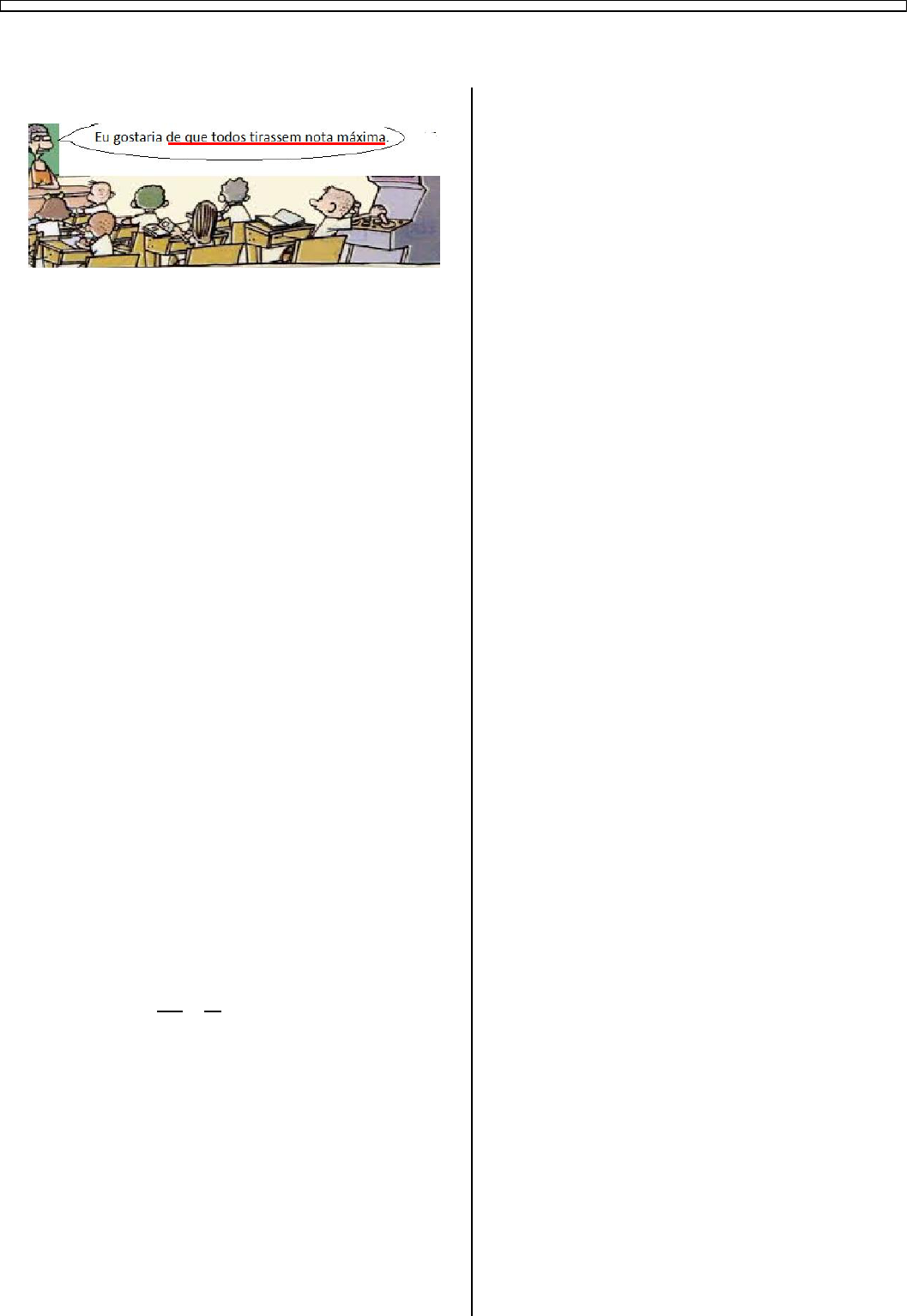 ------------------------------------------------------------------------------------------------------------------------------------ -------------------------------------------------------------------------------------------------------------------------------------- � 01. Leia a Tirinha! a. No período acima, há uma oração subordinada substantiva. Sublinhe-a e classifique-a: 02. Analise as afirmações abaixo e assinale a única afirmação INCORRETA: a. As orações subordinadas são divididas em três grupos, de acordo com a função sintática que exercem, relativa às classes de palavras a que são equivalentes: substantivas, adjetivas e adverbiais. b. Quando há uma relação de dependência sintática entre as orações, afirma-se que se trata de um período composto por coordenação. c. Em gramática, a sintaxe é o campo que estuda a combinação de palavras. d. Quando se fala em dependência sintática é feita referência ao modo como os termos de uma frase ou de uma oração se combinam, cada qual exercendo uma função na organização do período. 03. Nas afirmações seguintes, há somente uma CORRETA. Assinale-a. a. As Orações Subordinadas Substantivas Objetivas Indiretas integram o sentido de um nome, enquanto que as Orações Subordinadas Completivas Nominais integram o sentido de um verbo. b. As Orações Subordinadas Substantivas são assim chamadas porque exercem as mesmas funções sintáticas que o substantivo: sujeito, objeto direto, objeto indireto, complemento nominal, predicativo do sujeito ou aposto. c. As conjunções que e se, que geralmente introduzem a Oração Coordenada Substantiva, são chamadas de integrantes, pois têm o papel de integrar, de completar algum termo da Oração Principal. d. A Oração Subordinada Substantiva Objetiva Direta exercerá a função de sujeito do verbo da Oração Principal. 04. Classifique as orações SUBORDINADAS SUBSTANTIVAS em: OBJETIVA DIRETA OBJETIVA INDIRETA COMPLETIVA NOMINAL SUBJETIVA PREDICATIVA APOSITIVA a.( ) Desejo uma coisa: que você seja feliz. b.( ) O importante é que todos manifestem a própria opinião. c.( ) Os homens sempre se esquecem de que somos todos mortais. d.( ) Havia dúvida de que o fato era verdadeiro. e.( ) Ele sempre quer a mesma coisa: que sua presença seja notada. f.( ) É gozado que você esteja me avaliando. g.( ) É sabido que esta é a melhor solução. h.( ) Ele comunicou que partiria. i.( ) Faço votos de que a terra seja preservada. j.( ) Só lhe imponho uma condição: que respeite o horário. k.( ) Estou esperançoso de que tudo se resolva. l.( ) É necessário que ele volte. m.( ) Todos precisamos de que alguém nos escute. n.( ) O fato é que ninguém faz mágica. o.( ) Ele comunicou que partiria mais tarde.. � � � � � ______________________________ Digitação: Professor Deivis Luís André � PAGE �1�