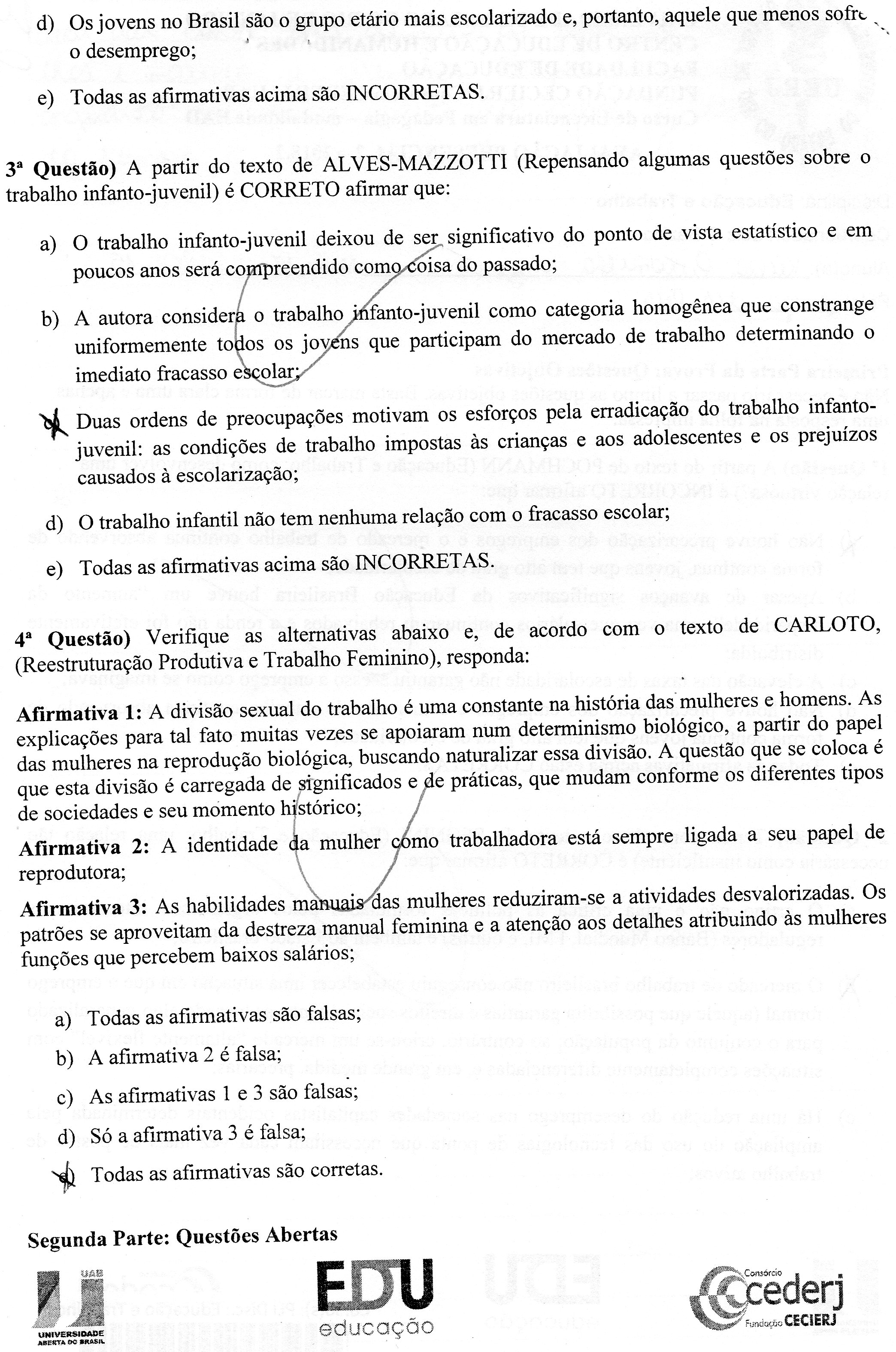 A partir do texto de ALVES-MAZZOTT] (Repensando algumas questoes sobre trabalho infanto-juvenil) e CORRETO afirmar que: a) O trabalho infanto-juvenil deixou de ser significativo do ponto de vista estatistico e em poucos anos sera compreendido comocoisa do passado; b) A autora considera trabalho infanto-juvenil como categoria homogenea que constrange uniformemente todos OS jovens que participam do mercado de trabalho determinando imediato fracasso escolar; c) Duas ordens de preocupacoes motivam OS esforcos pela erradicacao do trabalho infanto- juvenil: as condicoes de trabalho impostas as criancas e aos adolescentes e OS prejuizos causados a escolarizacao; d) O trabalho infantil nao tem nenhuma relacao com O fracasso escolar; e) Todas as afirmativas acima sao INCORRETAS.