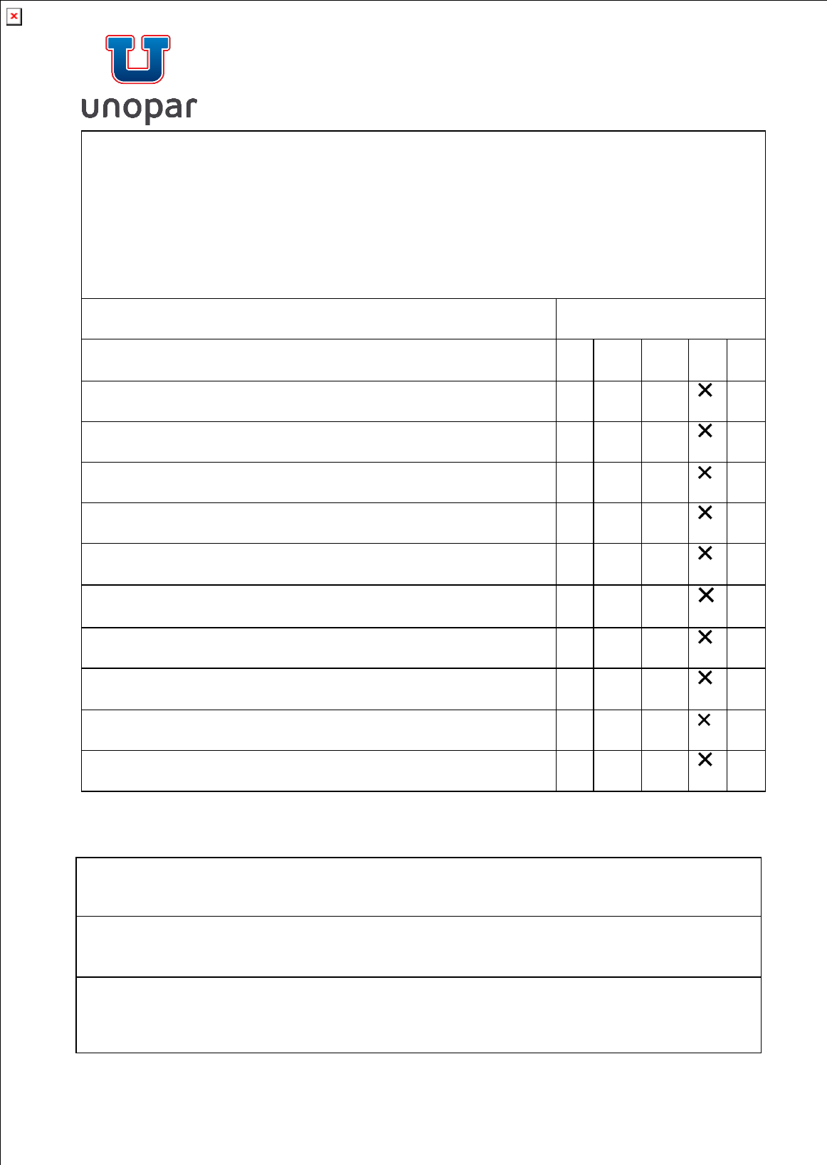 FICHA DE AVALIAÇÃO: REGÊNCIA Estagiário(a): Lucinéia Balmant Semestre: 5° Professor Regente: Maria Helena Da Cruz Escola:Creche Escola Criança Feliz Nível: Maternal 02 Turno: Matutino Educação infantil Número total de aulas ministradas pelo estagiário: 06 aulas de 04 horas cada Datas das aulas ministradas: 04/10/18 09/10/18 10/10/18 16/10/18 17/10/18 18/10/18 Tema desenvolvido: Trabalhando as cores, Alimentação saudável, Coordenação motora fina, Pintando e reciclando, Formas geométricas, conhecendo os números. Critérios para Apreciação das Aulas Conceitos EX MB B S IN Clareza e relevância dos objetivos. Conhecimento do conteúdo aplicado. Transmissão verbal e escrita das informações ao nível da compreensão dos alunos. Variedade de atividades/atividades adequadas/andamento das atividades. Recursos materiais adequados (mapas, filmes, músicas, imagens, textos...) ao assunto abordado. Interação entre professor e alunos. Dicção (pronúncia correta, clara, fluente). Manejo de classe, disciplina, engajamento (inclusive quando surgem situações imprevistas). Organização sequencial de atividades (inclusive com a estimativa de tempo). Postura coerente com a que se espera de um futuro profissional da área. _____________________________________________________ Estagiário(a) (nome e assinatura) ______________________________________________________ Professor regente (nome e assinatura) ________________________________________________________________ Tutor Presencial (nome e assinatura) _____________________ ________________________ Assinatura do Tutor Presencial Assinatura do Diretor da Escola Carimbo da Escola