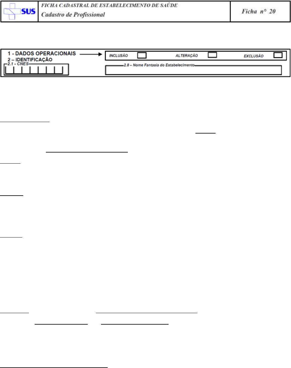 CNES Cadastro Nacional de Estabelecimentos de Saúde ________________________________________________________________________________________________________ Instruções de Preenchimento – CNES – Ficha 19 – Atualizado em dezembro/2013 Pág. 1 de 16 INSTRUÇÕES DE PREENCHIMENTO – Ficha nº 20 – Cadastro de Profissional 1 – DADOS OPERACIONAIS/ 2 – IDENTIFICAÇÃO 1 – DADOS OPERACIONAIS: Dados Operacionais Marcar com um X o quadro ao qual se refere a ação sinalizada. Esta informação se repete em praticamente todas as folhas de Cadastro e com exceção da folha referente ao cadastro de profissional, onde as opções Inclusão, Alteração e Exclusão se referem a ele, enquanto nas demais se refere ao estabelecimento e não pode ser entregue em branco. Inclusão quando a folha se referir ao cadastro de um novo estabelecimento. Neste caso o campo 2.1 – CNES deverá ser mantido em branco, pois não existe ainda código para aquele estabelecimento. Alteração quando a folha se referir a alteração, acréscimo ou subtração de informações de um estabelecimento já cadastrado. Neste caso os campos 2.1 – CNES e 2.8 – Nome Fantasia do Estabelecimento deverão ser preenchidos com o código do estabelecimento. Exclusão quando a folha se referir a exclusão de um estabelecimento já cadastrado, quer seja por fechamento, dissolução ou motivo similar. Neste caso os campos 2.1 – CNES e 2.8 – Nome Fantasia do Estabelecimento deverão ser preenchidos com o código do estabelecimento. 2 – IDENTIFICAÇÃO: 2.1 – CNES Este campo deverá ser mantido em branco nos casos de inclusão de um estabelecimento. Nos casos de alteração ou exclusão, seu preenchimento é obrigatório. O número CNES de um estabelecimento será obtido somente após a digitação de seus dados com sucesso gerado na sua consistência e envio ao Ministério da Saúde. 2.8 – Nome Fantasia do Estabelecimento Deve ser preenchido com o nome pelo qual o estabelecimento é conhecido. Caso se trate de pessoa física, o nome do profissional será também utilizado como Nome Fantasia. CNES Cadastro Nacional de Estabelecimentos de Saúde ________________________________________________________________________________________________________ Instruções de Preenchimento – CNES – Ficha 19 – Atualizado em dezembro/2013 Pág. 2 de 16 34 – DADOS DO PROFISSIONAL: Cadastramento SUS/ NÃO SUS Em primeiro lugar, nesta folha deve ser identificado assinalando com um X, se o profissional atende ou não ao SUS, NESTE ESTABELECIMENTO. (Para que o profissional atenda pacientes pelo SUS no local, é necessário que exista um contrato ou convênio entre o referido estabelecimento e o SUS). Caso o profissional figure como terceiro de estabelecimento que possua contrato com o SUS, tais como outros hospitais, não deve constar como SUS, pois é um acordo entre instituições. Para o preenchimento dos dados seguintes, são importantes algumas considerações: O preenchimento adequado dos campos proporciona a geração do Nº do Cartão Nacional de Saúde (CNS), o qual é individual e não deve ser confundido com o Nº do Cadastro Nacional de Estabelecimentos de Saúde (CNES), mas apenas para os profissionais que atuam pelo SUS; Para todos os profissionais, tanto aqueles que prestam atendimento pelos SUS nos estabelecimentos, como também aqueles que não têm contrato e/ou convênio SUS, deverá ser preenchida a ficha completa, sendo possível a não informação apenas dos seguintes campos: PIS/PASEP, Número de CNS, Dados de Certidão (caso preencha os dados completos do RG), Dados de RG (caso preencha os dados completos de alguma Certidão – Nascimento, Casamento ou Divórcio), Informações do Título de Eleitor, Dados da CTPS – Carteira de Trabalho e Previdência Social e os Bancários. É obrigatório preenchimento dos seguintes campos: Nome do Profissional (Completo e sem abreviaturas); CPF (CIC); Sexo; Nome da Mãe; Data de Nascimento; Dados completos de Identidade (R.G.), ou seja, Número, UF, Órgão Emissor e Data de Emissão ou os dados completos de uma Certidão (Nascimento, Casamento ou Divórcio), com Tipo, Nome do Cartório, Livro, Folhas, Termo e Data de Emissão; Nacionalidade; Escolaridade; Endereço; UF do Conselho de Classe (Unidade da Federação); Registro no Conselho de Classe (Nº de Inscrição no Conselho); Órgão Emissor (do Registro de Classe acima referido); Vinculação (Vínculo do Profissional com o estabelecimento em questão, com Tipo e Subtipo – pode haver mais de um tipo de vínculo com o mesmo estabelecimento, devendo ser feita mais de uma vinculação ao estabelecimento neste caso); Carga Horária (apenas a que se refere ao estabelecimento em questão, em horas semanais); Especialidade (CBO – Código Brasileiro de Ocupações e Descrição – pode o profissional atuar em mais de uma especialidade no estabelecimento, dividindo as cargas horárias na informação de vinculação); Data de Entrada – data em que o profissional iniciou suas atividades no estabelecimento em questão. CNES Cadastro Nacional de Estabelecimentos de Saúde ________________________________________________________________________________________________________ Instruções de Preenchimento – CNES – Ficha 19 – Atualizado em dezembro/2013 Pág. 3 de 16 34.1 – Dados de Identificação: 34.1.1 – Nome do Profissional Nome Completo por extenso, não Abreviar. Caso o nome tenha mais que 70 caracteres, abreviar o suficiente para que caiba nas 70 posições do campo no formulário. Evitar abreviar o primeiro, o segundo e o último nome. Campo de preenchimento obrigatório para todos os profissionais. 34.1.2 – PIS/ PASEP Número do cadastro do trabalhador privado no PIS (Programa de Integração Social) ou público no PASEP (Programa de Formação do Patrimônio do Servidor Público) não separando o dígito verificador – ex.: 12345678911. 34.1.3 – CPF Número do CPF (Cadastro de Pessoas