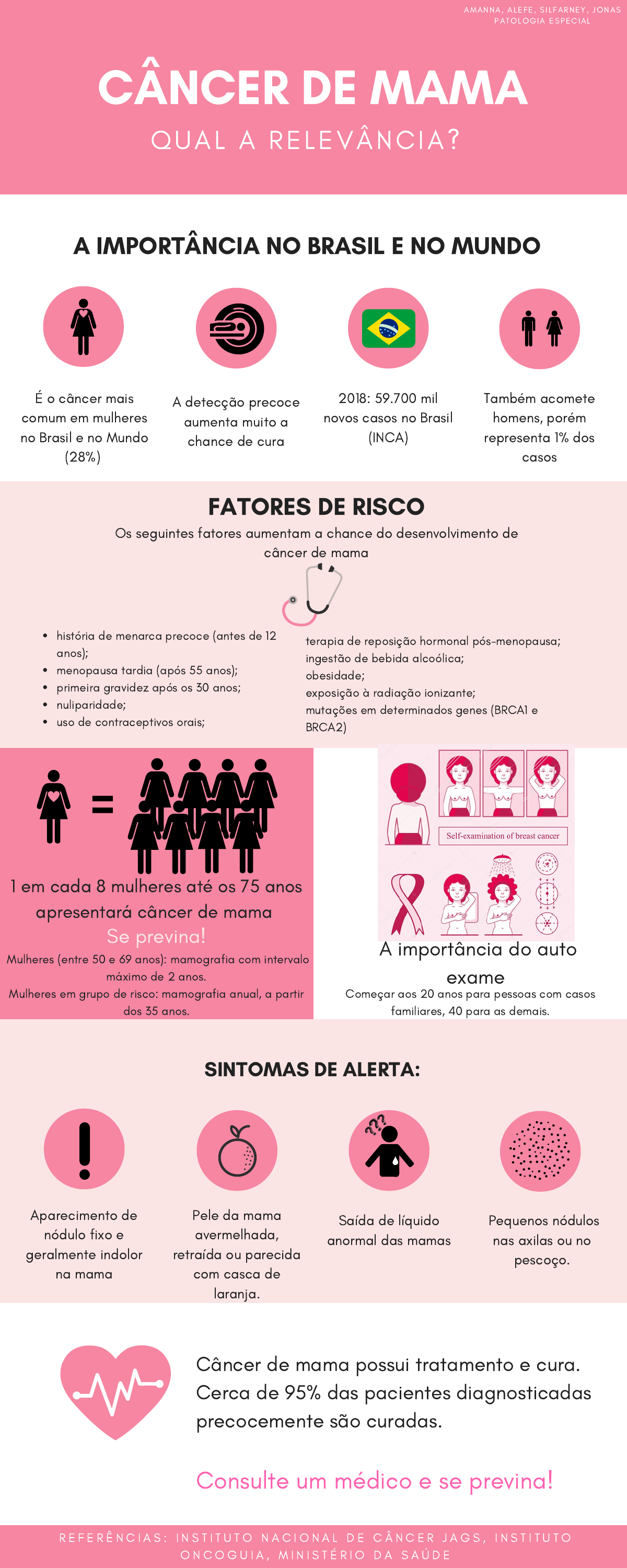 QUAL A RELEVÂNCIA? CÂNCER DE MAMA A IMPORTÂNCIA NO BRASIL E NO MUNDO Câncer de mama possui tratamento e cura. Cerca de 95% das pacientes diagnosticadas precocemente são curadas. história de menarca precoce (antes de 12 anos); menopausa tardia (após 55 anos); primeira gravidez após os 30 anos; nuliparidade; uso de contraceptivos orais; 1 em cada 8 mulheres até os 75 anos apresentará câncer de mama = A importância do auto exame É o câncer mais comum em mulheres no Brasil e no Mundo (28%) Também acomete homens, porém representa 1% dos casos A detecção precoce aumenta muito a chance de cura 2018: 59.700 mil novos casos no Brasil (INCA) SINTOMAS DE ALERTA: Aparecimento de nódulo fixo e geralmente indolor na mama Pele da mama avermelhada, retraída ou parecida com casca de laranja. Pequenos nódulos nas axilas ou no pescoço. Saída de líquido anormal das mamas R E F E R Ê N C I A S : I N S T I T U T O N A C I O N A L D E C Â N C E R J A G S , I N S T I T U T O O N C O G U I A , M I N I S T É R I O D A S A Ú D E FATORES DE RISCO Os seguintes fatores aumentam a chance do desenvolvimento de câncer de mama terapia de reposição hormonal pós-menopausa; ingestão de bebida alcoólica; obesidade; exposição à radiação ionizante; mutações em determinados genes (BRCA1 e BRCA2) Começar aos 20 anos para pessoas com casos familiares, 40 para as demais. Mulheres (entre 50 e 69 anos): mamografia com intervalo máximo de 2 anos. Mulheres em grupo de risco: mamografia anual, a partir dos 35 anos. Consulte um médico e se previna! Se previna! AMANNA, ALEFE , S I LFARNEY, JONAS PATOLOGIA ESPECIAL