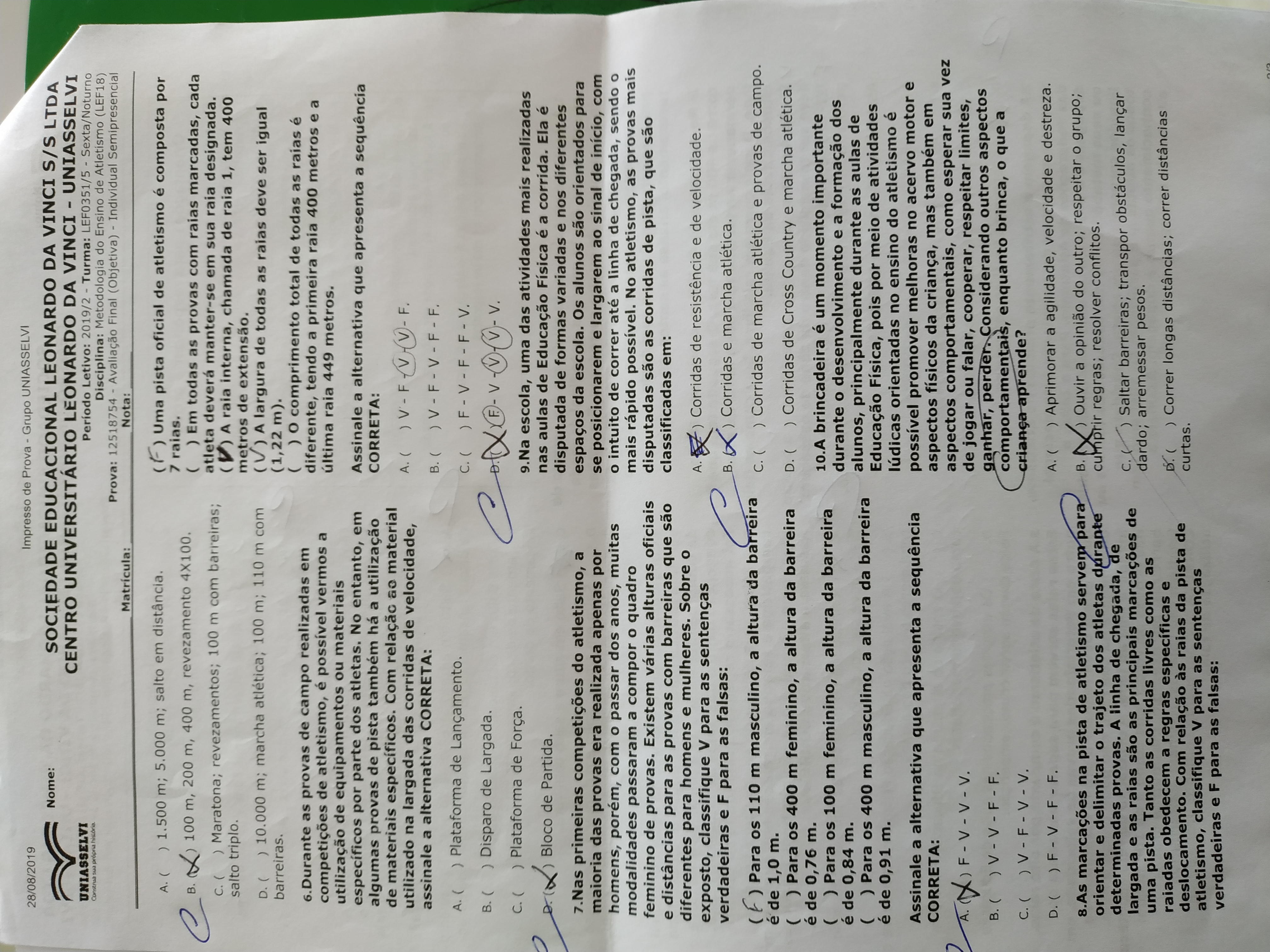 Na escola, uma das atividades mais realizadas nas aulas de Educacao Fisica e a corrida. Ela e disputada de formas variadas e nos diferentes espagos da escola. Sobre exposto, classifique V para as sentencas verdadeiras e F para as falsas: Para 110 m masculino, a altura da barreira e de 1,0 m. Para 400 m feminino, a altura da barreira e de 0,76 m. Para 100 m feminino, a altura da barreira e de 0,84 m. Para 400 m masculino, a altura da barreira e de 0,91 m.
