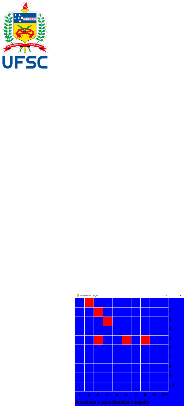 Universidade Federal de Santa Catarina - UFSC Campus Araranguá Centro de Ciências, Tecnologias e Saúde - CTS Departamento de Computação - DEC Disciplina: DEC7558 – Sistemas Distribuídos Turma: 07655 Alunos: Nathan Vieira Marcelino, Vinicius Camozzato Vaz, Willer Lucas Barata Castanheti Relatório: Batalha naval em sistema Distribuído Objetivo O trabalho proposto foi o de construção de um sistema distribuído para a aplicação de um jogo de batalha naval, composto por três elementos: um servidor, e dois cliente, cada qual podendo ser executado em uma máquina distinta na rede. O projeto foi desenvolvido em linguagem de programação Python utilizando protocolo TCP de comunicação. Todos os softwares e bibliotecas necessárias para a correta execução do programa estão detalhados no final deste documento. Descrição O jogo assim como um jogo de batalha naval convencional consiste em dois tabuleiro, um para cada jogador, onde os jogadores estabelecem as posições de seis navios em uma matriz 10 por 10, e tentam “acertar” o navio do inimigo através de chutes aleatórios de coordenadas referentes a posição no tabuleiro do rival. Quem acertar a posição de todos os navios inimigos primeiro ganha o jogo. Desenvolvimento do ambiente gráfico do cliente Com o uso da biblioteca Pygame, construímos uma interface onde o jogador pode interagir com o mouse para selecionar onde ele quer posicionar o seu navio. Cada posição escolhida é marcada em vermelho, e quando todas as seis posições já estiverem sido definidas, o jogador pode digitar F para que a matriz gerada seja enviada ao servidor Caso o jogador decida trocar um navio de posição, basta que ele selecione algum previamente estabelecido para que aquela posição seja limpa e ele tenha direito a reposição. Se ele tentar colocar mais de 6 navios no mapa, o sistema retorna uma mensagem de erro. Quando tudo estiver certo e as posições forem finalizadas, a mensagem de aguarde irá aparecer. Então, o cliente enviará ao servidor uma matriz 10x10 onde cada posição com navio terá seu elemento definido em -1 e todos os demais elementos definidos em 1. No final do relatório, logo após as considerações finais, consta um exemplo de execução. Programação da entidade Servidor Para o início do projeto do servidor, é necessários importar a biblioteca socket responsável pela comunicação entre dois processos. Além a biblioteca socket, utilizamos a biblioteca NumPy para que fosse possível realizar operações com arrays multidimencionais, no caso da nossa aplicação: a matriz contendo as informações de posição de cada barco/alvo do tabuleiro. A biblioteca threading é importada para que seja possível a comunicação com os dois clientes (jogadores) simultaneamente. Após todas a bibliotecas necessárias serem definidas, é iniciada a criação do socket e seus parâmetros de IP e porta do servidor. Quando o socket é criado, utilizamos o parâmetro socket.AF_INET para definir o tipo de família de endereço que será permitido na comunicação entre as entidades para o tipo IPv4, e o parâmetro socket.SOCK_STREAM para definir o protocolo de comunicação TCP. Agora que o socket está finalmente criado, é utilizado a função bind() para definir um relacionamento entre o socket criado e o endereço estabelecido para que seja possível verificar a disponibilidade do endereço e da porta A função listen() é utilizada para deixar o socket em modo passivo, “escutando” as conexões realizadas, e nela é passado um parâmetro de modo a definir o número máximo de conexões enfileiradas permitidas: dois clientes. Um socket setado em modo passivo é chamado informalmente de servidor. Programação da entidade Cliente Na programação do cliente, é necessário setar o endereço e porta onde o servidor está sendo executado Então, é verificada e estabelecida a conexão com o servidor através do código abaixo. Se tudo estiver correto, a função s.connect() cria a conexão client-servidor possibilitando existir a troca de mensagens O cliente por fim envia uma mensagem confirmando a conexão ao dest, nosso servidor. A mensagem antes de ser enviada precisa ser convertida de padrão Unicode para bytes, e para isso utilizamos a função encode() Estabelecendo a comunicação clientes-servidor O servidor utiliza threads para que seja possível gerenciar a conexão e a troca de mensagens de dois clientes simultâneamente Quando um cliente escolhe a posição de todos os navios no grid descrito no item 3 deste relatório, ele envia a matriz codificada em bytes ao servidor. Cliente enviando a matriz de posições para o servidor O servidor recebe a matriz codificada e atribui um número de conexão ao cliente, e fica aguardando a entrada de uma nova matriz referente ao segundo jogador para que seja possível iniciar o jogo servidor recebendo a matriz posição do cliente 1 O segundo jogador faz o mesmo procedimento que o primeiro e envia para o servidor servidor recebendo a matriz posição do cliente 2 No código abaixo é possível entender como o servidor define o número da conexão e como ele cria os threads Basicamente, ele executa um loop até que haja dois jogadores conectados. Para cada jogador que entra, o contador Connection_Numb é incrementado. Quando o contador for igual a zero, significa que nenhum cliente realizou a conexão. A partir do momento em que o primeiro cliente faz uma conexão, o servidor executa a função threading.Thread() que tem como parâmetro target a função client_thread do código (linha 43, server.py) Quando um segundo cliente estabelecer conexão, o loop cria o ultimo thread e é finalizado. Agora o servidor possui as duas matrizes com as posições dos navios de cada cliente/jogador. Resultados e dificuldades Devido a falta de experiência do grupo com a linguagem Python, muitos problemas surgiram durante a execução do trabalho, o que resultou em horas perdidas nas 