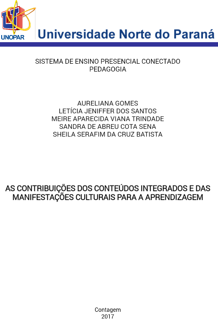 Sistema de Ensino Presencial Conectado PEDAGOGIA AURELIANA GOMES LETÍCIA JENIFFER DOS SANTOS MEIRE APARECIDA VIANA TRINDADE SANDRA DE ABREU COTA SENA SHEILA SERAFIM DA CRUZ BATISTA AS CONTRIBUIÇÕES DOS CONTEÚDOS INTEGRADOS E DAS MANIFESTAÇÕES CULTURAIS PARA A APRENDIZAGEM Contagem 2017 AURELIANA GOMES LETÍCIA JENIFFER DOS SANTOS MEIRE APARECIDA VIANA TRINDADE SANDRA DE ABREU COTA SENA SHEILA SERAFIM DA CRUZ BATISTA AS CONTRIBUIÇÕES DOS CONTEÚDOS INTEGRADOS E DAS MANIFESTAÇÕES CULTURAIS PARA A APRENDIZAGEM Trabalho de Pedagogia apresentado à Universidade Norte do Paraná - UNOPAR, como requisito parcial para a obtenção de média bimestral nas disciplinas de Alfabetização e Letramento; Literatura Infanto-juvenil; Ensino de Matemática na Educação Infantil; Ensino de Natureza e Sociedade na Educação Infantil; Seminário Interdisciplinar V. Orientador: Adriana Haruyoshi Biason, Alessandra Negrini Dalla Barba, Diego Fogaça Carvalho, Edilaine Vagula, Mari Clair Moro, Maurílio Cristiano Batista Bergamo, Natália Gomes dos Santos e Tatiane Mota Santos Jardim. Contagem 2017 SUMÁRIO INTRODUÇÃO De acordo com o RCNEI, existem seis eixos temáticos para se trabalhar com as crianças até os cinco anos de idade, são eles: movimento, música, artes visuais, linguagem oral e escrita, matemática, identidade e autonomia, natureza e sociedade. O ensino de ciências naturais deve estar presente na ministração dos conteúdos, a fim de promover interação com o cotidiano e a sala de aula. Com isto o presente trabalho tem o objetivo de apresentar a importância da integração dos conteúdos como uma estratégia para a realização das intermediações que possibilitam a construção do conhecimento e da aprendizagem de forma significativa e mostrar que as habilidades e competências para o aprendizado podem se desenvolverem de maneira lúdica e prazerosa para as crianças. DESENVOLVIMENTO Segundo o RCNEI, o desenvolvimento integral da criança consiste em: promover a integração entre os aspectos físicos, emocionais, afetivos, cognitivos e sociais. A criança é considerada um sujeito complexo, por isso, os fatores que compreendem o seu desenvolvimento não podem ser concebidos e trabalhados fragmentadamente. O documento aborda os objetivos gerais para a Educação Infantil, os quais visam o desenvolvimento de aspectos internos (cognitivo, moral, emocional, psicológico, afetivo, físico, dentro outros) e externos (sociais, construção e compreensão de símbolos, dentre outros), da criança. A interação dos conteúdos na área do conhecimento é o que contribui para a aprendizagem do aluno, por isso é uma das propostas apresentadas pelos PCN’s (Parâmetros Curriculares Nacionais). O professor deve buscar interagir diferentes disciplinas, valorizando assim cada vez mais o processo de aprendizagem, trabalhando com conteúdos que pretendem oferecer um repertório que possa auxiliar o desenvolvimento das capacidades e habilidades da criança. No entanto, considerando as características particulares de cada grupo e suas necessidades, cabe ao professor selecioná-los e adequá-los de forma que sejam significativos para as crianças. É importante também, que o professor considere as possibilidades que os conteúdos oferecem para o avanço do processo de aprendizagem e para ampliação de conhecimento, estes devem ser trabalhados de forma integrada relacionados entre si. As ciências naturais hoje, é uma das mais diversas formas de interagir o aluno, professor e cotidiano. Por isso o professor deve ser capaz de inovar, variar suas técnicas de ensinar, buscando ter um bom relacionamento com as crianças. É nesse sentido que se busca instruir a nova prática curricular, produzindo uma nova vivência social na qual os conhecimentos das ciências venham a fazer parte de novas formas de interlocução, interpretação e ação, valorizando relações com o dia-a-dia fora da escola. Na educação infantil, se promove experiências significativas de aprendizagem da língua, por meio da linguagem oral e escrita, relaciona se o desenvolvimento gradativo das capacidades associadas a competências linguísticas: Falar, ler e escrever. O meio em que as crianças vivem é um conjunto de fenômenos naturais e sociais, no qual elas necessitam ser curiosas e investigativas. Desde muito pequenas elas questionam, sempre procurando uma resposta para tudo. A natureza e a sociedade reúnem os temas sobre o natural e o social, fazendo com que ocorra interação de diferentes abordagens no campo das ciências humanas e naturais. A criança é capaz de refletir sobre o mundo de formas diferentes de acordo com o seu desenvolvimento. A medida em que se desenvolvem, elas questionam, organizam, até criarem “sua visão sobre o mundo”. Até ter a habilidade por exemplo de brincar de “faz de conta”, onde a criança consegue criar um mundo da sua forma e visão, daí ela passa a compreender melhor o mundo e a sociedade. A matemática por sua vez é o universo que está presente na vida da criança desde o início de tudo, pois elas participam de uma série de situações envolvendo números, relações entre quantidades, noções sobre espaço, tamanho, números. As crianças recorrem a matemática por seus próprios recursos, na contagem para conferir a idade nos dedos, ou até mesmo repartir uma bala com o colega. O trabalho com noções matemáticas na educação infantil atende, por um lado, às necessidades das próprias crianças de construírem conhecimentos que incidam nos mais variados domínios do pensamento; por outro, corresponde a uma necessidade social de instrumentalizá-las melhor para viver, participar e compreender um mundo que exige diferentes conhecimentos e habilidades. Essa interação é muito importante, pois garante a motivação dos educandos, sendo necessário a ministração das aulas de forma dinâmica e inovadora, fazendo com que o trabalho pedagógico se torne din