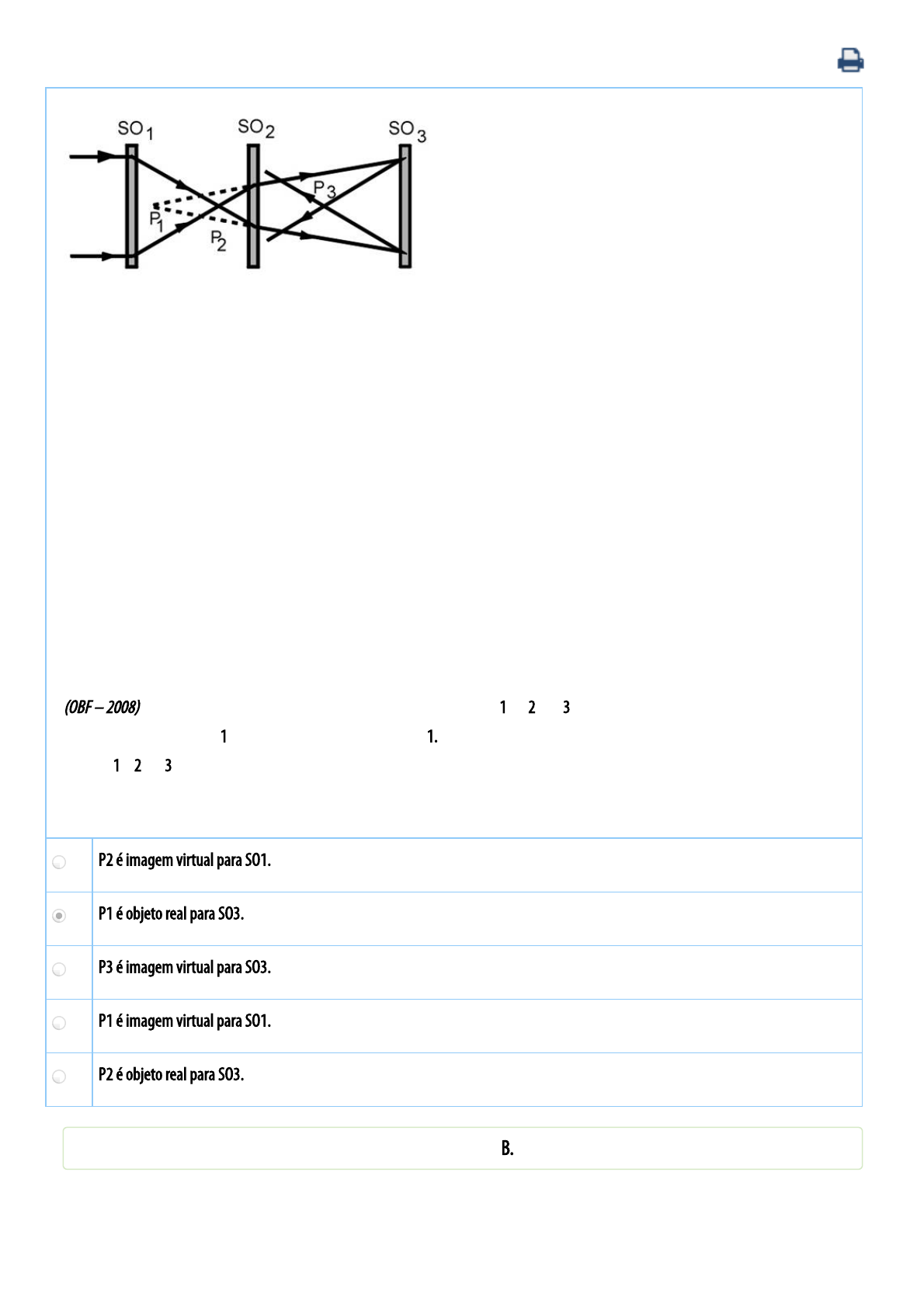 09/12/2018 Universidade Paulista - UNIP : Disciplina On-line. https://www.unip.br/presencial/central/Interna.aspx 1/1 (OBF – 2008)(OBF – 2008) O esquema representa um conjunto de três sistemas ópticos SO11, SO2 2 e SO33. Raios luminosos originários de um ponto impróprio à esquerda de SO1 1 incidem no conjunto a partir de SO1. 1. Analisando a propagação desses raios luminosos no conjunto e os pontos P11, P2 2 e, P33, que correspondem às intersecções, ou dos raios luminosos ou de prolongamentos destes raios, podemos a�rmar corretamente que: A P2 é imagem virtual para SOP2 é imagem virtual para SO11.. B P1 é objeto real para SOP1 é objeto real para SO33.. C P3 é imagem virtual para SOP3 é imagem virtual para SO33.. D P1 é imagem virtual para SOP1 é imagem virtual para SO11.. E P2 é objeto real para SOP2 é objeto real para SO33.. Você já respondeu e acertou esse exercício. A resposta correta é: B.B.