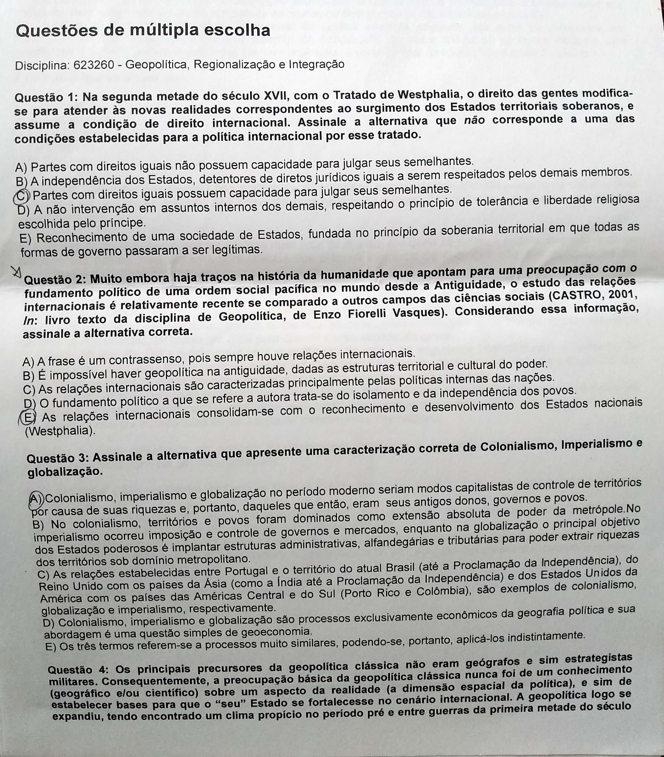 Muito embora haja tracos na historia da humanidade que apontam para uma preocupagao com fundamento politico de uma ordem social pacifica no mundo desde a Antiguidade, estudo das relacoes internacionais e relativamente recente se comparado a outros campos das ciencias sociais (CASTRO, 2001, In: livro texto da disciplina de Geopolitica, de Enzo Fiorelli Vasques). Considerando essa informacao, assinale a alternativa correta. A) A frase e um contrassenso, pois sempre houve relacoes internacionais. B) E impossive haver geopolitica na antiguidade, dadas as estruturas territoria e cultural do poder. C) As relacoes internacionais sao caracterizadas principalmente pelas politicas internas das nacoes. D) O fundamento politico a que se refere a autora trata-se do isolamento e da independencia dos povos. E) As relacoes internacionais consolidam-se com O reconhecimento e desenvolvimento dos Estados nacionais (Westphalia).