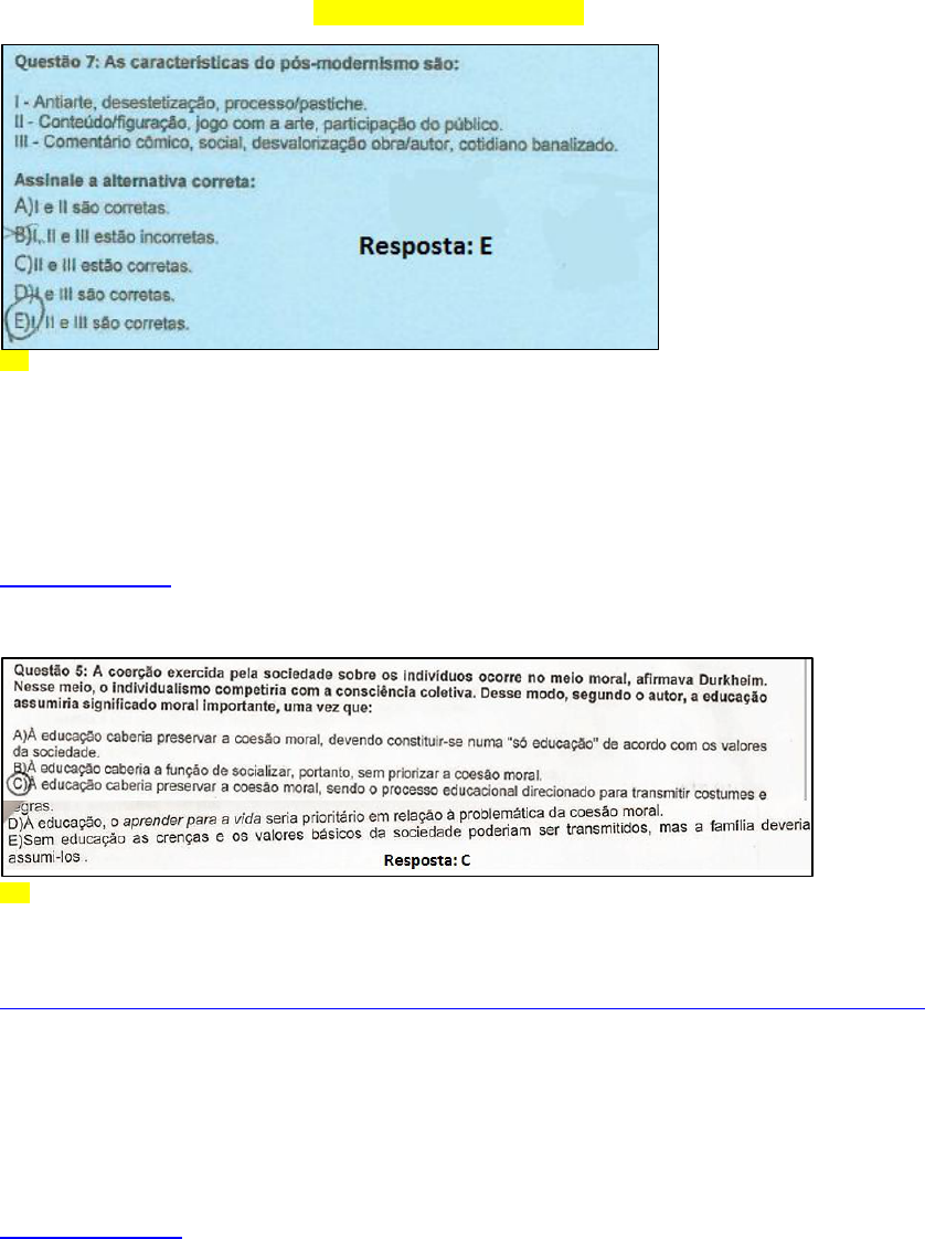 Apanhado de Sociologia e Educação – 657060 de acordo com as provas 01: As características do pós-modernismo são: I- Antiarte, desestetização, processo/pastiche. II- Conteúdo/figuração, jogo com a arte, participação do público. III-Comentário cômico, social, desvalorização obra/autor, cotidiano banalizado. Assinale a alternativa correta: A) I e II são corretas. B) I, II e III estão corretas. C) I e III são corretas. D) I e III são corretas. E) I, II e III são corretas. 02: A coerção exercida pela sociedade sobre os indivíduos ocorre no meio moral, afirmava Durkheim. Nesse meio, o individualismo competiria com a consciência coletiva. Desse modo, segundo o autor, a educação assumiria significado moral importante, uma vez que: A) À educação caberia preservar a coesão moral, devendo constituir-se numa “só educação” de acordo com os valores da sociedade. B) À educação caberia a função de socializar, portanto, sem priorizar a coesão moral. C) À educação caberia preservar a coesão moral, sendo o processo educacional direcionado para transmitir costumes e regras. D) À educação, o aprender para a vida seria prioritário em relação à problemática da coesão moral. E) Sem educação as crenças e os valores básicos da sociedade poderiam ser transmitidos, mas a família deveria assumi-los . 03: As consequências da rápida industrialização e urbanização levada a cabo pelo sistema capitalista na Inglaterra foram tão visíveis quanto trágicas: aumento assustador da prostituição, do suicídio, do alcoolismo, do infanticídio, da criminalidade, da violência, de surtos de epidemia de tifo e cólera que dizimaram parte da população. A partir do texto anterior, podemos afirmar que esse fenômeno favoreceu o surgimento: A)Da burguesia assalariada. B)Do operariado urbano. C)De servos voluntários. D)Do campesinato. E)Da elite política. 04: As discussões em torno de redemocratização da sociedade brasileira, no período que sucedeu o regime de Ditadura Militar (1964-1984); fez emergir debates em torno da também necessária democratização da escola, contexto no qual surgiram defesas a respeito da construção do projeto político-pedagógico (PPP). A elaboração do projeto político-pedagógico é um processo de consolidação da democracia e da autonomia da escola, com vistas à construção de sua identidade. É uma ação intencional, com um compromisso definido coletivamente, que reflete a realidade, busca a superação do presente e aponta as possibilidades para o futuro. O projeto político-pedagógico é um documento que não se reduz à dimensão didático-pedagógica. Nesse sentido, constitui-se como: A) Instrumento legitimador das ações normativas da equipe gestora. B) desenvolvimento de ações espontâneas da comunidade escolar. C) Definição de princípios e diretrizes que protejam o vir a ser da escola. D) Incorporação de múltiplas teorias pedagógicas, produzidas na contemporaneidade. E) Implementação de estrutura organizacional visando á administração interna da escola. 05: A economia e a produção na pós-modernidade estão relacionadas às seguintes ideias: I - A programação da produção, do consumo e da vida social significa projetar o comportamento a partir de informações prévias. II - O objetivo é aumentar a performance (desempenho), o desempenho. III - Necessidade de produzir mais e mais rápido, em todos os setores, facilitando a vida das pessoas. IV - As sociedades industriais são programadas e performatizadas pela tecnologia eletrônica. As alternativas corretas são: A) I, II, III, IV. B) I, II, III. C) II, III, IV. D) II, IV. E) I, II. 06: “A Educação é a ação exercida pelas gerações adultas sobre as gerações que não se encontram ainda preparadas para a vida social, que tem como objetivo suscitar e desenvolver, na criança, certo número de estados físicos, intelectuais e morais, reclamados pela sociedade política no seu conjunto e pelo meio especial a que a criança, particularmente, se destine”. (Émile Durkheim, Educação e Sociedade) Sobre a definição do autor para educação, podemos afirmar, exceto A) Um tipo de educação absolutamente homogêneo e igualitário pode ser encontrado em sociedades simples onde não existe diferenciação social. B) Uma sociedade repousa em certo número de ideias, de sentimentos e práticas que a educação deve inculcar a todas as crianças, promovendo a homogeneidade necessária à vida coletiva. C) A educação desenvolve a espontaneidade das personalidades individuais, sendo o ser individual determinante para a escolha do sistema de ideias, sentimentos e hábitos sociais. D) Cada sociedade constrói, para seu uso, certo ideal de homem, tanto do ponto de vista intelectual quanto do ponto de vista físico e moral, e, por ser coletivo, esse ideal vale para todos os cidadãos. 07: “(...) A emancipação dos trabalhadores será obra dos próprios trabalhadores”. (MARX, K e ENGELS, F. “Manifesto Comunista”. 1848) A partir da ideia de classe social definida por Karl Marx, pode-se afirmar que: A)Na sociedade feudal, as classes ficam mais definidas devido á extrema exploração do senhores os seu servos e sua impossibilidade de deter a posse das terras. B)No mundo moderno, as classes alcançam um maior grau de diferenciação e conseguem definir seus papéis sociais buscando uma maior integração entre si. C)Na sociedade capitalista, as classes fundamentais se diferenciam mais claramente e a consciência de classe se desenvolve de maneira mais completa, por isso somente os trabalhadores poderão ser agentes de sua emancipação. D)Nas sociedades antigas, as classes são definidas de acordo com os costumes comunais, ficando as lideranças dos grupos para aqueles que detiverem poderes sagrados. E)Na sociedade capitalista há uma grande força moral que une os homens em virtude da interpendência que cada um possui em relação ao 