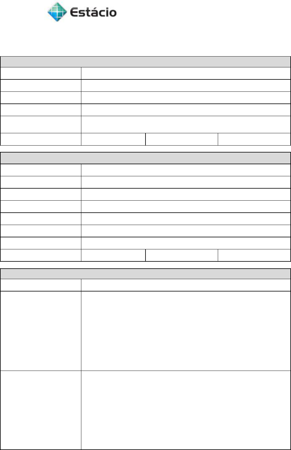 FACULDADE ESTÁCIO DE BELÉM – ESTÁCIO BELÉM COORDENAÇÃO DE PESQUISA, INICIAÇÃO CIENTÍFICA, DESENVOLVIMENTO TECNOLÓGICO E INOVAÇÃO FACULDADE ESTÁCIO DE BELÉM – ESTÁCIO BELÉM COORDENAÇÃO DE PESQUISA, INICIAÇÃO CIENTÍFICA, DESENVOLVIMENTO TECNOLÓGICO E INOVAÇÃO Anexo I – Formulário de Proposta de Projeto Breve Identificação do Projeto de Pesquisa: Natureza do Projeto: ( ) INICIAÇÃO CIENTÍFICA ( ) DESENVOLVIMENTO TECNOLÓGICO E INOVAÇÃO Título do Projeto: Palavras-Chaves: Área de Conhecimento: Curso ao qual o Projeto estará vinculado: Início: Término: Identificação do Professor Orientador: Nome: Titulação: Regime de Trabalho: ( ) TI (40 horas) ( ) TP (20 horas) ( ) Horista CH Semanal: CPF: Email: Link Lattes: Último IPPGR3 Telefone (Trab.): Telefone(Cel.): Identificação do(s) Aluno(s) Participante(s) – Máximo de 4: Nome Informações (todos os itens são de preenchimento obrigatório) 1- Curso: Matrícula: CRA: CPF: Telefone: Email: Link Lattes: Já é Bolsista ou Voluntário PIBICTI? ( )Não ( )Sim. Se sim, enviar o Relatório Parcial do Projeto em Andamento (Anexo III) Já possui outro tipo de bolsa? ( )Não ( )Sim, Qual? Caso não hajam bolsas disponíveis, manifesta interesse em permanecer no projeto como voluntário? ( )Não ( )Sim. 2- Curso: Matrícula: CRA: CPF: Telefone: Email: Link Lattes: Já é Bolsista ou Voluntário PIBICTI? ( )Não ( )Sim. Se sim, enviar o Relatório Parcial do Projeto em Andamento (Anexo III) Já possui outro tipo de bolsa? ( )Não ( )Sim, Qual? Caso não hajam bolsas disponíveis, manifesta interesse em permanecer no projeto como voluntário? ( )Não ( )Sim. Caso haja mais alunos, replique a última linha do quadro acima. (todas as informações em vermelho devem ser retiradas, inclusive esta) Detalhamento do Projeto de: ( )Iniciação Científica ( )Desenv. Tecnológico e Inovação Título do Projeto Título do projeto. Problema de projeto Aqui deve ser colocada qual a pergunta de pesquisa que se pretende responder? Resumo do Projeto (máximo de 300 palavras) Resumo do Projeto. O texto que ficará aqui é o que representará o seu projeto do site da instituição. Portanto, procure prezar por: 1) descrever com clareza os objetivos do projeto 2) explicitar como será realizada a pesquisa, ou seja, qual será a metodologia adotada 3) descrever claramente o que se espera obter como resultados ao final do projeto de pesquisa. Justificativa Aqui deve ser caracterizado o problema que o projeto pretende atacar, referenciando produtos e/ou serviços relacionados. Sugestão: buscar o assunto em bases de patentes. Objetivos do Projeto O objetivo geral define o que o grupo pretende atingir com sua investigação. Os objetivos específicos definem etapas do trabalho a serem realizadas para que se alcance o objetivo geral. Estas etapas devem estar vinculadas ao cronograma (item 4.11). Fundamentação teórica, conforme Norma ABNT – NBR 6023/2002 Deve-se apresentar um resumo do que já foi investigado sobre o tema, destacando os avanços, críticas e limitações encontradas até o momento. Metodologia e Estratégia de Ação Deve-se descrever a metodologia científica a ser empregada e os estágios intermediários para alcançar os objetivos. A metodologia remete diretamente às técnicas metodológicas, ferramentas a serem empregadas, e à maneira de trabalhar no desenvolvimento da pesquisa. Viabilidade Econômico-Financeira Aqui, leve em consideração que a instituição disponibilizará seus laboratórios, equipamentos, dispositivos e acervo bibliográfico já existentes para a realização do projeto. Qualquer eventual necessidade aquisição precisa ser previamente discutida entre o Professor Proponente e a Coordenação do Curso ao qual o projeto ficará vinculado, para saber da viabilidade de tais aquisições durante a realização do projeto, caso seja aprovado. Este item está relacionado ao item 4.10. Resultados, impactos e produtos/serviços esperados Qual será a repercussão da pesquisa em relação ao tema investigado na comunidade científica e na sociedade, a partir dos resultados e conclusões decorrentes da investigação. Investimentos e Recursos necessários Explicite quais recursos materiais (equipamentos, laboratórios, livros, etc) e financeiros (agências de fomento e bolsas) estão disponíveis ou serão necessários para a realização do projeto. Cronograma de Físico/ Financeiro Etapas que levarão à realização dos objetivos descritos nos itens 5 e 6 (objetivos geral e específicos). Atividade Mes 01 02 03 04 05 06 07 08 09 10 11 12 1- X X 2- X 3- X X 4- X X X X 5-(acrescente mais linhas se for necessário) Referências Relacionar aqui as principais referências bibliográficas utilizadas na elaboração do projeto. Use formato ABNT. Anexos Anexar ao projeto quaisquer documentos que possam apoiá-lo, tais como desenhos, esquemas, contratos de financiamento, cartas de interesse e/ou apoio de empresas e órgãos públicos e/ou privados, etc. Declaro que todas as informações descritas acima são verdadeiras. Belém, _______ de _____________ de _________ __________________________________________ Nome completo do professor Professor Orientador do Projeto de Pesquisa Plano de Trabalho dos Alunos Plano de Trabalho do Aluno 1 Identificação do Aluno 1: Nome: Matrícula: Curso: Título do Plano de Trabalho vinculado ao Projeto: Metodologia (detalhada, sem restrição): Metas e Cronograma (detalhar em tópicos, relacionando com o período de duração do trabalho e associado às metas com objetivos específicos) Objetivos/Metas 2018 2019 Ago Set Out Nov Dez Jan Fev Mar Abr Mai Jun Jul 1- 2- 3- 4- 5- Caso tenha mais itens em Objetivos/Metas, inclua mais linhas no quadro Plano de Trabalho do Aluno 2 Identificação do Aluno 2: Nome: Matrícula: Curso: Título do Plano de Trabalho vinculado ao Projeto: Metodologia (detalhada, sem restrição): Metas e Cronograma (detalhar em tópicos, relacion