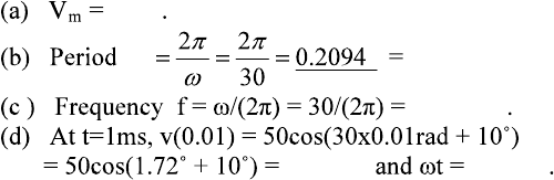Chapter 9, Solution 1. 50 V T s 209.4ms 4.775 Hz 44.48 V 0.3 rad Chapter 9, Solution 2. (a) amplitude = 15 A (b) = 25 = 78.54 rad/s (c) f = 2 = 12.5Hz (d) Is = 15 25 A Is(2 ms) = )25)102)(500cos((15 3- = 15 cos( + 25 ) = 15 cos(205 ) = –13.595 A Chapter 9, Solution 3. (a) 10 sin( t + 30 ) = 10 cos( t + 30 – 90 ) = 10cos( t – 60 ) (b) –9 sin(8t) = 9cos(8t + 90 ) (c) –20 sin( t + 45 ) = 20 cos( t + 45 + 90 ) = 20cos( t + 135 ) (a) 10cos( t – 60 ), (b) 9cos(8t + 90 ), (c) 20cos( t + 135 ) Chapter 9, Solution 4. Design a problem to help other students to better understand sinusoids. Although there are many ways to work this problem, this is an example based on the same kind of problem asked in the third edition. Problem (a) Express v = 8 cos(7t + 15 ) in sine form. (b) Convert i = –10sin(3t - 85 ) to cosine form. Solution (a) v = 8 cos(7t + 15 ) = 8 sin(7t + 15 + 90 ) = 8 sin(7t + 105 ) (b) i = –10 sin(3t – 85 ) = 10 cos(3t – 85 + 90 ) = 10 cos(3t + 5 ) Chapter 9, Solution 5. v1 = 45 sin( t + 30 ) V = 45 cos( t + 30 90 ) = 45 cos( t 60 ) V v2 = 50 cos( t – 30 ) V This indicates that the phase angle between the two signals is 30 and that v1 lags v2. Chapter 9, Solution 6. (a) v(t) = 10 cos(4t – 60 ) i(t) = 4 sin(4t + 50 ) = 4 cos(4t + 50 – 90 ) = 4 cos(4t – 40 ) Thus, i(t) leads v(t) by 20 . (b) v1(t) = 4 cos(377t + 10 ) v2(t) = -20 cos(377t) = 20 cos(377t + 180 ) Thus, v2(t) leads v1(t) by 170 . (c) x(t) = 13 cos(2t) + 5 sin(2t) = 13 cos(2t) + 5 cos(2t – 90 ) X = 13 0 + 5 -90 = 13 – j5 = 13.928 -21.04 x(t) = 13.928 cos(2t – 21.04 ) y(t) = 15 cos(2t – 11.8 ) phase difference = -11.8 + 21.04 = 9.24 Thus, y(t) leads x(t) by 9.24 . Chapter 9, Solution 7. If f( ) = cos + j sin , )(fj)sinj(cosjcosj-sin d df dj f df Integrating both sides ln f = j + ln A f = Aej = cos + j sin f(0) = A = 1 i.e. f( ) = ej = cos + j sin Chapter 9, Solution 8. (a) 105.7 4560 j + j2 = 53.13-5.12 4560 + j2 = 4.8 98.13 + j2 = –0.6788+j4.752+j2 = –0.6788 + j6.752 (b) (6–j8)(4+j2) = 24–j32+j12+16 = 40–j20 = 44.72 –26.57˚ j2)j8)(4(6 2032 + j2410- 20 = 26.5744.72 2032 + 62.11226 20 = 0.7156 6.57˚+0.7692 –112.62˚ = 0.7109+j0.08188–0.2958–j0.71 = 0.4151–j0.6281 (c) 20 + (16 –50 )(13 67.38 ) = 20+208 17.38 = 20 + 198.5+j62.13 = 218.5+j62.13 Chapter 9, Solution 9. (a) )52.45176.10)(305( )261.7j13.7)(305()7392.0j1197.18j6)(305( 50.88 –15.52˚. (b) )96.12083.5()5j3( )5035)(6010( 60.02 –110.96˚. z j z z e j (a) z z z (b) z z z jjjz Chapter 9, Solution 11. (a) 21 15 VoV (b) ( ) 8sin(10 70 180 ) 8cos(10 70 180 90 ) 8cos(10 160 )o o o o oi t t t t o o o I = 8 160° mA (c ) 3 3( ) 120sin(10 50 ) 120cos(10 50 90 )o ov t t t V = 120 –140° V (d) ( ) 60cos(30 10 ) 60cos(30 10 180 )o oi t t t I = 60 –170° mA Chapter 9, Solution 12. Let X = 4 40 and Y = 20 –30 . Evaluate the following quantities and express your results in polar form. (X + Y)/X* (X - Y)* (X + Y)/X X = 3.064+j2.571; Y = 17.321–j10 (a) (X + Y)X* = 03.6076.86)404)(03.2069.21( )404)(429.738.20( j = 86.76 –60.03˚ (b) (X – Y)* = (–14.257+j12.571)* = 19.41 –139.63˚ (c) (X + Y)/X = (21.69 –20.03˚)/(4 40˚) = 5.422 –60.03˚ Chapter 9, Solution 13. (a) 1520.02749.1)2534.08425.0()4054.04324.0( jjj (b) 0833.2 15024 3050 o o = –2.083 (c) (2+j3)(8-j5) –(-4) = 35 +j14 Chapter 9, Solution 14. (a) 13912.0j7663.071.1697788.0 38.112385.18 91.77318.14 17j7 14j3 (b) 55.11922.1 7.213406.246 9.694424186 )5983.1096.16)(8467( )8060)(8056.13882.231116.62( j jjj jjj (c) = [(22.36 63.43˚)/(5 53.13˚)]2[(11.18 26.57˚)(25.61 –51.34˚)]0.5 = [4.472 10.3˚]2[286.3 –24.77˚]0.5 = (19.999 20.6˚)(16.921 –12.38˚) = 338.4 8.22˚ or 334.9+j48.38 Chapter 9, Solution 15. (a) j1-5- 3j26j10 = -10 – j6 + j10 – 6 + 10 – j15 = –6 – j11 (b) 453016 10-4-3020 = 60 15 + 64 -10 = 57.96 + j15.529 + 63.03 – j11.114 = 120.99 + j4.415 (c) j1j 0jj1 j1j1 j1j 0jj1 = )j1(j1 )j1(j0101 22 = )j1j1(11 = 1 – 2 = –1 Chapter 9, Solution 16. (a) –20 cos(4t + 135 ) = 20 cos(4t + 135 180 ) = 20 cos(4t 45 ) The phasor form is 20 –45 (b) 8 sin(20t + 30 ) = 8 cos(20t + 30 – 90 ) = 8 cos(20t – 60 ) The phasor form is 8 –60 (c) 20 cos(2t) + 15 sin(2t) = 20 cos(2t) + 15 cos(2t – 90 ) The phasor form is 20 0 + 15 –90 = 20 – j15 = 25 -36.87 Chapter 9, Solution 17. 1 2 10 60 12 30 5 8.66 10.392 6 15.62 9.805 o oV V V j j o v(t) = 15.62cos(50t–9.8˚) V Chapter 9, Solution 18. (a) )t(v1 = 60 cos(t + 15 ) (b) 2V = 6 + j8 = 10 53.13 )t(v2 = 10 cos(40t + 53.13 ) (c) )t(i1 = 2.8 cos(377t – /3) (d) 2I = -0.5 – j1.2 = 1.3 247.4 )t(i2 = 1.3 cos(10 3t + 247.4 ) Chapter 9, Solution 19. (a) 3 10 5 -30 = 2.954 + j0.5209 – 4.33 + j2.5 = -1.376 + j3.021 = 3.32 114.49 Therefore, 3 cos(20t + 10 ) – 5 cos(20t – 30 ) = 3.32 cos(20t + 114.49 ) (b) 40 -90 + 30 -45 = -j40 + 21.21 – j21.21 = 21.21 – j61.21 = 64.78 -70.89 Therefore, 40 sin(50t) + 30 cos(50t – 45 ) = 64.78 cos(50t – 70.89 ) (c) Using sin = cos( 90 ), 20 -90 + 10 60 5 -110 = -j20 + 5 + j8.66 + 1.7101 + j4.699 = 6.7101 – j6.641 = 9.44 -44.7 Therefore, 20 sin(400t) + 10 cos(400t + 60 ) – 5 sin(400t – 20 ) = 9.44 cos(400t – 44.7 ) 7.5cos(10t+30˚) A can be represented by 7.5 30˚ and 120cos(10t+75˚) V can be represented by 120 75˚. Thus, = / = (120 75˚)/(7.5 30˚) = 16 45˚ or . Chapter 9, Solution 21. (a) oooo jF 86.343236.8758.48296.690304155 )86.3430cos(324.8)( ottf (b) ooo jG 49.62565.59358.4571.2504908 )49.62cos(565.5)( ottg (c) 40,9050010 j 1H oo i.e. ooo 69.1682748.125.125.0j18025.19025.0H h(t) = 1.2748cos(40t – 168.69°) Chapter 9, Solution 22. Let f(t) = t dttv dt dvtv )(24)(10 oV j VVjVF 4555,5,2410 oVjVjVjVF 89.1086.1249)4555(89.6372.22)4.2010(4.02010 f(t) = 1249.6cos(5t+108.89˚) Chapter 9, Solution 23. (a) v = [110sin(20t+30˚) + 220cos(20t–90˚)] V leads to V = 110 (30˚–90˚) + 220 –90˚ = 55–j95.26 – j220 = 55–j315.3 = 320.1 –80.11˚ or v = 320.1cos(20t–80.11˚) A. (b) i = [30cos(5t+60˚)–20sin(5t+60˚)] A leads 