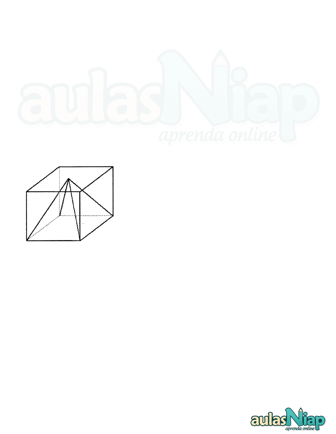 Pirâmide 1)De uma pirâmide regular de base quadrada sabe que a área da base é 32m² e o apótema da pirâmide vale 6m². Calcule: a)a aresta de base b)apótema da base c)a altura da pirâmide d) a aresta lateral e)área total 2)Em uma pirâmide regular de base quadrada, a aresta da base mede 5cm e as arestas laterais dessa pirâmide medem 5cm. Determine: a)a área total b)o volume 3)Uma pirâmide está inscrita num cubo, como mostra a figura abaixo. Sabendo-‐se que o volume da pirâmide é de 6m³, então, o volume do cubo, em m³, é igual a: 4)Uma pirâmide reta e regular tem apótema (altura da face lateral) medindo 5 cm e a sua base é um quadrado cujo lado mede 8 cm. Calcule o volume desta pirâmide. 5) O volume de uma pirâmide quadrangular regular é 144 m3 e a altura é o dobro da aresta da base. Calcule a altura dessa pirâmide. Gabarito 1) a)4√2m b)22m c)2√7m d)2√11m e)48√2m2 2)a)25(√3+1)cm2 b)125√2/6 3)18m3 4)64cm3 5)12