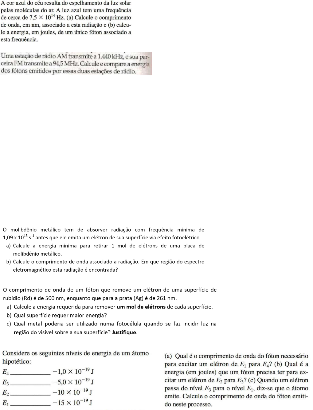 1 INSTITUTO FEDERAL DE MINAS GERAIS – IFMG Campus Avançado Itabirito 1ª Lista de Exercícios – Química Geral Prof.ª Tamyris Cunha Questão 01. Construa uma tabela que compile o desenvolvimento dos modelos atômicos. Nesta tabela coloque a necessidade da criação do modelo, o que ele trouxe de novidade para o átomo e suas limitações. Questão 02 Questão 03 Questão 04. Quais são a energia e o comprimento de onda de um fóton emitido por um átomo de hidrogênio ao sofrer uma transição direta de um estado excitado com n = 10 para o estado fundamental? Localize essa radiação no espectro eletromagnético. Questão 05. Leia cada uma das afirmativas apresentadas abaixo e indique aquelas que são verdadeiras e falsas. Justifique aquelas que considerar falsas. ( ) Um elétron, quando se movimenta ao longo de uma órbita quanticamente permitida, não irradia energia, encontrando-se, conforme Bohr, em estado estacionário. ( ) A luz branca é essencialmente monocromática, isto é, formada por um só tipo de radiação, de comprimento e frequência bem definidos. ( ) Em conformidade com o modelo atômico de Bohr, a energia do elétron em um átomo é quantizada, isto é, restrita a certos e determinados valores. ( ) Os elétrons, segundo o modelo atômico de Bohr, estão continuamente mudando de órbitas circulares bem definidas ao redor do núcleo, exceto para os elétrons externos que descrevem órbitas elípticas. ( ) A energia do elétron, em uma órbita permitida no n-ésimo nível, depende do valor de n de acordo com o modelo atômico proposto por Bohr. Questão 06 Questão 07 Questão 08 2 Questão 09 Complete a tabela abaixo Elemento/Íon Prótons Neutrons Elétrons Número de Massa Cd2+ 48 _______ ________ 112 _________ 82 125 80 _________ _________ _________ 28 24 51 Ar _________ ________ 18 40 Questão 10. Considere o íon Ca19+ com o seu elétron no 5º estado excitado. (a) Calcule o menor comprimento de onda que poderia ser emitido quando o elétron do Ca19+ sofre uma transição para um nível de energia mais baixo. (b) Suponha que a mesma transição descrita no item (a) ocorra em um átomo de hidrogênio. O comprimento de onda da radiação emitida seria maior, menor ou igual aquele observado no item (a)? Explique brevemente o porquê. Questão 11. Explique por que as energias dos níveis de Bohr têm valores negativos. Em que nível eletrônico o elétron de um átomo hidrogenóide está mais fortemente ligado ao núcleo? Faça um comentário geral comparando esses valores de energia e a força de ligação elétron-núcleo. Questão 12 Explique por que a equação de De Broglie não é adequada quando se avalia um objeto macroscópico em movimento, como por exemplo, uma bola de tênis. Questão 13 Questão 14. Questão 15 Questão 16 Questão 17 Complete as frases abaixo com "Orbital possível" ou "Orbital impossível" de acordo com o conjunto de números quânticos. Caso seja possível coloque a letra associada a este orbital ou complete novamente com "Orbital impossível". a) n = 1, l = 1, ml = -1 é um ________________ do tipo ________________. b) n = 5, l = 0, ml = 0 é um ________________ do tipo ________________. c) n = 2, l = 3, ml = 1 é um ________________ do tipo ________________. d) n = 1, l = 0, ml = -1 é um ________________ do tipo ________________. e) n = 4, l = 3, ml = -2 é um ________________ do tipo ________________. Questão 18. Apresente a configuração eletrônica para cada uma das espécies abaixo e as classifique em paramagnética ou diamagnética. a) Co2+ e Ca2+ b) Ar e Cu2+ c) Mn2+ e N3‒ 3 Questão 19 Questão 20 Explique qual é a interpretação física dos números quânticos que surgem da resolução da equação de Schrödinger e do quarto número quântico que descreve o elétron no átomo. O que diz o princípio da exclusão de Pauli sobre esses números quânticos? Questão 21 Questão 22. Observe o desenho que mostra representações em escala de algumas espécies químicas monoatômicas. Leia as afirmativas abaixo e indique aquelas que considerar falsas ou verdadeiras. ( ) O raio do Br- é maior do que o de Kr e o de Rb+, porque Br- é a espécie que tem mais camadas eletrônicas ocupadas. ( ) O raio do Cl- é maior do que o de Ar e o de K+, porque o núcleo de Cl- é de menor carga positiva. ( ) O raio do F- é maior do que o de Ne e o de Na+, porque F- é a espécie que tem menos elétrons. ( ) O raio de F- é menor do que o de Cl- e o de Br-, porque F- é a espécie com o núcleo de menor raio. ( ) O raio de Ne é menor do que o de Ar e o de Kr, porque Ne tem a menor repulsão entre os elétrons da última camada. Questão 23 Questão 24 Questão 25. Considere a seguinte tabela de energias de ionização (kJ mol‒1). As letras não representam símbolos químicos dos elementos. Elemento 1ª EI 2ª EI 3ª EI 4ª EI 5ª EI A 496 4562 6910 9543 13354 B 738 1451 7733 10541 13629 C 789 1577 3232 4356 16091 D 419 3052 4420 5877 7975 E 1140 2100 3500 4560 5760 a) Qual destes elementos tem maior tendência para formar um cátion 4+? Justifique sua resposta. b) Qual par de elementos deve pertencer ao mesmo grupo na classificação periódica? Nesse par, qual tem maior Z? Justifique sua resposta.