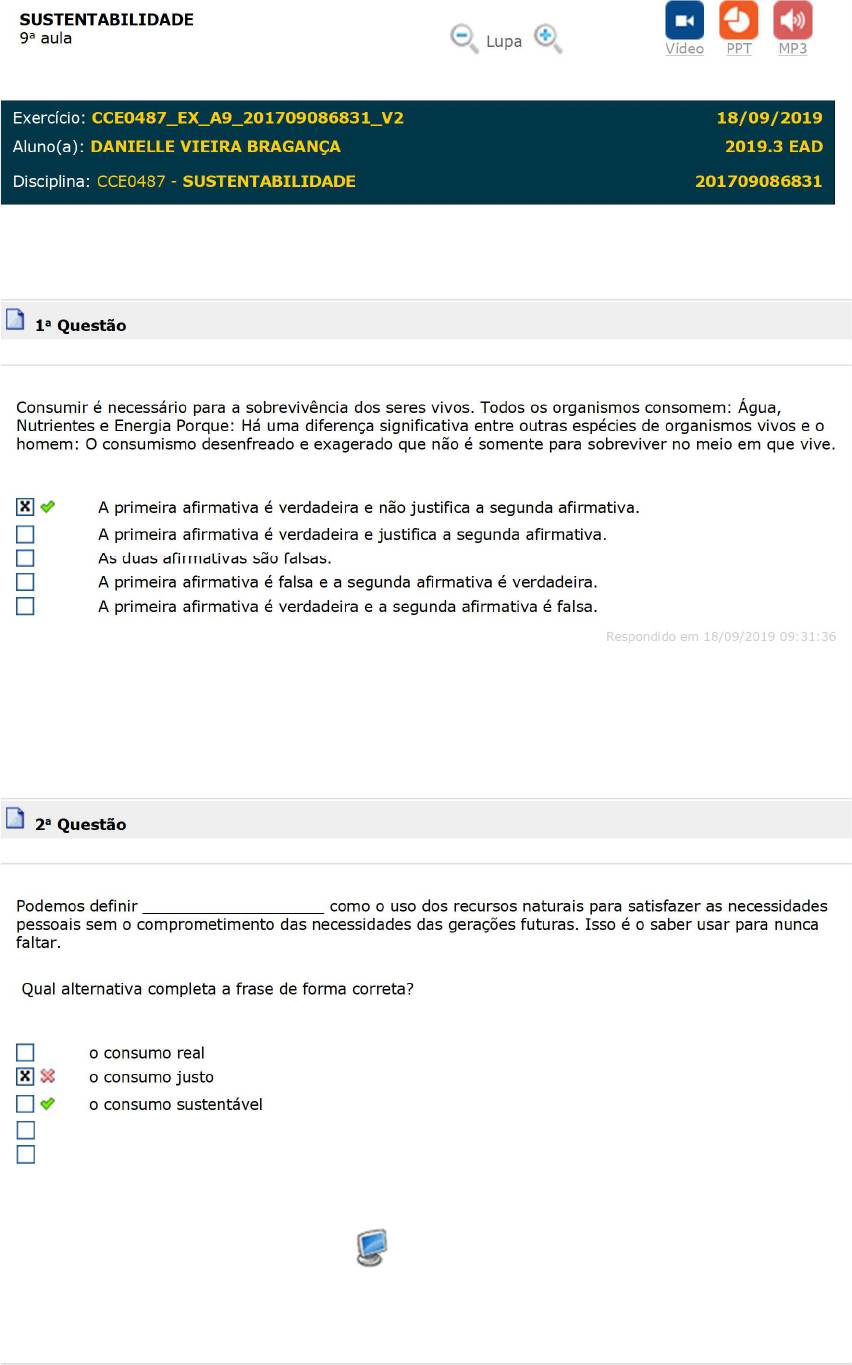 SUSTENTABILIDADE 9a aula Lupa Vídeo PPT MP3 Exercício: CCE0487_EX_A9_201709086831_V2 18/09/2019 Aluno(a): DANIELLE VIEIRA BRAGANÇA 2019.3 EAD Disciplina: CCE0487 - SUSTENTABILIDADE 201709086831 1a Questão Consumir é necessário para a sobrevivência dos seres vivos. Todos os organismos consomem: Água, Nutrientes e Energia Porque: Há uma diferença significativa entre outras espécies de organismos vivos e o homem: O consumismo desenfreado e exagerado que não é somente para sobreviver no meio em que vive. A primeira afirmativa é verdadeira e não justifica a segunda afirmativa. A primeira afirmativa é verdadeira e justifica a segunda afirmativa. As duas afirmativas são falsas. A primeira afirmativa é falsa e a segunda afirmativa é verdadeira. A primeira afirmativa é verdadeira e a segunda afirmativa é falsa. Respondido em 18/09/2019 09:31:36 2a Questão Podemos definir ___________________ como o uso dos recursos naturais para satisfazer as necessidades pessoais sem o comprometimento das necessidades das gerações futuras. Isso é o saber usar para nunca faltar. Qual alternativa completa a frase de forma correta? o consumo real o consumo justo o consumo sustentável o consumo desenvolvimentista o consumo natural Respondido em 18/09/2019 09:31:48 Gabarito Coment. 3a Questão Princípios para construção da sustentabilidade são mencionados usualmente como referências no conhecimento em sustentabilidade e servem de base para todos os outros. Em relação à Agenda 21, destaca-se como: um código de conduta que procura aumentar os direitos humanos, justiça social, proteção ambiental e econômica para todos os trabalhadores, em todas as indústrias, em todas as nações. um conjunto de princípios para as empresas que buscam a sustentabilidade e tem como lema a Integração.Está baseado em 5 etapas. um guia com princípios e fundamentos para construção de uma sociedade sustentável estabelecido a partir de um consenso de cientistas tendo uma metodologia para o planejamento de negócios e a tomada de decisões. Destina-se às organizações e às pessoas que desejam contribuir para o desenvolvimento sustentável da sociedade. um plano de ações para ser executado globalmente, nacionalmente e localmente pelos Sistemas das Nações Unidas, governos, e grupos de todas as áreas que tenham impactos humanos no meio ambiente. origem a vários projetos sociais, parcerias e alianças. Sua maior contribuição foi a de levar o conceito de responsabilidade social corporativa a países que ainda não tinham despertado para essa nova forma de conduzir os negócios. Respondido em 18/09/2019 09:31:53 4a Questão Quando se fala nos problemas relacionados à geração e destinação de resíduos sólidos, há um destaque cada vez maior para o "consumo consciente". Nesta visão, além da ação de Governos e de Empresas, é preciso que os cidadãos adotem posturas sustentáveis. Dentre estas, aparece o conceito dos "5 Rs", que significam, na exata ordem: Repensar, refazer, reformar, reutilizar e reciclar. Reciclar, reutilizar, refazer, repensar, recusar. Reutilizar, reciclar, redefinir, regenerar, recusar. Repensar, recusar, reduzir, reutilizar e reciclar. Repensar, relembrar, reutilizar, reformar, reciclar. Respondido em 18/09/2019 09:31:57 Explicação: Quando se fala nos problemas relacionados à geração e destinação de resíduos sólidos, há um destaque cada vez maior para o "consumo consciente". Nesta visão, além da ação de Governos e de Empresas, é preciso que os cidadãos adotem posturas sustentáveis. Dentre estas, aparece o conceito dos "5 Rs", que significam, na exata ordem:Repensar, recusar, reduzir, reutilizar e reciclar. 5a Questão Com relação ao consumo consciente, analise as afirmativas abaixo: I - O consumo consciente é uma maneira de consumir levando em consideração os impactos provocados pelo consumo. II - O consumidor consciente pode, por meio de suas escolhas, buscar maximizar os impactos positivos e minimizar os negativos dos seus atos de consumo, e desta forma contribuir com seu poder de consumo para construir um mundo melhor. III - O consumidor consciente busca o equilíbrio entre a sua satisfação pessoal e a sustentabilidade do planeta, lembrando que a sustentabilidade implica em um modelo ambientalmente correto, socialmente justo e economicamente viável. Estão CORRETAS as afirmativas: I, II, III I,III II,III I,II III Respondido em 18/09/2019 09:32:01 Gabarito Coment. 6a Questão Com base no que estudamos sobre consumo consciente, assinale a opção que NÃO corresponde a um exemplo de consumidor consciente. Não desperdice água nem energia. O lixo deve ser queimado para evitar acumulo de resíduos sólidos. Use os dois lados da folha de papel. Reutilize tudo que for possível. Evite usar sacolas plásticas. Respondido em 18/09/2019 09:32:04 Gabarito Coment. 7a Questão Em relação ao consumidor consciente, analise as opções a seguir (Asserção e Razão). I (ASSERÇÃO) - O consumidor consciente busca o equilíbrio entre a sua satisfação pessoal e a sustentabilidade do planeta. PORQUE: II (RAZÃO) - Ele reflete a respeito de seus atos de consumo e como irão repercutir sobre si mesmo, nas relações sociais, na economia e na natureza. Selecione a alternativa correta. Asserção errada, razão correta Asserção correta, razão correta, e a razão justifica a asserção Asserção correta, razão correta, mas a razão não justifica a asserção Asserção e razão erradas Asserção correta, razão errada Respondido em 18/09/2019 09:32:07 8a Questão O consumo desmedido das sociedades modernas implica o uso de elevadas quantidades de recursos naturais. Ao mesmo tempo, os atos de consumo comprometem todas as esferas da vida humana:_______________. Qual alternativa abaixo completa a frase? a cultural, a econômica e a mental a material, a social e a psicológica a familiar, a de saúde e a econômica a educacional, a material e a social 
