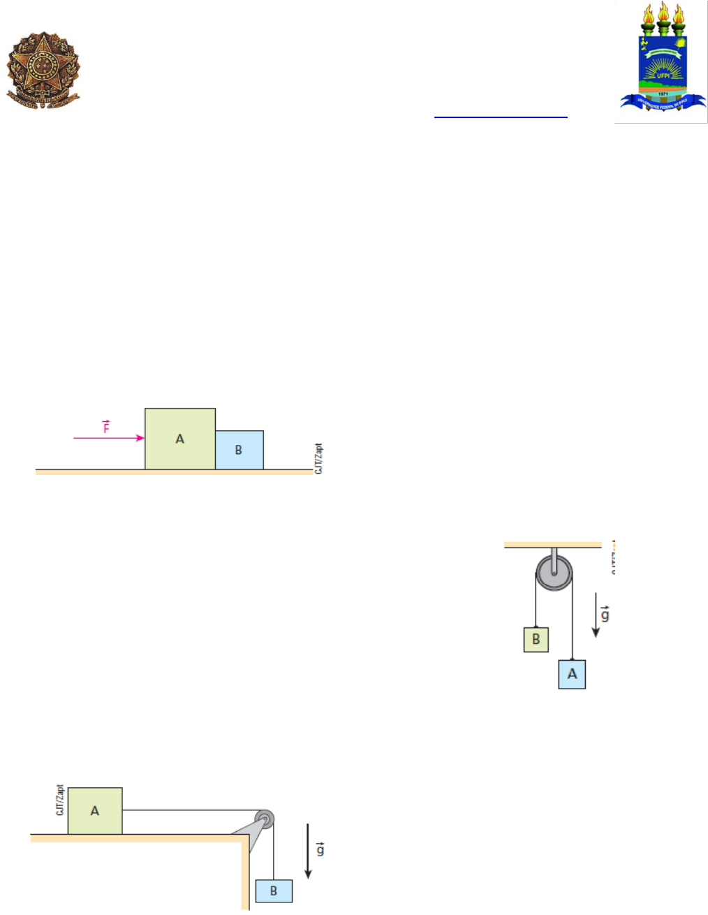 MINISTÉRIO DA EDUCAÇÃO UNIVERSIDADE FEDERAL DO PIAUÍ PRÓ-REITORIA DE ENSINO DE GRADUAÇÃO COLÉGIO TÉCNICO DE BOM JESUS Rodovia Municipal Bom Jesus – Viana / Planalto Horizonte; Bom Jesus-PI CEP 64.900-000 Telefone: (89) 3562-1103; Fax: (89) 3562-2067 / e-mail: cabjdiretoria@ufpi.edu.br Física 01 Prof. Mailson Feitosa Lista I – Aplicações das Leis de Newton 1 - Na figura abaixo, os blocos A e B têm massas mA = 6,0 kg e mB = 2,0 kg e, estando apenas encostados entre si, repousam sobre um plano horizontal perfeitamente liso. A partir de um dado instante, exerce-se em A uma força horizontal F, de intensidade igual a 16 N. Desprezando a influência do ar, calcule: a) o módulo da aceleração do conjunto; b) a intensidade das forças que A e B trocam entre si na região de contato. 2 – No arranjo experimental esquematizado a seguir, os blocos A e B têm massas respectivamente iguais a 4,0 kg e 1,0 kg (desprezam-se os atritos, a influência do ar e a inércia da polia). Considerando o fio que interliga os blocos leve e inextensível e adotando nos cálculos |g | = 10 m/s2, determine: a) o módulo da aceleração dos blocos; b) a intensidade da força de tração estabelecida no fio. 3 - O dispositivo esquematizado na figura é uma Máquina de Atwood. No caso, não há atritos, o fio é inextensível e desprezam-se sua massa e a da polia. Supondo que os blocos A e B tenham massas respectivamente iguais a 3,0 kg e 2,0 kg e que |g| = 10 m/s2, determine: a) o módulo da aceleração dos blocos; b) a intensidade da força de tração estabelecida no fio; c) a intensidade da força de tração estabelecida na haste de sustentação da polia. 4 – No plano inclinado representado ao lado, o bloco encontra-se impedido de se movimentar devido ao calço no qual está apoiado. Os atritos são desprezíveis, a massa do bloco vale 5,0 kg e g = 10 m/s2. a) Copie a figura esquematizando todas as forças que agem no bloco. b) Calcule as intensidades das forças com as quais o bloco comprime o calço e o plano de apoio. 5 - Um garoto de massa igual a 40,0 kg parte do repouso do ponto A do escorregador esquematizado ao lado e desce sem sofrer a ação de atritos ou da resistência do ar. Sabendo-se que no local a aceleração da gravidade tem intensidade 10,0 m/s2, responda: a) Qual o módulo da aceleração adquirida pelo garoto? O valor calculado depende de sua massa? b) Qual o intervalo de tempo gasto pelo garoto no percurso de A até B? c) Com que velocidade ele atinge o ponto B? 6 – Dois blocos (1) e (2) de pesos respectivamente iguais a 30 kgf e 10 kgf estão em equilíbrio, conforme mostra a figura abaixo: Quais as indicações dos dinamômetros D1 e D2, graduados em kgf? 7 – Na situação esquematizada na figura, desprezam-se os atritos e a influência do ar. As massas de A e B valem, respectivamente, 3,0 kg e 2,0 kg. Sabendo-se que as forças F1 e F2 são paralelas ao plano horizontal de apoio e que F1 = 40 N e F2 = 10 N, pode-se afirmar que a intensidade da força que B aplica em A vale: a) 10 N; b) 12 N; c) 18 N; d) 22 N; e) 26 N. 8 – Na montagem esquematizada na figura, os blocos A, B e C têm massas iguais a 2,0 kg e a força F, paralela ao plano horizontal de apoio, tem intensidade 12 N. Desprezando todas as forças resistentes, calcule: a) o módulo da aceleração do sistema; b) as intensidades das forças de tração estabelecidas nos fios ideais (1) e (2). 9 – Na figura, os blocos A, B e C têm massas respectivamente iguais a 3M, 2M e M; o fio e a polia são ideais. Os atritos são desprezíveis e a aceleração da gravidade tem intensidade g. Admitindo os blocos em movimento sob a ação da gravidade, calcule as intensidades da força de tração no fio (T) e da força de contato trocada por B e C (F). 10 – No arranjo experimental esquematizado na figura, o fio e a polia são ideais, despreza- se o atrito entre o bloco A e o plano inclinado e adota-se |g| = 10 m/s2. Não levando em conta a influência do ar, calcule: Massa de A: 6,0 kg Massa de B: 4,0 kg a) o módulo da aceleração dos blocos; b) a intensidade da força de tração no fio; c) a intensidade da força resultante que o fio aplica na polia. 11 – Os blocos A e B da figura seguinte têm massas respectivamente iguais a 2,0 kg e 3,0 kg e estão sendo acelerados horizontalmente sob a ação de uma força F de intensidade de 50 N, paralela ao plano do movimento. Sabendo que o coeficiente de atrito de escorregamento entre os blocos e o plano de apoio vale μ = 0,60, que g = 10 m/s2 e que o efeito do ar é desprezível, calcule: a) o módulo da aceleração do sistema; b) a intensidade da força de interação trocada entre os blocos na região de contato. 12- Na situação esquematizada na figura abaixo, um trator arrasta uma tora cilíndrica de 4,0.103 N de peso sobre o solo plano e horizontal. Se a velocidade vetorial do trator é constante e a força de tração exercida sobre a tora vale 2,0.103 N, qual é o coeficiente de atrito cinético entre a tora e o solo? 13- (Unesp-SP) A figura ilustra um bloco A, de massa mA = 2,0 kg, atado a um bloco B, de massa mB = 1,0 kg, por um fio inextensível de massa desprezível. O coeficiente de atrito cinético entre cada bloco e a mesa é μc. Uma força de intensidade F = 18,0 N é aplicada ao bloco B, fazendo com que os dois blocos se desloquem com velocidade constante. Considerando-se g = 10,0 m/s2, calcule: a) o coeficiente de atrito μc; b) a intensidade da tração T no fio. 14- O corpo A, de 5,0 kg de massa, está apoiado em um plano horizontal, preso a uma corda que passa por uma roldana de massa e atrito desprezíveis e que sustenta em sua extremidade o corpo B, de 3,0 kg de massa. Nessas condições, o sistema apresenta movimento uniforme. Adotando g = 10 m/s2 e desprezando a influência do ar, determine: a) o coeficiente de atrito cinético entre o corpo A e o plano de apoio; b) a intensidade da aceleração do sistema se colocarmos sobre o corpo B uma