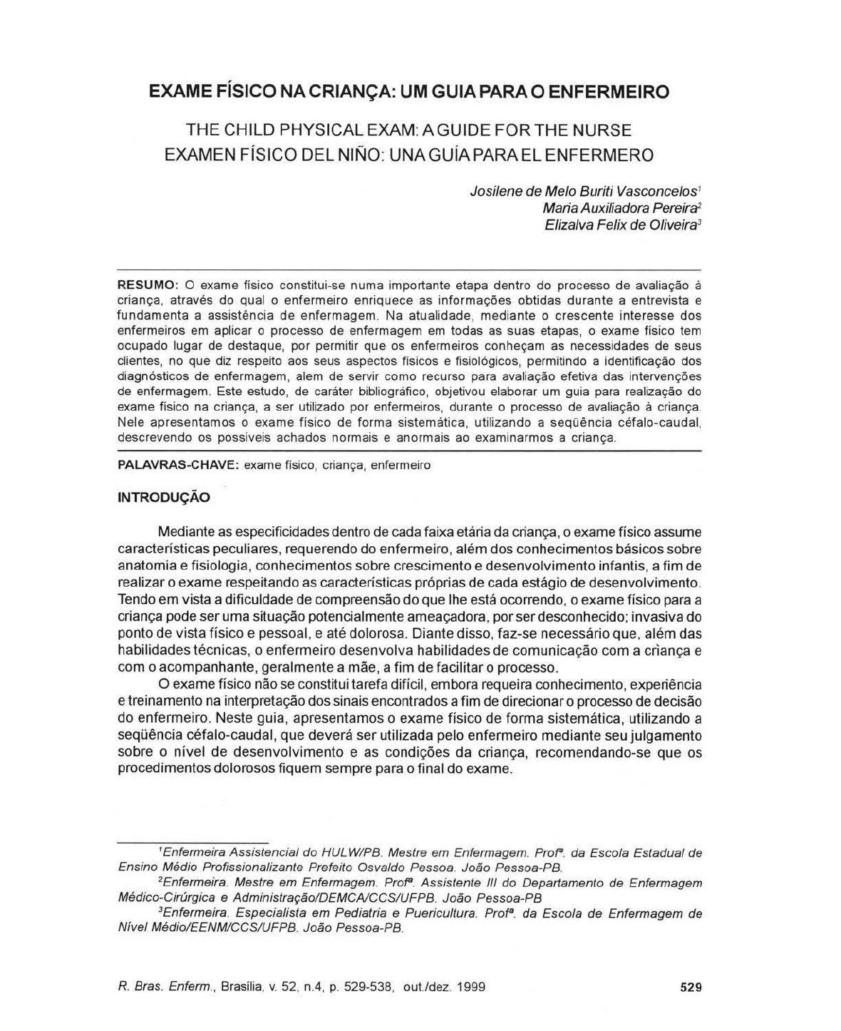 EXAME FíSICO NA CRIANÇA: UM GUIA PARA O ENFERMEIRO THE CHILD PHYSICAL EXAM: AGUIDE FOR THE NURSE EXAMEN FíSICO DEL NINO: UNAGuíA PARAEL ENFERMERO Josilene de Melo Buriti Vasconcelos' Maria Auxiliadora PereiréY Elizalva Felix de Oliveira3 RESUMO: O exame fís ico constitui-se numa importante etapa dentro do processo de avaliação à criança, através do qual o enfermeiro enriquece as informações obtidas durante a entrevista e fundamenta a assistência de enfermagem. Na atualidade, mediante o crescente interesse dos enfermeiros em aplicar o processo de enfermagem em todas as suas etapas , o exame fisico tem ocupado lugar de destaque, por permitir que os enfermeiros conheçam as necessidades de seus clientes, no que diz respeito aos seus aspectos fisicas e fisiolôgicos, permitindo a identificação dos diagnósticos de enfermagem, alem de servir como recurso para avaliação efetiva das intervenções de enfermagem. Este estudo, de caráter bibliográfico, objetivou elaborar um guia para realização do exame fis ico na criança, a ser utilizado por enfermeiros, du rante o processo de avaliação à criança. Nele apresentamos o exame f isico de forma sistemática, utilizando a seqüência céfalo-caudal , descrevendo os passiveis achados normais e anormais ao examinarmos a criança. PALAVRAS-CHAVE: exame fisico, criança. enfermeiro INTRODUÇÃO Mediante as especificidades denlro de cada faixa elária da criança, o exame físico assume características peculiares, requerendo do enfermeiro, alem dos conhecimentos básicos sobre anatomia e fisiologia , conhecimentos sobre crescimento e desenvolvimento infantis, a fim de realizar o exame respeitando as características próprias de cada estágio de desenvolvimento. Tendo em vista a dificuldade de compreensão do que lhe está ocorrendo, o exame físico para a criança pode ser uma situação potencialmente ameaçadora, por ser desconhecido; invasiva do ponto de vista físico e pessoal , e até dolorosa. Diante disso, faz-se necessário que, além das habilidades técnicas, o enfermeiro desenvolva habilidades de comunicação com a criança e com o acompanhante, geralmente a mãe, a fim de facilitar o processo. O exame fisico não se constitui tarefa dificil. embora requeira conhecimento, experiência e treinamento na interpretação dos sinais encontrados a fim de direcionaro processo de decisão do enfermeiro. Neste guia, apresentamos o exame físico de forma sistemática, utilizando a seqüência céfalo-caudal , que deverá ser utilizada pelo enfermeiro mediante seu julgamento sobre o nível de desenvolvimento e as condições da criança, recomendando-se que os procedimentos dolorosos fiquem sempre para o final do exame. 'Enfermeira Assistencial do HULWIPB. Meslre em Enfermagem. Pro". da Escola Estadual de Ensino Médio Profissionalizante Prefeito Osvaldo Pessoa. João Pessoa-PB. 2Enfermeira. Mestre em Enfermagem. Pro". Assis/enle 111 do Deparlamento de Enfermagem Médico-Cirúrgica e Administraçl!JO/DEMCAlCCS/UFPB. João Pessoa-PB JEnfermeira. Especialista em Pediatria e Puericultura. Pro". da Escola de Enfermagem de Nível MédiolEENM!CCS/UFPB. João Pessoa-PB. R. Bras. Enferm., Brasília, v. 52, n.4 , p. 529-538, outldez. 1999 529 VASCONSELOS, Josilene de Melo Buriti et aI. TÉCNICAS BÁSICAS E MATERIAL NECESSÁRIO PARAAREALIZAÇÃO DO EXAME FíSICO NA CRIANÇA Para realização do exame físico utilizam~se técnicas básicas como inspeção, palpação, percussão e ausculta . Para Ferreira et ai. (1995, p. 127~34), essas etapas são assim definidas: Inspeção: compreende o exame visual do paciente cuja finalidade é descobrir características físicas significativas. Compreende observações precisas e detalhadas, unidas à comparação com os padrões de normalidade, da aparência geral da área examinada além das características específicas como cor, textura , localização, posição, tamanho, tipo e grau de movimento, simetria e comparação com o lado oposto . Palpação: é o processo de examinar o corpo , empregando o sentido do tato com o objetivo de determinar as caracteristicas dos órgãos e dos tecidos. Utiliza-se a capacidade tátil , térmica , vibratória e de pressão das mãos para detectar temperatura , movimento, posição, consistência e forma . Percussão: consiste em golpear a superfície do corpo de forma rápida , porém aguda , para produzir sons que permitam ao examinador determinar posição, tamanho, densidade de uma estrutura adjacente. Ausculta : Consiste em escutar os sons produzidos pelos diferentes órgãos do corpo com o objetivo de descobrir variações e desvios de suas características. Pode ser efetuada por método direto, co locando~se o ouvido diretamente na pele (pouco eficaz) e indireto, com o auxílio do estetoscópio. A utilização dessas técnicas durante o exame físico permite a identificação de sinais e sintomas, característicos das condições fisiológicas da criança , os quais não devem ser compreendidos isoladamente, mas a partir do conjunto de dados obtidos, inclusive os da entrevista , tendo como base um referencial para identificação de diagnósticos de enfermagem, tal como a Taxonomia I Revisada da NANDA e Uniformizada no Brasil , conforme N6brega e Garcia (1994). O material necessário para a realização do exame fisico na criança consiste basicamente do seguinte : mesa, antropõmelro manual (crianças até 100cm); balança (pesa-bebê: até 16Kg; antropométrica com toesa vertical : acima de 16Kg e de 100cm) ; estetoscópio e esfigmomanõmetro ; termõmetro; fita métrica; espátulas (abaixadorde língua); lanterna; bolas de algodão; álcool ; papel toalha; brinquedos ou outros recursos adequados à idade (a fim de obter a colaboração da criança) . ROTEIRO DO EXAME FislCO NA CRIANÇA: SEQÜENCIACÉFALO-CAUOAl 1 - OBSERVAÇÃO DAAPARÉ"NCIA GERAL Registra-se a primeira impressão sobre a criança a ser examinada. Envolve a observação da fisionom