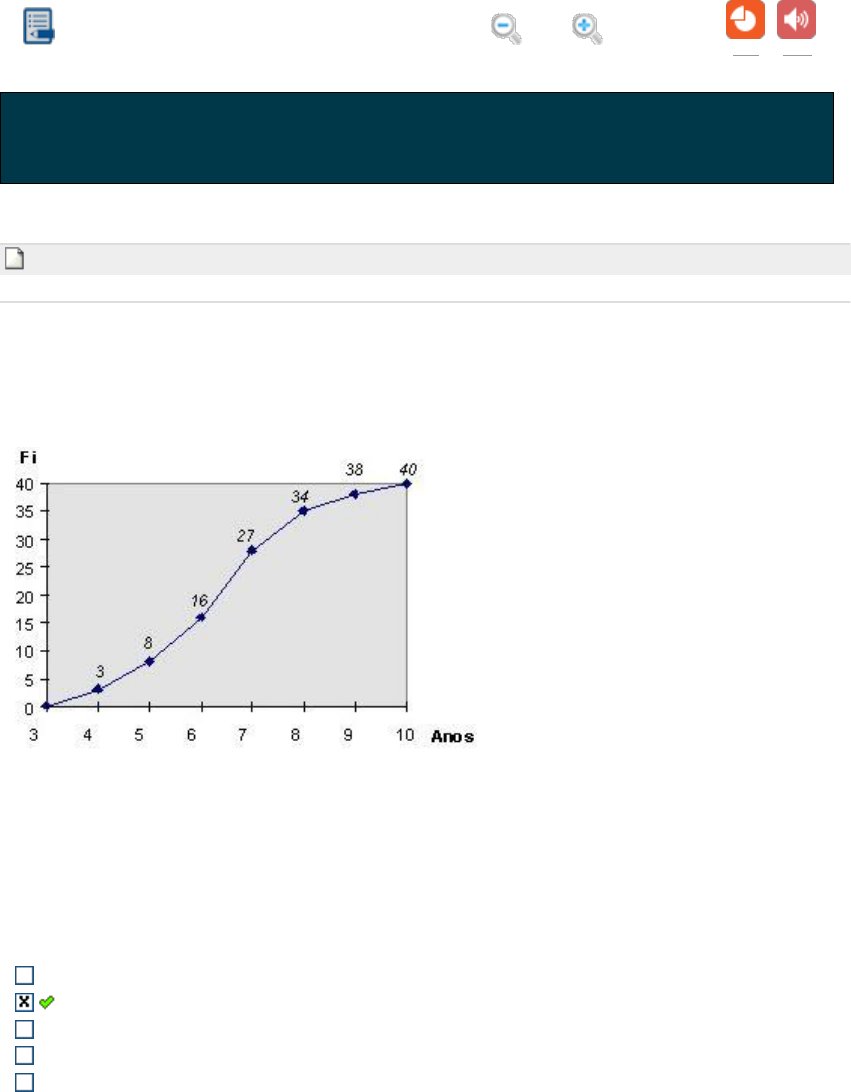 ESTATÍSTICA APLICADA 6a aula Lupa PPT MP3 Exercício: GST2025_EX_A6__V2 22/09/2019 Aluno(a): 2019.3 EAD Disciplina: GST2025 - ESTATÍSTICA APLICADA 1a Questão O Polígono de Frequência Acumulada ou Ogiva de Galton é um gráfico de linha em que são consideradas as frequências acumuladas. Anotamos a frequência nula para o limite inferior da primeira classe e os limites superiores de todas as classes, da primeira à última. O gráfico abaixo é uma Ogiva de Galton e nela temos a associação com a frequência acumulada de uma distribuição. Quanto as afirmativas a seguir, pode-se dizer que: I - A frequência relativa da 3ª classe é 0,2. II - A moda se encontra na 4ª classe. III - A amplitude total é de 7 anos. Apenas a afirmativa II é verdadeira. Todas são verdadeiras. Apenas a afirmativa II é falsa. Apenas a afirmativa III é falsa. Apenas a afirmativa I é falsa. Respondido em 22/09/2019 00:04:26 Explicação: A frequência relativa da terceira classe é quociente encontrado entre a frequência simples da classe e o somatório de todas as frequências: fr3 = (16 - 8) / 40 = 0,2 portanto a afirmativa I é verdadeira. A moda se encontra na classe de maior frequência: 27 - 16 = 11 portanto a afirmativa II é verdadeira. A amplitude total é a diferença entre o limite superior da última classe e o limite inferior da primeira classe: 10 - 3 = 7 portanto a afirmativa III é verdadeira. Daí, todas as afirmativas são verdadeiras. 2a Questão A Raquel fez um inquérito para a disciplina de Estudo Acompanhado sobre quantas horas os colegas estudavam por dia. Obteve o histograma seguinte: Quantas classes formou a Raquel? 3 classes 7 classes 5 classes 6 classes 4 classes Respondido em 22/09/2019 00:04:42 Explicação: Cada coluna representa uma classe. Assim temos 5 classes. Gabarito Coment. 3a Questão Dentre as opções apresentadas, assinale a que corresponde a um pictograma. Respondido em 22/09/2019 00:04:48 Explicação: Um pictograma é um gráfico semelhante a um gráfico de barras onde se utilizam símbolos apelativos em substituição das barras. Gabarito Coment. 4a Questão O __________________ representa frequências relativas ou simples sob a forma de setores de círculo (BRUNI, 2007). Esse gráfico é popular pelo seu formato de "pizza". gráfico de barras gráfico de setores gráfico boxplot gráfico de ogiva gráfico de pareto Respondido em 22/09/2019 00:04:57 Explicação: Trata-se da definição de gráfico de setores. Gabarito Coment. Gabarito Coment. 5a Questão Como podemos identificar o gráfico Pictórico? Representa as frequências acumulativas em porcentagem através de colunas São barras interligadas na representação dos dados no gráfico. Representa as frequências relativas ou simples, sobre forma de setores de um círculo. É a representação dos valores por meio de figuras. É a representação dos valores por meio de linhas. Respondido em 22/09/2019 00:05:06 Explicação: Um pictograma é um gráfico semelhante a um gráfico de barras onde se utilizam símbolos apelativos em substituição das barras. Gabarito Coment. 6a Questão As figuras apresentam dados referentes aos consumos de energia elétrica e de água relativo a cinco máquinas industriais de lavar roupa comercializadas no Brasil. A máquina ideal, quanto a rendimento econômico e ambiental, é aquela que gasta, simultaneamente, menos energia e água. Com base nessas informações, conclui-se que, no conjunto pesquisado: a quantidade de energia elétrica consumida pela máquina de lavar roupa é inversamente proporcional à quantidade de água consumida por ela. a máquina que mais consome energia elétrica não é a que consome mais água. quanto mais a máquina de lavar roupa economiza água, mais ela consome energia elétrica. a máquina I é ideal, de acordo com a definição apresentada a máquina que menos consome energia elétrica não é a que consome menos água. Respondido em 22/09/2019 00:05:49 Explicação: A máquina que consome menos energia é o III e a que consome menos água é o I. Logo não tem uma opção onde ocorra o menor consumo de água e energia simultaneamente. 7a Questão No gráfico abaixo, relacionamos os gastos com alimentação, transporte e habitação, nos anos de 2008 e 2009. Com base na análise do gráfico é VERDADEIRO afirmar que Não houve alteração nos gastos com transporte de 2008 para 2009. A soma dos gastos com transporte em 2008 e 2009 supera a soma dos gastos com alimentação no mesmo período. Em 2008, os gastos com transporte representaram menos de 50% dos gastos com habitação. Em 2008, o gasto com alimentação foi 50% menor que em 2009. Os gastos com habitação, em 2009, superam a soma dos gastos com transporte e alimentação no mesmo período. Respondido em 22/09/2019 00:06:21 Explicação: É correto afirmar que em 2008, os gastos com transporte representaram menos de 50% dos gastos com habitação, pois observando o gráfico, percebemos que os gastos com transporte foram inferiores a $10.000 e os gastos com habitação foram superiores a $20.000. 8a Questão Foi feito um experimento com 3 tipos de produtos para eliminação de fungos. O resultado do experimento foi resumido no gráfico abaixo, onde o eixo vertical representa o percentual de fungos vivos e o eixo horizontal o tempo de exposição ao produto em horas. Pela análise do gráfico, podemos afirmar que ao utilizar o produto do tipo 3 foram eliminados exatamente 50% dos fungos entre 2 e 3 horas de exposição entre 3 e 4 horas de exposição entre 4 e 5 horas de exposição entre 5 e 6 horas de exposição entre 6 e 7 horas de exposição Respondido em 22/09/2019 00:06:44 Explicação: No gráfico de linha apresentado , observa-se que entre a segunda hora e a terceira hora, o percentual de fungos dimjinui de 90% para 40%. Assim 50% de redução se encontra entre as horas 2 e 3.