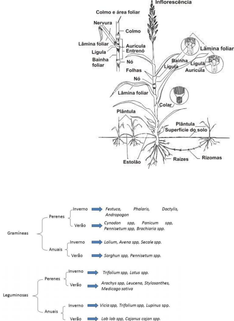 Forragem Gêneros - GRAMINEAS : Zoysia sp. Cynodon sp. Paspalum sp. Brachiaria humidicola Gêneros - LEGUMINOSAS :Arachis pintoi Trifolium repens São plantas prostradas estoloníferas – com ramificações que buscam espaço Prostradas estoloníferas Vantagens ✓Na ausência de sombreamento excessivo, crescem rente ao solo ✓Possuem seus meristemas de crescimento (gemas axilares e meristema apical) mais protegidos do pastejo ✓Possuem a habilidade de emitir raízes nos nós em estolões próximos ao solo (quando há umidade) ✓Toleram pastejos mais intensos (pastejo baixo) Aplicacoes ✓Ocupam o horizonte inferior do dossel, permitindo consorciações com outras espécies ✓Espécies amplamente utilizadas para piquetes de exercício para equinos, pois toleram pisoteio✓Podem ser utilizadas para formar piquetes para consumo por outros herbívoros, ex. coelhos. Estrutura morfológica especial com a presença de rizomas. Rizomas são caules subterrâneos que acumulam substâncias nutritivas. Em alguns rizomas ocorre acúmulo de material nutritivo em certas regiões, formando tubérculos. Rizomas podem ser distinguidos de raízes pelo fato de apresentarem gemas laterais Gênero Cynodon Grupo das bermudas = com rizomas Grupo das estrelas = sem rizomas Ereta cespitosa Porte baixo TOUCEIRAS mais próximas entre si Capins do gênero Brachiaria: Marandu , Mulato , Xaraés* , Piatã Ruziziensis, Kurumi (capim-elefante anão) Capim Massai, Capim Tamani, Milheto*, Sorgo* Ereta cespitosa Porte alto TOUCEIRAS BEM DEFINIDAS Mombaça, Tanzania entre os Panicuns e Napier e Cameroon entre os capins elefante Plantas com hábito de crescimento DECUMBENTE ✓ Colmos crescem encostados no solo SEM enraizamento nos nós ✓‘Plasticidade’ em morfologia, pois podem produzir perfilhos menores e eretos, com colmos curtos se pastejadas mais baixas, ou produzir colmos alongados se deixar crescer muito Plantas com habito de crescimento VOLUVEL LEGUMINOSAS DE INTERESSE FORRAGEIRO ✓ Colmos crescem e se enrolam em outras estruturas ou outras plantas para se sustentar ✓ Meristemas muito expostos, pouco tolerantes ao pastejo ✓Adaptam-se bem em consorciações com plantas cespitosas de porte médio e alto VANTAGENS • Parte aérea pode ser utilizada na alimentação dos animais na seca • Mais resistentes a seca, devido ao sistema radicular profundo APLICAÇÕES • Sombreamento e arborização de pastagens • Bancos de proteína • Recuperação de pastagens degradadas • Cerca viva As raízes possuem funções de absorção de nutrientes e água, fixação e sustentação da planta, além de servirem como reservatórios de carboidratos e nitrogênio, que auxiliam a recuperação daas folhas durante a rebrotação a) Gramíneas Possuem sistema radicular fasciculado ou em cabeleira, em que não se distingue a raiz principal das secundárias. As gramíneas apresentam dois sistemas de raízes (Fig. 21). - Raízes seminais (embrionárias), têm origem no embrião, também chamada radícula, possuem curta longevidade; - Raízes adventícias ou caulinares, também chamadas de raízes nodais, substituem as raízes seminais, são numerosas e possuem muitas ramificações. Originam-se dos primeiros nós basais, de estolões ou, também de outros nós que estejam em contato com o solo e comporão o sistema de raízes permanentes da planta b) Leguminosas Possuem raiz do tipo pivotante, com uma raiz primária, que é dominante e mais robusta e presença de raízes secundárias. A raiz principal é originada da raiz embrionária ou radícula. Todas as espécies dessa família desenvolvem nódulos, formados através do contato da raiz com bactérias do gênero Rhizobium e Bradyrhizobium. Dependendo do gênero da leguminosa os nódulos podem localizar-se em maior concentração na raiz principal ou secundária (Figura 22) a) Gramíneas O caule das gramíneas é do tipo colmo, dotado de nós e entrenós cilíndricos, podem ser ocos ou fistulosos (gramíneas de inverno) ou cheios (milho e cana de açúcar). Ereto cespitoso: cresce perpendicular ao solo. Em algumas gramíneas, os perfilhos crescem de forma agrupada formando as touceiras. Ex.: Capim-elefante Decumbente: os colmos crescem encostados ao solo, mas não desenvolvem raízes nos nós. Ex.: Brachiaria decumbens Rasteiro ou Estolonífero: são caules rasteiros que se desenvolvem junto à superfície do solo, produzindo raízes e parte aérea a partir ddas gemas axilares localizadas nos nós. O estolão é um caule de crescimento horizontal que possui nós e entre-nós. Também é um local de armazenamento de reservas orgânicas b) Leguminosas Nas leguminosas, o colmo pode apresentar formas variadas. De forma geral, os caules podem ser do tipo ereto, prostrado (rasteiros) ou trepadores: Caules eretos a. Herbáceos: caules tenros, geralmente clorofilados, flexíveis, não lignificados. Ex: alfafa. b. Lenhosos: caules intensamente lignificados, rígidos, geralmente de grande porte e com um considerável aumento em diâmetro, como por exemplo, os troncos das árvores. Caules rasteiros: São caules rasteiros ou estoloníferos que se desenvolvem junto à superfície do solo, produzindo raízes e parte aérea a partir dos nós Caules trepadores: Os caules trepadores podem ser volúveis (também chamados escandentes- sem órgão de fixacao) ou sarmentosos(possuem órgão de fixação) a) Hibernais- São forrageiras de clima temperado, que crescem sob condições de dias menos ensolarados. Geralmente possuem menor potencial de crescimento, mas possuem maior valor nutritivo devido aos caules finos e folhagem tenra. São semeados no outono (tanto as perenes como as anuais), sendo utilizadas durante o inverno e também na primavera. b) Estivais: são forrageiras de clima tropical, com elevado potencial de crescimento, colmos grossos e folhas largas. Requerem bastante luz e calor, são sensíveis ao frio intenso, permanecendo com vida apenas os órgãos inferiores (raiz e