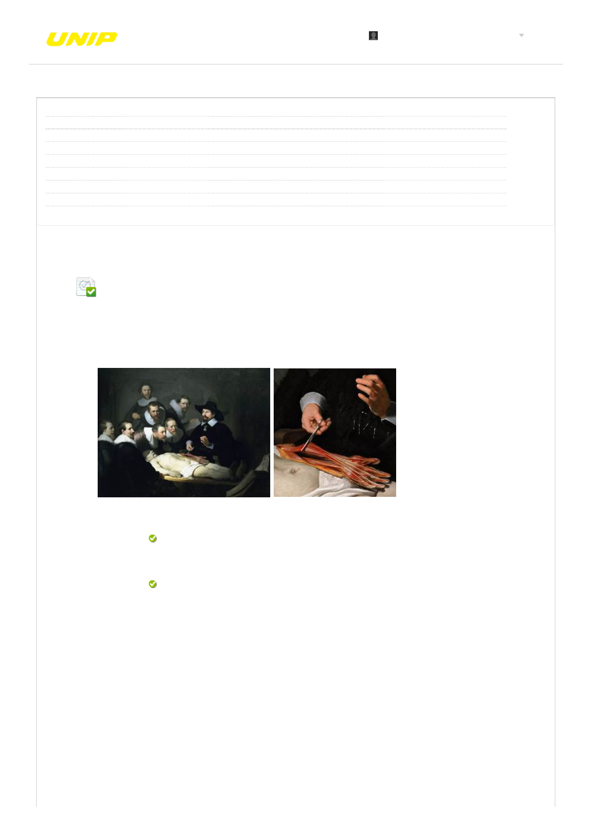 13/08/2019 Revisar envio do teste: QUESTIONÁRIO UNIDADE I – 7061-60... https://ava.ead.unip.br/webapps/assessment/review/review.jsp?attempt_id=_20835598_1&course_id=_46086_1&content_id=_722721_1&return_… 1/6 Revisar envio do teste: QUESTIONÁRIO UNIDADE IANATOMIA 7061-60_54805_R_20192 CONTEÚDO Usuário valdeci.lustosa @unipinterativa.edu.br Curso ANATOMIA Teste QUESTIONÁRIO UNIDADE I Iniciado 13/08/19 09:49 Enviado 13/08/19 09:50 Status Completada Resultado da tentativa 3 em 3 pontos Tempo decorrido 1 minuto Resultados exibidos Todas as respostas, Respostas enviadas, Respostas corretas, Comentários, Perguntas respondidas incorretamente Pergunta 1 Resposta Selecionada: a. Respostas: a. b. c. d. e. “A Lição de Anatomia do Dr. Tulp” (neerlandês: De Anatomischer les van Dr. Nicolaes Tulp) é uma pintura a óleo sobre tela de Rembrandt, pintada em 1632. O morto retratado era Adriaen Adriaansz, conhecido como o “Garoto”, um de�ciente mental, com grave dismor�smo corporal, correspondendo quase a um anão, que após roubar várias vezes, foi enforcado. Personagens ilustres assistiram à dissecação do cadáver de Adriaen, como o anatomista amador e �lósofo René Descartes e o médico inglês Thomas Brown. Reconhecendo que os artistas pós-renascentistas já não recorriam às dissecações, embora reconhecessem a importância de tais conhecimentos é valido enfatizar que esta aula com sete alunos anatomistas é de demonstração, não ocorrendo uma dissecação anatômica e que esta tela contém dois erros anatômicos. Assim, baseado nas informações contidas no texto e nas imagens, quais são os erros anatômicos encontrados? Fonte: CHEREM, A. J. Medicina e arte: observações para um diálogo interdisciplinar. Revista Acta Fisiátrica, v. 12, n. 1, 2005, p. 26-32. O comprimento do membro superior esquerdo é bem maior que o direito e os músculos �exores super�ciais do antebraço estão nascendo erradamente do epicôndilo lateral, ao invés do epicôndilo medial, o que sugere o desconhecimento de Rembrandt sobre anatomia. O comprimento do membro superior esquerdo é bem maior que o direito e os músculos �exores super�ciais do antebraço estão nascendo erradamente do epicôndilo lateral, ao invés do epicôndilo medial, o que sugere o desconhecimento de Rembrandt sobre anatomia. O comprimento do membro superior esquerdo é bem menor que o direito e os músculos �exores super�ciais do antebraço estão nascendo erradamente do epicôndilo medial, ao invés do epicôndilo lateral, o que sugere o desconhecimento de Rembrandt sobre anatomia. O comprimento do membro superior esquerdo é bem menor que o direito e os músculos �exores super�ciais do antebraço estão nascendo erradamente do epicôndilo lateral, ao invés do epicôndilo medial, o que sugere o desconhecimento de Rembrandt sobre anatomia. O comprimento do membro superior esquerdo é bem menor que o direito e os músculos extensores do antebraço estão nascendo erradamente do epicôndilo medial, ao invés do epicôndilo lateral, o que sugere o desconhecimento de Rembrandt sobre anatomia. O comprimento do membro superior esquerdo é bem maior que o direito e os músculos extensores do antebraço estão nascendo erradamente do epicôndilo lateral, ao invés do epicôndilo medial, o que sugere o desconhecimento de Rembrandt sobre anatomia. UNIP EAD BIBLIOTECAS MURAL DO ALUNO TUTORIAISCONTEÚDOS ACADÊMICOS 0,3 em 0,3 pontos valdeci.lustosa @unipinterativa.edu.br 1 13/08/2019 Revisar envio do teste: QUESTIONÁRIO UNIDADE I – 7061-60... https://ava.ead.unip.br/webapps/assessment/review/review.jsp?attempt_id=_20835598_1&course_id=_46086_1&content_id=_722721_1&return_… 2/6 Feedback da resposta: Resposta: A Comentário: Em posição anatômica percebe-se na tela que o membro superior esquerdo é bem maior do que o direito. Além disso, a origem correta do músculo �exor super�cial dos dedos é do epicôndilo medial e não do epicôndilo lateral, como demonstrado na tela. Vale lembrar que na parte anterior encontramos os músculos �exores, enquanto que na parte posterior deparamos com os músculos extensores. Pergunta 2 Resposta Selecionada: a. Respostas: a. b. c. d. e. Feedback da resposta: Analisando as posições anatômicas de estruturas do membro superior, podemos afirmar que o cotovelo, em comparação com o punho, é: Medial. Medial. Posterior. Lateral. Proximal. Distal. Resposta: A Comentário: Lembre-se de que uma estrutura anatômica é medial quando relacionamos ao plano sagital. As estruturas anatômicas consideradas anteriores e posteriores estão relacionadas com o ventre e o dorso, respectivamente. Quando falamos em termos de direção e posição: proximal e distal será utilizado tão-só para os membros superiores e inferiores. Assim, o cotovelo é uma região proximal em relação ao punho, que é distal, pois o cotovelo está mais próximo à raiz do membro superior, que é o ombro. Pergunta 3 Resposta Selecionada: b. Respostas: a. b. As �guras ilustram um indivíduo em posição anatômica e os planos de secção do corpo humano. Observe as �guras e leia as a�rmativas a seguir. Planos de secção Fonte: Modi�cado de DÂNGELO, J. G.; FATINNI, C. A. Anatomia humana sistêmica e segmentar. 2ª edição. Livraria Atheneu Editora São Paulo S.A., 2000. p. 6-7. I. O plano mediano divide o corpo humano em metades: direita e esquerda, sendo semelhantes. II. O plano coronal é um plano de corte que coincide com a sutura sagital. III. O plano transverso divide o corpo em partes: superior e inferior. IV. A raiz do membro superior é o ombro, enquanto que nos membros inferiores são os joelhos. V. Na posição anatômica, o indivíduo permanece em decúbito dorsal, a cabeça e o pescoço �exionados. Com base nas �guras e nas a�rmativas, responda: I e III I e II I e III 0,3 em 0,3 pontos 0,3 em 0,3 pontos 13/08/2019 Revisar envio do teste: QUESTIONÁRIO UNIDADE I – 706