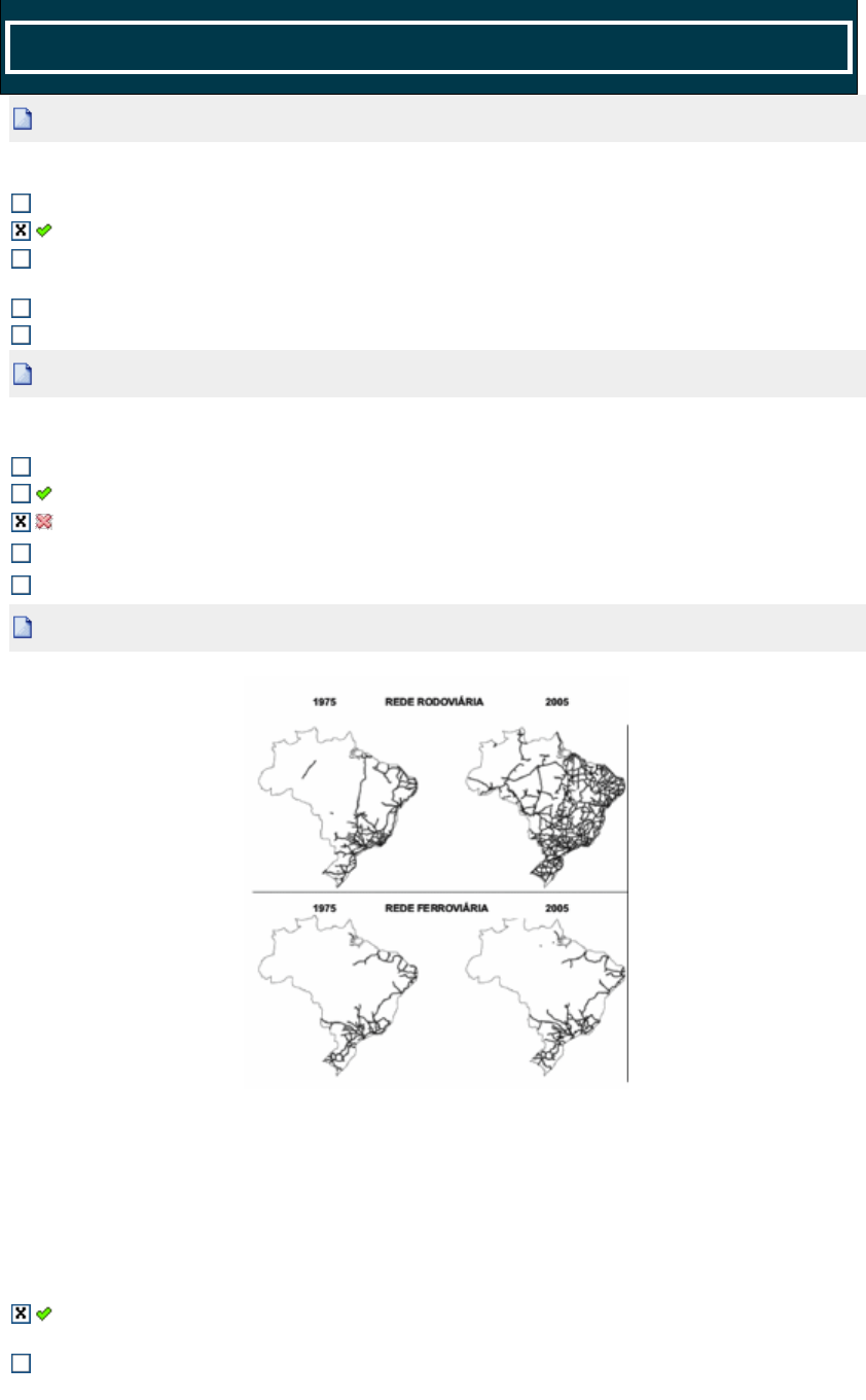 Disc.: SISTEMAS DE TRANSPORTE 1a Questão (Ref.:201804278101) Acerto: 1,0 / 1,0 Sabemos que o modal preponderante na matriz de transporte no Brasil é o modal rodoviário. Quais os principais impactos causados por esta escolha : Facilita o transporte para longas distâncias Aumenta o custo do frete e agride o meio ambiente A relação custo x benefício entre quantidade de carga transportada e o preço do frete é bastante favorável Gera poucos empregos e sobrecarrega as transportadoras Funciona bem em determinadas épocas do ano 2a Questão (Ref.:201804278393) Acerto: 0,0 / 1,0 EM RELAÇÃO O MODELO DE TRANSPORTE DE CARGA ADOTADO NO PAÍS, QUANTO AO CENÁRIO ATUAL BRASILEIRO, ASSINALE A CARACTERÍSTICA INCORRETA: DÉCADAS SEM INVESTIMENTO SIGNIFICATIVO AUMENTO DE COMPETITIVIDADE MALHA RODOVIÁRIA DEGRADADA AUMENTO DOS CUSTOS COM TRANSPORTES MALHA FERROVIÁRIA INCIPIENTE 3a Questão (Ref.:201804278596) Acerto: 1,0 / 1,0 Fonte: Telles, Guimarães e Roessing,2009, p.09. Disponível em: http://www.partes.com.br/2012/10/08/estadocirculacao-e-logistica-uma-abordagem-baseada-no- transporteda-soja-no-brasil/ Acesso em: 09 de setembro de 2013. A análise das figuras e seus conhecimentos sobre o setor de transporte brasileiro permitem afirmar que a opção pelo maior investimento nas rodovias se inicia com Juscelino Kubitschek e seu "plano de metas". entre 1975 e 2005, os investimentos em expansão da malha ferroviária foram similares aos investimentos em expansão da malha rodoviária. durante todo o século XX, o Brasil priorizou os investimentos no modal rodoviário, abandonando o modal ferroviário. o modal rodoviário recebeu maior investimento por ser mais vantajoso nos deslocamentos de longa distância. apesar do baixo crescimento, a expansão das ferrovias, entre 1975 e 2005, ocorreu principalmente na região Norte do país. Respondido em 13/09/2019 16:11:49 4a Questão (Ref.:201804278657) Acerto: 0,0 / 1,0 Qual é o modal com menor custo? Ferroviário. Aeroviário. Hidroviário. Rodoviário. Dutoviário. 5a Questão (Ref.:201804278286) Acerto: 1,0 / 1,0 Assinale a alternativa referente a transporte aéreo. No Brasil responde por mais de 90% do transporte internacional de carga. Tarifas específicas de carga: são tarifas reduzidas aplicáveis a determinas mercadorias, entre dois pontos determinados. O veículos utilizados neste transporte possuem um alto grau de poluição ao meio ambiente. Propicia menor frete, transporta quantidades maiores e não está sujeito a riscos de congestionamentos. Alto custos fixos em equipamentos, terminais. Custo variável baixo. Respondido em 13/09/2019 16:09:54 6a Questão (Ref.:201804278590) Acerto: 0,0 / 1,0 A malha ferroviária no Brasil nunca constituiu uma rede nacional porque: apesar de apresentar grande integração das malhas, liga preferencialmente as regiões interiores do país. possui uma malha com diferentes bitolas e interliga especialmente áreas do interior do país, visando a integração regional. apesar de apresentar grande integração das malhas, liga preferencialmente o interior aos portos, visando a exportação. possui uma malha com diferentes bitolas e interliga especialmente áreas do interior aos portos. A maior integração da Amazônia Legal à economia brasileira está baseada na estruturação de um sistema de ferroviário. Respondido em 13/09/2019 16:10:21 7a Questão (Ref.:201804278623) Acerto: 1,0 / 1,0 Qual é o modal com maior custo? Dutoviário. Hidroviário. Ferroviário. Aeroviário. Rodoviário. 8a Questão (Ref.:201804278406) Acerto: 0,0 / 1,0 Podemos afirmar em RELAÇÃO aos custos dos modais : Ferroviário: Baixos custos Fixos (linhas, terminais, material rodante / Baixos custos variáveis. Aquaviário: Altos Custos Fixos (navios) /Alto Custo Variável (capacidade de transporte). Rodoviário: Baixo Custo Fixo (rodovias públicas) / Altos Custos Variáveis (operação / manutenção/ combustível). Aéreo: Altos Custos Fixos e baixos custos Variáveis. Dutoviário: Alto Custos Fixos (direito de acesso, controle de estações, bombeamento) / Alto custo variável. Respondido em 13/09/2019 16:10:51 9a Questão (Ref.:201804278704) Acerto: 1,0 / 1,0 (ENADE/2012) As tecnologias de identificação de produtos, insumos ou serviços mais utilizadas são o código de barras e as etiquetas eletrônicas (Radio Frequency Identification - RFID). Quanto a essas tecnologias, avalie as afirmações a seguir. I. A tecnologia de código de barras tem uma característica de grande importância para o mercado atual, que é a identificação única do produto, insumo, palete ou caixa. II. A tecnologia RFID armazena as informações em um chip instalado em sua estrutura. III. Sistemas com código de barras necessitam acessar um banco de dados para coletar nformações pertinentes aos produtos, insumos ou serviços que estão sendo movimentados. É correto o que se afirma em: I e II, apenas. II e III, apenas I, apenas. III, apenas. I, II e III. Respondido em 13/09/2019 16:11:41 10a Questão (Ref.:201804278168) Acerto: 0,0 / 1,0 Quando do planejamento de transporte , serão importantes diversos aspectos, exceto : Utilização de terminais Política de estoques Marca , Tipo e modelo do veículo Definição de responsabilidade Fixação de prazos e prioridades Respondido em 13/09/2019 16:11:12