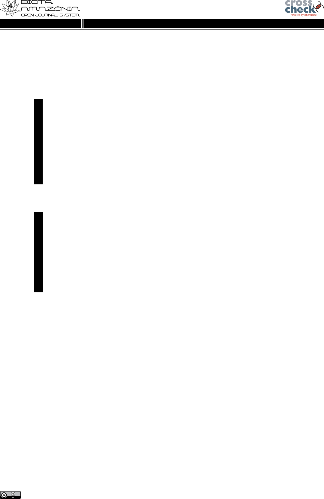 Macapá, v. 7, n. 3, p. 57-68, 2017 Disponível em http://periodicos.unifap.br/index.php/biota Submetido em 01 de Dezembro de 2016 / Aceito em 11 de Setembro de 2017 ARTIGO Biota Amazônia ISSN 2179-5746 Diversos grupos sociais apresentam uma intima relação com as plantas entre eles destacam-se os remanescentes de quilombos. Nesse sentido, a pesquisa foi realizada na comunidade Tauerá-Açú, inserida no Território Quilombola Ilhas de Abaetetuba, tendo como objetivo demonstrar o conhecimento de seus moradores sobre a diversidade das plantas medicinais. Os dados etnobotânicos foram obtidos através de métodos e técnicas usuais em etnobotânica. O universo amostral foi de 34 mães e dois especialistas locais. O material botânico foi coletado e identificado e incorporado aos herbários João Murça Pires (MG) e Marlene Freitas (MFS). Utilizou-se o Índice de Saliência Cultural (ISC) para evidenciar as espécies de maior importância cultural. A diversidade foi calculada utilizando o índice de Shannon-Wiener. Foram registradas 93 etnoespécies, das quais 76 foram identificadas, compreendidas em 68 gêneros e 34 famílias, onde Lamiaceae, Fabaceae e Asteraceae constam como as mais representativas. As plantas mais citadas foram hortelã (Mentha pulegium), arruda (Ruta graveolens) e boldo (Gymnanthemum amygdalinum). A espécie com maior ISC foi Mentha pulegium (0,43). O índice de diversidade de Shannon-Wiener (H' = 4,14) foi considerado alto em comparação com trabalhos realizados em regiões tropicais. A Comunidade quilombola de Tauerá-Açú apresenta um conhecimento vasto e diverso, no entanto, susceptível a mudanças e perdas, proporcionadas principalmente pela transformação gradual do modo de vida dos jovens. Palavras-chave: Etnobotânica, remanescentes de quilombos, conhecimento, diversidade, Amazônia. Several groups were published in an intimate relation with the plants among them stand out the remnants of quilombos. In this sense, the research was carried in the Tauerá-Açu community, located in the Quilombola Territory of the Abaetetuba Islands, in order to demonstrate the knowledge of its inhabitants about the diversity of medicinal plants. Data were obtained through usual methods and techniques in ethnobotanical studies. The sample universe was comprised 34 mothers and two local specialists. The botanical material was collected and identified in the herbaria João Murça Pires (MG) and Marlene Freitas (MFS). The Cultural Salience Index (CSI) was used to show the species of greater importance. The diversity was calculated using the Shannon-Wiener index. A total of 93 ethnoespecies were recorded, of which 76 were identified, composed of 68 genera and 34 families, where Lamiaceae, Fabaceae and Asteraceae to be more representative. The most cited plants were menta (Mentha pulegium), arruda (Ruta graveolens) and boldo (Gymnanthemum amygdalinum). The species with the highest CSI was Mentha pulegium (0.43). The diversity index of Shannon-Wiener (H'= 4.14) was considered high in comparison with works done in tropical. The quilombola community of Tauerá-Açú presents a vast and diverse knowledge, however, susceptible to changes and losses, mainly due to the gradual transformation of the young people's way of life. Keywords: Ethnobotany; remainder communities of the quilombos; knowledge; diversity; Amazon. Use and diversity of medicinal plants in a quilombola community in the Eastern Amazon, Abaetetuba, Pará Uso e diversidade de plantas medicinais em uma comunidade quilombola na Amazônia Oriental, Abaetetuba, Pará 1* 2 Maria das Graças da Silva Pereira e Márlia Coelho-Ferreira 1. Bióloga (Instituto Federal de Educação, Ciência e Tecnologia do Pará). Mestre em Ciências Biológicas (Universidade Federal Rural da Amazônia, Brasil). 2. Bioquímica (Universidade Federal de Ouro Preto). Doutora em Ciências Biológicas (Universidade Federal do Pará). Pesquisadora Titular do Museu Paraense Emílio Goeldi, Brasil. *Autora para correspondência: pereiramariabio@gmail.com Esta obra está licenciada sob uma Licença Creative Commons Attribution 4.0 Internacional DOI: http://dx.doi.org/10.18561/2179-5746/biotaamazonia.v7n3p57-68 R E S U M O A B S T R A C T Introdução A Etnobotânica é uma ciência que se ocupa em estudar a dinâmica das relações entre o ser humano e as plantas (ALEXIADES, 1996). O registro e a documentação destas relações propiciam a revitalização do conhecimento dos povos e comunidades que habitam e manejam os ecossistemas naturais (DIEGUES, 2000; FRAXE et al., 2007). Os remanescentes de quilombos ou quilombolas integram o complexo sociocultural da Amazônia brasileira, representado também por indıǵenas, ribeirinhos e caboclos. Estes mantêm uma estreita relação com o meio ambiente, graças ao conhecimento integrado de crenças e práticas, adquiridas de geração em geração, que configuram seus modos de vida onde as relações comunitárias tendem a se sobrepor às societárias (LIMA e PEREIRA, 2007; FORLINI; FURTADO, 2002). Não se pode esquecer que os nativos da região, com quem os quilombolas mantiveram relações amigáveis e também conflituosas, tiveram uma forte influência sobre os saberes e fazeres destes grupos. Com a chegada maciça dos negros na Amazônia no século XIX, observou-se a fusão dos componentes éticos de negros e ıńdios resultando em uma nova cultura (SALLES, 1971). Todo esse conhecimento é repassado através da oralidade, uma caracterıśtica própria das comunidades tradicionais, já que a grande maioria delas não possui uma tradição escrita (REZENDE; RIBEIRO, 2005; MARTINS et al., 2005; DI STASI; HIRUMA-LIMA, 2002). Para Voeks (2009), as comunidades quilombolas desempenham um importante papel na preservação das tradições etnobotânicas africanas no continente americano. Dentre essas práticas está o uso das plantas medicinais no tratamento e cura de doenças do corpo e do espıŕito, que ainda hoje