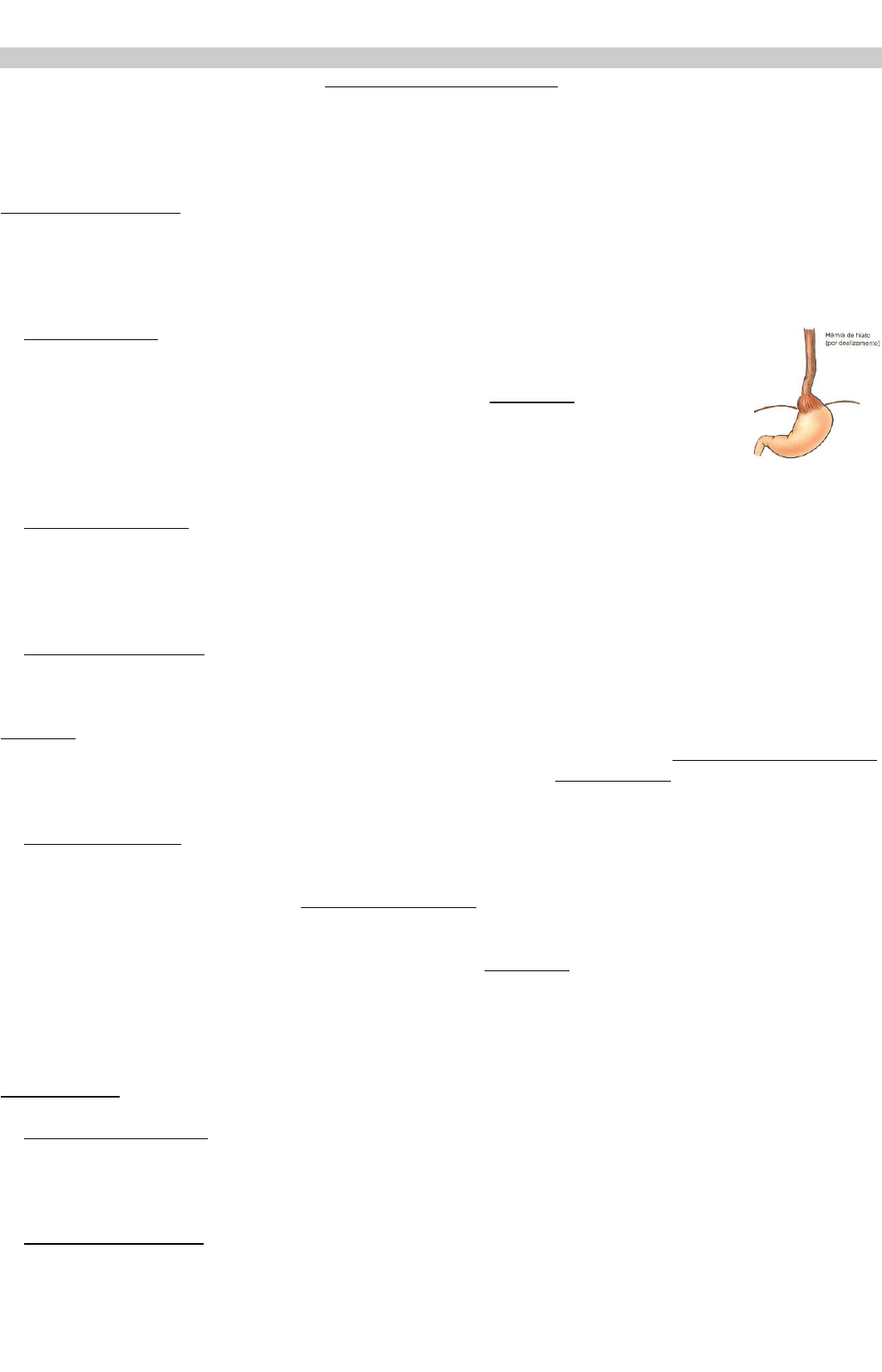 RESUMO PATO G2b Marília Karpss – ATM 2018/02 26/10/15 – Prof. Zettler PATOLOGIA DO ESÔFAGO Distúrbios Motores Neoplasias** Processos congênitos Inflamações** Funções do Esôfago - Condução de alimentos, - Evitar a difusão passiva de alimentos para a circulação** - Evitar o refluxo gástrico ** → Fatores de risco mais comum para alterações da mucosa, mais comumente do 3º terço inferior do esôfago – Esfíncter esofágico inferior é importante para não deixar mucosa adoecer. → Hérnia de Hiato Separação dos pilares diafragmáticos e alargamento do espaço entre eles e a parede esofágica. 1% a 20% dos adultos. Pode ocorrer em lactentes. Azia e regurgitação. Incompetência do esfíncter inferior, posição para frente e obesidade. É uma alteração do diafragma que provoca alterações esofágicas. Pode ser hérnia por deslizamento(axial) e hérnia paraesofágica(não-axial). Por deslizamento é a mais comum (estômago desliza para cavidade torácica). Etiologia: congênita ou adquirida – Adquiria é a mais comum (obesos). COMPLICAÇÕES: ulceração, hemorragia, perfuração, esofagite de refluxo. → Varizes Esofágicas Canais colaterais em qualquer local onde os sistemas porta e cava se comuniquem. Em 90% dos pacientes cirróticos (cirrose alcoólica) – comum em pacientes cirróticos por hipertensão portal. Esquistossomose hepática. Veias do plexo esofágico subepitelial dilatadas e tortuosas. Protrusão da mucosa para a luz. Trombose venosa e inflamação. Hematêmese (45% de óbito no primeiro episódio). → Esofagite de Refluxo Doença do refluxo gastroesofágico (gástrico para esôfago). Principal causa de esofagite. Mais comum em pcts obesos – Hérnia hiatal é a principal causa de refluxo. Adultos acima de 40 anos, mas pode acometer crianças e lactentes. Pode provocar disfagia, azia, regurgitação, hematêmese, melena, dor torácica. Etiologia: Redução da eficácia dos mecanismos anti-refluxo, hérnia hiatal por deslizamento, eliminação lenta ou inadequada do material refluído, esvaziamento gástrico demorado. Aspectos endoscópicos: grau 1: edema e eritema, grau 2: erosões, grau 3: úlceras. Complicações: hemorragia, ulceração, estreitamento e Esôfago de Barrett. → Esôfago de Barret Cerca de 10% dos pacientes com a doença do refluxo gastroesofágico de longa duração (homens adultos). Fator de risco mais importante para o desenvolvimento de adenocarcinoma esofágico – Já sendo considerada uma lesão pré maligna. Critérios diagnósticos: Evidência endoscópica de epitélio colunar acima da junção gastroesofágica, evidência histológica de metaplasia intestinal na biópsia do epitélio colunar (Metaplasia intestinal = resposta adaptativa). Existe risco de evoluir e crescer, causando displasia. Possibilidade de hemorragia, estreitamento, ulceração. Morfologia: tecido aveludado entre a mucosa esofágica e a gástrica. Formato de lingüetas, ilhotas, ou de uma faixa ampla e circular. Substituição do epitélio escamoso esofágico por epitélio colunar metaplásico com células caliciformes intestinais. Avaliar presença de displasia (alto e baixo grau). O tumoer que pode se formar a partir do Esôfago de Barret é do tipo Adenocarcinoma (a partir de glândulas esofágicas). NEOPLASIAS → Neoplasias Benignas – Geralmente são achados ocasionais que não malignizam. Diferenciação mesenquimal: Liomiomas (parede muscular lisa – é o mais comum), fibromas, lipomas, hemangiomas, neurofibromas, linfangiomas, pólipos fibrovasculares. Diferenciação epitelial: Papiloma escamoso, condiloma. → Neoplasias Malignas Os carcinomas esofágicos representam 6% de todos os cânceres do trato gastrointestinal. O câncer de esôfago pode ser responsável por 20% dos óbitos por neoplasias. Diagnóstico tardio em geral. Existem dois tipos: Carcinoma epidermóide(90% dos casos), e Adenocarcinoma(Originado do Esôfago de Barret). → CARCINOMA EPIDERMÓIDE: Corresponde ao tumor maligno mais freqüente – ocorre na mucosa superficial. A maioria ocorre em adultos com mais de 50 anos; mais freqüente em negros. A relação entre RESUMO PATO G2b Marília Karpss – ATM 2018/02 homens e mulheres varia de 2;1 até 20:1. Etiologia: Dieta(deficiência de vitaminas, oligoelementos, contaminação por fungos, alto teor de nitritos e nitrosaminas), Ingestão de bebidas ou alimentos muito quentes, uso de álcool, tabagismo. Esofagite crônica, acalásia, síndrome de Plummer-Vinson, HPV, AIDS. Morfologia: Começam como lesões IN SITU (Quando invasivos: 20% no terço superior, 50% no terço médio e 30% no terço inferior – ou seja, são mais comuns em terço ½ inferior), lesões iniciais são pequenas, branco- acinzentadas, na forma de placas ou áreas elevadas. Lesões avançadas exibem três padrões morfológicos: protruso(60% - cresce em direção à luz, plano/infiltrativo(15%), escavado/ulcerado (25%) - Ulcerados e infiltrantes são mais problemáticos. Podem estar associadas a fístulas com a árvore respiratória, e invadir a aorta, o mediastino e o pericárdio. A sintomatologia está relacionada ao padrão morfológico (Início insidioso. Disfagia, obstrução, emagrecimento, debilidade, hemorragia, septicemia, aspiração de alimentos. Diagnóstico tardio em geral). Prognóstico: Risco de recidiva local e à distância, Sobrevida em 5 anos para lesões superficiais(75%), Doença em estágio avançado(25%), presença de metástases em linfonodos reduz a sobrevida. → ADENOCARCINOMA: Associado ao Esôfago de Barrett. O risco é de aproximadamente 10%. Outros possíveis fatores de risco: álcool, fumo, infecção por Helicobacter pylori. Raramente originado em glândulas gástricas heterotópicas ou em glândulas submucosas. Patogenia: desenvolvimento a partir do esôfago de barrett associado a alterações genéticas, displasia, fatores de crescimento, oncogenes e genes supressores tumorais. Morfologia: Esôfago distal pod