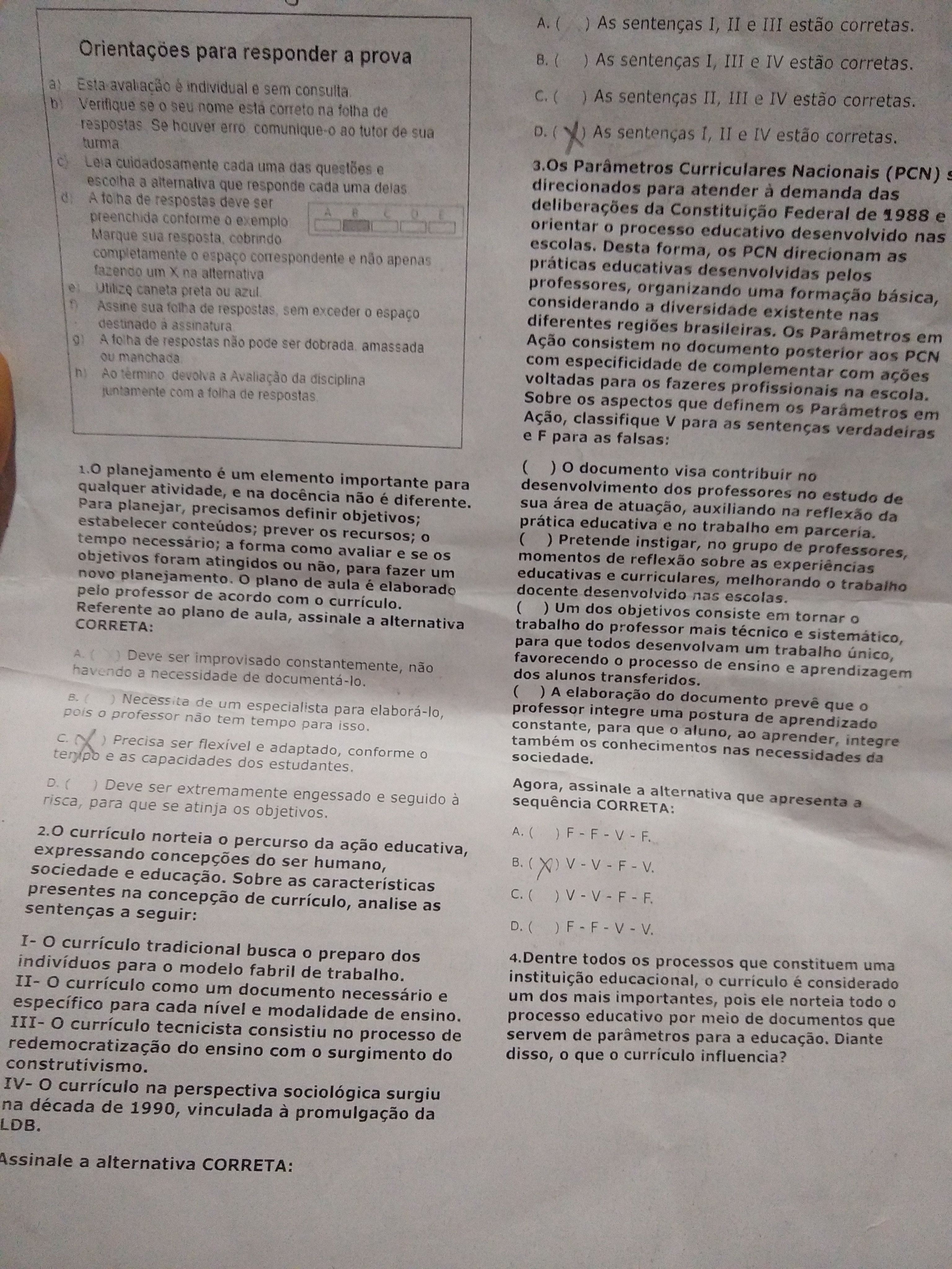 Sobre aspectos que definem Parametros Acao, classifique V para as sentencas verdadeiras e F para as falsas: ( ) O documento visa contribuir no planejamento e um elemento importante para desenvolvimento dos professores no estudo de qualquer atividade, e na docencia nao e diferente. ( ) Para planejar, precisamos definir objetivos; estabelecer conteudos; prever recursos; tempo necessario; a forma como avaliar e se objetivos foram atingidos ou nao, para fazer um novo planejamento. ( ) Um plano de aula e elaborado pelo professor de acordo com curriculo. ( ) Um dos objetivos consiste em tornar trabalho do professor mais tecnico e sistematico, favorecendo processo de ensino e aprendizagem dos alunos.