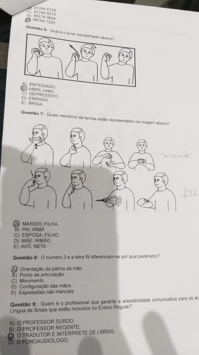 O número 3 e a letra W diferenciam-se por qual parâmetro? A) Orientação da palma da mão B) Ponto de articulação C) Movimento D) Configuração das mãos E) Expressões não manuais