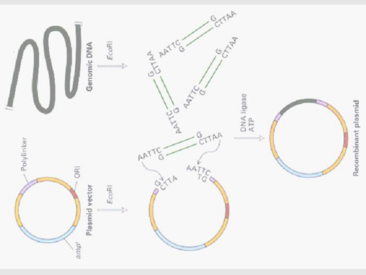 Clonagem de DNA CLONAGEM DE DNA • CLONAGEM: é multiplicar assexuadamente. Na Biologia Molecular, significa mais especificamente crescer uma colônia de bactérias a partir de uma célula única. Clonagem de genes é essencialmente o processo de amplificar seletivamente um gene particular, incorporando-o numa bactéria e clonando a bactéria. Primeiros experimentos bem sucedidos de clonagem foram mostrados no início da década de 1970. Avanços conceituais e tecnológicos que contribuíram para a técnica de clonagem: • Na década de 60: identificação de pequenas moléculas de DNA circular denominadas plasmídeos, que carregam genes de resistência bacteriana a antibióticos. • No final da década de 60: descoberta e caracterização de endonucleases de restrição (Werner Arber, Hamilton Smith, Daniel Nathans; H. Smith e T. Kelly) • 1967: Gellert - purificação da enzima DNA ligase • 1972: Janet Mertz e Ronald Davis – usaram DNA ligase para juntar fragmentos digeridos com Eco RI. • 1972: o grupo de Paul Berg conseguiu inserir genes do bacteriofago l e genes de E. coli no genoma do virus SV40, construindo moléculas recombinantes Por que clonar? • Sequenciamento de DNA • Separar fragmentos de DNA em clones independentes • Estudar a transcrição e a tradução do gene • Fazer estudos de expressão funcional • Sintetizar proteínas para produção de anticorpos • Sintetizar proteínas para uso terapêutico • etc, etc Para clonar é necessário um VETOR Um vetor de clonagem é uma molécula de DNA que tem 3 características fundamentais: • É capaz de replicar independentemente do cromossomo da célula hospedeira. • Organismos contendo o vetor devem poder se desenvolver preferencialmente em um dado meio, porque o vetor confere ao organismo alguma propriedade física ou química, ou ambas, que lhe permite este crescimento preferencial. • O vetor aceita a inserção de DNA adicional em sua molécula de DNA. Enzimas de restrição foram primeiramente identificadas pela sua capacidade de restringir o crescimento de certas viroses em algumas linhagens de E. Coli. Por isso, foram denominadas enzimas de restrição. Essas enzimas fazem parte do mecanismo natural de defesa das bactérias contra a invasão de DNA estranho. Enzimas de restrição Sítios de reconhecimento para enzimas de restrição são curtas sequências reconhecidas e clivadas por várias endonucleases Bactérias com endonucleases de restrição também têm as enzimas correspondentes que metilam as bases específicas no sítio de reconhecimento, assim o seu próprio DNA fica protegido de autodigestão. OH P OH P As enzimas de restrição catalizam a quebra da ligação fosfoéster (hidrólise) entre o oxigênio na posição 3’ de uma base, e o fosfato ligado ao oxigênio na posição 5’ da base seguinte. Enzimas de restrição Corte com extremidades rombas “blunt ends” Corte com extremidades coesivas “stick ends” 5´ pendente ou 3´ pendente A enzima se movimenta ao longo da “major groove” (difusão linear). Quando a seqüência específica é encontrada, há um notável rearranjo estrutural, tanto da enzima quanto do DNA. O DNA sofre uma dobra de cerca de 50o no centro do sítio de reconhecimento. Mg2+ é essencial para a hidrólise e entra no sítio catalítico apenas quando a seqüência alvo é encontrada. Eco RV endonuclease : 5’ G - A - T - A - T - C 3’ 3’ C - T - A - T - A - G 5’ Fragmentos produzidos pela clivagem dos ~36 kb do DNA genômico de adenovirus 2 com Eco RI e Hind III Exemplo de clivagem com enzima de restrição GAATTC CTTAAG AAGCTT TTCGAA Algumas endonucleases de restrição e seus sítios de reconhecimento As enzimas são nomeadas com as abreviações das linhagens de bactérias das quais foram isoladas As duas enzimas da técnica de clonagem de DNA: - Enzimas de restrição •1962 - Arber - ENZIMAS DE RESTRIÇÃO - DNA ligases •1967 – Gellert - DNA LIGASE Extremidades pendentes menores que 15 nucleotídeos não fornecem pareamentos estáveis na temperatura de 37oC. Para que os diferentes segmentos de DNA permaneçam juntos (o plasmídeo e o DNA que se quer clonar) é preciso restabelecer a ligação fosfoester com a LIGASE. Tipos de vetores usados para clonagem Os vetores de clonagem pertencem a duas classes gerais: - Plasmídeos - Fagos Clonagem de DNA usando plasmídeos como vetores Plasmídeos • Pequenas moléculas circulares de DNA dupla fita, não incorporadas ao genoma das bactéria • São formas autoreplicativas de DNA Todas as enzimas necessárias para a replicação de um Plasmídeo são produzidas pela bactéria hospedeira, embora proteínas codificadas pelo plasmídeo auxiliem na regulação de sua replicação. Plasmídeos utilizados para clonagem foram construídos a partir de fragmentos do plasmídeo pBR-322 de E. coli. • Todos os plasmídeos usados como vetor devem ter: • “REPLICATOR” ou origem de replicação • Marcador de seletividade • Sítio de clonagem Origem de replicação (replicator, replicon): é uma sequëncia específica do plasmídeo, com cerca de 1.000 pb, na qual tem início a replicação do DNA. Neste local há um conjunto de elementos regulatórios envolvidos no controle do número de cópias do plasmídeo que serão feitas numa única bactéria. No pBR322: replicon pMB1 - há produção de 15 a 20 cópias/célula No pBlue Script: forma mutada do mesmo replicon – há produção de 500 a 700 cópias/célula MARCADOR DE SELETIVIDADE O marcador de seletividade permite a identificação da bactéria que recebeu o plasmídeo. No vetor ao lado, são genes que codificam proteínas que degradam antibióticos. Amp: betalactamase que degrada ampicilina Seqüência “polylinker” ou “multiple-cloning-site” (MCS) que inclui uma cópia do sítio de reconhecimento para cada uma das 10 enzimas indicadas Plasmídeo UC19 O sítio de clonagem consiste de uma seqüência de nucleotídeos que corresponde