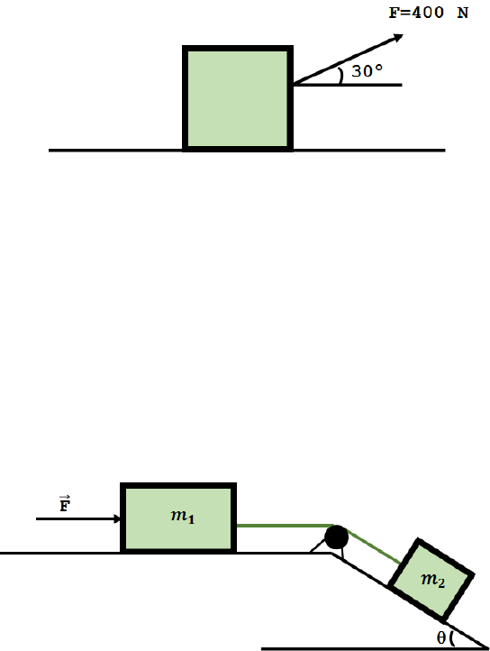 XXVII CPRA LISTA DE EXERCÍCIOS – FÍSICA (DINÂMICA) 1) Uma caixa de 50 kg repousa sobre uma superfície para a qual o coeficiente de atrito cinético é . Se a caixa está sujeita a uma força de tração de 400 N como mostrado na Figura 1, determine a velocidade da caixa após 3 s partindo do repouso. Figura 1 - Exercício 1. 2) A Figura 2 mostra uma caixa de massa sobre um plano inclinado sem atrito de ângulo . Ela está ligada por uma corda de massa desprezível a uma caída de massa sobre uma superfície horizontal sem atrito. A polia não tem atrito e sua massa é desprezível. (a) Se o módulo da força horizontal é 2,3 N, qual é a tensão da corda? (b) Qual é o maior valor que o módulo de pode ter sem que a corda fique frouxa? Figura 2 - Exercício 2. 3) Quando os três blocos da Figura 3 são liberados a partir do repouso, aceleram com um módulo de 0,500 m/s 2 . O bloco 1 tem massa M, o bloco 2 tem massa 2M e o bloco 3 tem massa 2M. Qual é o coeficiente de atrito cinético entre o bloco 2 e a mesa? Figura 3 - Exercício 3. 4) O bloco B da Figura 4 pesa 711 N. O coeficiente de atrito estático entre o bloco e a mesa é 0,25; o ângulo é 30º; suponha que o trecho da corda entre o bloco B e o nó é horizontal. Determine o peso máximo do bloco A para o qual o sistema permanece em repouso. Figura 4 - Exercício 4. 5) A Figura 5 mostra três caixotes sendo empurrados sobre um piso de concreto por uma força horizontal de módulo 440 N. As massas dos caixotes são , e . O coeficiente de atrito cinético entre o piso e cada um dos caixotes é de 0,700. (a) Qual é o módulo F32 da força exercida sobre o bloco 3 pelo bloco 2? (b) Se os caixotes deslizassem sobre um piso polido, com um coeficiente de atrito cinético menor que 0,700, o módulo de F32 seria maior, menor ou igual ao valor quando o coeficiente de atrito era 0,700? Figura 5 - Exercício 5. 6) Os dois blocos (m = 16 kg e M = 88 kg) da Figura 6 não estão ligados. O coeficiente de atrito estático entre os blocos é , mas não há atrito na superfície abaixo do bloco maior. Qual é o menor valor do módulo da força horizontal para o qual o bloco menor não escorrega para baixo ao longo do bloco maior? Figura 6 - Exercício 6. 7) A Figura 7 mostra um pêndulo cônico, no qual um peso se move em uma circunferência horizontal com velocidade constante. O peso tem uma massa de 0,040 kg, a corda tem um comprimento L = 0,90 m e a massa desprezível e o peso descreve uma circunferência de 0,94 m. Determine (a) a tensão da corda e (b) o período do movimento. Figura 7 - Exercício 7. 8) Um projétil de 10 kg é disparado para cima verticalmente a partir do solo com uma velocidade inicial de 50 m/s. Determine a altura máxima que ele atingirá se (a) a resistência atmosférica for desprezível; e (b) a resistência atmosférica for medida como N, onde v é a velocidade escalar do projétil a qualquer instante, medida em m/s. 9) O trator de bagagem A tem um peso de 3.600 N e reboca a carreta B de 2.200 N e a carreta C de 1.300 N. Por um curto período de tempo, a força de atrito desenvolvida nas rodas do trator é FA = (160t) N, onde t é dado em segundos. Se o trator parte do repouso, determine a sua velocidade escalar em 2 segundos. Além disso, qual é a força horizontal atuando sobre o engate entre o trator e a carreta B nesse instante? Despreze a dimensão do trator e das carretas. 10) Um anel liso C de 2 kg, mostrado na Figura 8, está ligado a uma mola tendo uma rigidez k = 3 N/m e um comprimento não deformado de 0,75 m. Se o anel é solto do repouso em A, determine sua aceleração e a força normal da barra sobre o anel no instante em que y = 1 m. Figura 8 - Exercício 10. 11) O bloco A de 100 kg mostrado na Figura 9 é solto do repouso. Se as massas das polias e da corda são desprezadas, determine a velocidade escalar do bloco B de 20 kg em 2 s. Figura 9 - Exercício 11. 12) O motor enrola o cabo com uma aceleração constante de tal maneira que a caixa de 20 kg se move em uma distância s = 6 m em 3 s, partindo do repouso. Determine a tração desenvolvida no cabo. O coeficiente de atrito cinético entre a caixa e o plano é . Figura 10 - Exercício 12. 13) Se o motor M exerce uma força de F = (10t2 + 100) N sobre o cabo, onde t é dado em segundos, determine a velocidade da caixa de 25 kg quando t = 4 s. Os coeficientes de atrito estático e cinético entre a caixa e o plano são e , respectivamente. A caixa está inicialmente em repouso. Figura 11 - Exercício 13 e 15. 14) Uma mola de rigidez k = 500 N/m está montada contra o bloco de 10 kg. Se o bloco está sujeito à força F = 500 N, determine a sua velocidade em s = 0,5 m. Quando s = 0, o bloco está em repouso e a mola está descomprimida. A superfície de contato é lisa. Figura 12 - Exercício 14. 15) Um bloco de 2.000 Kg, Figura 11, está sendo rebocado por um guincho. Se o guincho exercer uma força de T = (100s) N sobre o cabo, onde s é o deslocamento do bloco em metros, determine a velocidade escalar do carro quando s = 10 m, partindo do repouso. Despreze a resistência ao rolamento do carro. 16) Você está girando um balde que contém uma quantidade de água de massa m, em um círculo vertical de raio r. Se o módulo da velocidade no topo do círculo é , encontre (a) a força FBA exercida pelo balde sobre a água no topo do círculo e (b) o valor mínimo de para que a água permaneça dentro do balde. (c) Qual é a força exercida pelo balde sobre a água na base do círculo, onde a velocidade do balde é ?