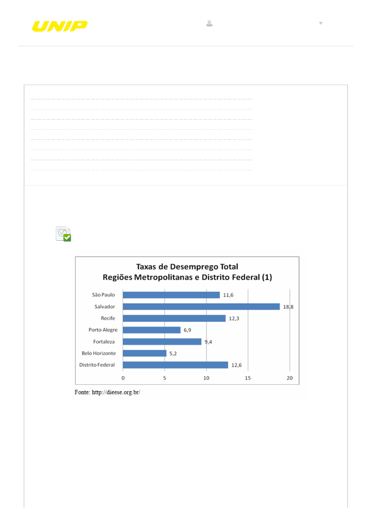 09/11/2018 Revisar envio do teste: AVALIAÇÃO - TI I – 6666-15_... https://ava.ead.unip.br/webapps/assessment/review/review.jsp?attempt_id=_10977700_1&course_id=_28404_1&content_id=_436639_1&return_… 1/8 Revisar envio do teste: AVALIAÇÃO - TI I ESTUDOS DISCIPLINARES III 6666-15_SEI_SS_0118_R_20182 CONTEÚDO Usuário ramon.lima4 @unipinterativa.edu.br Curso ESTUDOS DISCIPLINARES III Teste AVALIAÇÃO - TI I Iniciado 06/11/18 20:06 Enviado 09/11/18 12:44 Status Completada Resultado da tentativa 10 em 10 pontos Tempo decorrido 64 horas, 37 minutos Resultados exibidos Respostas enviadas, Perguntas respondidas incorretamente Pergunta 1 Resposta Selecionada: a. Os dados do grá�co seguinte foram gerados a partir de dados colhidos no conjunto de seis regiões metropolitanas e Distrito Federal pelo Departamento Intersindical de Estatística e Estudos Socioeconômicos (Dieese). Supondo que o total de pessoas pesquisadas na região metropolitana de Porto Alegre equivale a 250 000, o número de desempregados em agosto de 2012, nessa região, foi de: 17 250 Pergunta 2 CONTEÚDOS ACADÊMICOS BIBLIOTECAS MURAL DO ALUNO TUTORIAISUNIP EAD 1 em 1 pontos 1 em 1 pontos ramon.lima4 @unipinterativa.edu.br 1 09/11/2018 Revisar envio do teste: AVALIAÇÃO - TI I – 6666-15_... https://ava.ead.unip.br/webapps/assessment/review/review.jsp?attempt_id=_10977700_1&course_id=_28404_1&content_id=_436639_1&return_… 2/8 Resposta Selecionada: e. Em relação ao processo de urbanização brasileiro, no período de 1940 a 2000, analise o grá�co abaixo. A partir das informações constantes no grá�co, marque V para as a�rmativas verdadeiras e F para as falsas. ( ) O censo de 1940 registrou que, aproximadamente, 70% dos brasileiros viviam nas áreas rurais, evidenciando que a economia brasileira assentava-se no campo. ( ) A elevação da concentração populacional urbana, evidenciada pelo censo de 1950, foi resultado, em grande medida, do Plano de Metas, fundado pela ação conjunta entre Estado, capital privado nacional e estrangeiro. ( ) O censo de 1970 revelou que o país havia se tornado majoritariamente urbano, devendo- se esse fato ao chamado Milagre Econômico e às consequentes mudanças no capitalismo internacional. ( ) Nas duas últimas décadas do século XX houve expressiva concentração populacional urbana em decorrência da modernização no campo e da industrialização. Assinale a sequência correta: V, F, V, V Pergunta 3 Viver sem eletricidade afeta muitas dimensões do desenvolvimento humano. Os serviços de geração, distribuição e uso de energia desempenham um papel fundamental não apenas no apoio ao crescimento econômico e à geração de empregos, mas também no reforço da qualidade de vida das pessoas. Cerca de 1,6 bilhões de pessoas no mundo não têm acesso a tais serviços. A maioria vive na África subsaariana e no sul da Ásia, onde apenas cerca de um quarto das pessoas utiliza modernos serviços de energia. Essas pessoas vivem sem uma lâmpada elétrica em suas casas e dependem da queima de biomassa (madeira e estrume animal) para obter energia. Enquanto o acesso à energia está aumentando em todo o mundo em desenvolvimento, o progresso dessas nações continua lento e desigual. 1 em 1 pontos 09/11/2018 Revisar envio do teste: AVALIAÇÃO - TI I – 6666-15_... https://ava.ead.unip.br/webapps/assessment/review/review.jsp?attempt_id=_10977700_1&course_id=_28404_1&content_id=_436639_1&return_… 3/8 Resposta Selecionada: a. Sabendo que um IDH > 0,8 indica alto desenvolvimento humano, que 0,5 < IDH < 0,799 indica médio desenvolvimento humano e que IDH < 0,5 indica baixo desenvolvimento humano, pode-se dizer que o quadro acima mostra que: Sem a disponibilidade das modernas fontes de energia, não se atinge o alto desenvolvimento humano. Pergunta 4 A classi�cação de um país no quadro de medalhas nos Jogos Olímpicos depende do número de medalhas de ouro que obteve na competição, tendo como critérios de desempate o número de medalhas de prata seguido do número de medalhas de bronze conquistados. Nas Olimpíadas de 2012, o Brasil foi o vigésimo segundo colocado no quadro de medalhas, tendo obtido 3 medalhas de ouro, 5 de prata e 9 de bronze. Parte desse quadro de medalhas é reproduzido a seguir: 1 em 1 pontos 09/11/2018 Revisar envio do teste: AVALIAÇÃO - TI I – 6666-15_... https://ava.ead.unip.br/webapps/assessment/review/review.jsp?attempt_id=_10977700_1&course_id=_28404_1&content_id=_436639_1&return_… 4/8 Resposta Selecionada: b. Se o Brasil tivesse obtido mais 4 medalhas de ouro, 4 de prata e 10 de bronze, sem alteração no número de medalhas dos demais países mostrados no quadro, qual teria sido a classi�cação brasileira no quadro de medalhas das Olimpíadas de 2004? 12º Pergunta 5 Os dados estatísticos são referentes ao crescimento do índice de urbanização no Brasil. Urbanização é o aumento proporcional da população urbana em relação à população rural. I. Segundo os dados estatísticos, a urbanização ocorre no país devido à população urbana ser superior ao crescimento da população rural. II. O maior índice de urbanização ocorreu na região Sudeste, em que há os estados mais industrializados: São Paulo e Rio de Janeiro. III. Quanto maior o número do índice de urbanização no Brasil, maior o índice do êxodo 1 em 1 pontos 09/11/2018 Revisar envio do teste: AVALIAÇÃO - TI I – 6666-15_... https://ava.ead.unip.br/webapps/assessment/review/review.jsp?attempt_id=_10977700_1&course_id=_28404_1&content_id=_436639_1&return_… 5/8 Resposta Selecionada: a. rural. Assinale a alternativa correta: I, II e III Pergunta 6 Resposta Selecionada: d. O Índice de Desenvolvimento Humano (IDH) é uma medida comparativa de pobreza, alfabetização e esperança de vida para os diversos países do mundo. Seu cálculo resulta em valor que vai de 0 (zero) a 1 (um), sendo que, quanto mais próximo da unidade, mais desenvolvido é c