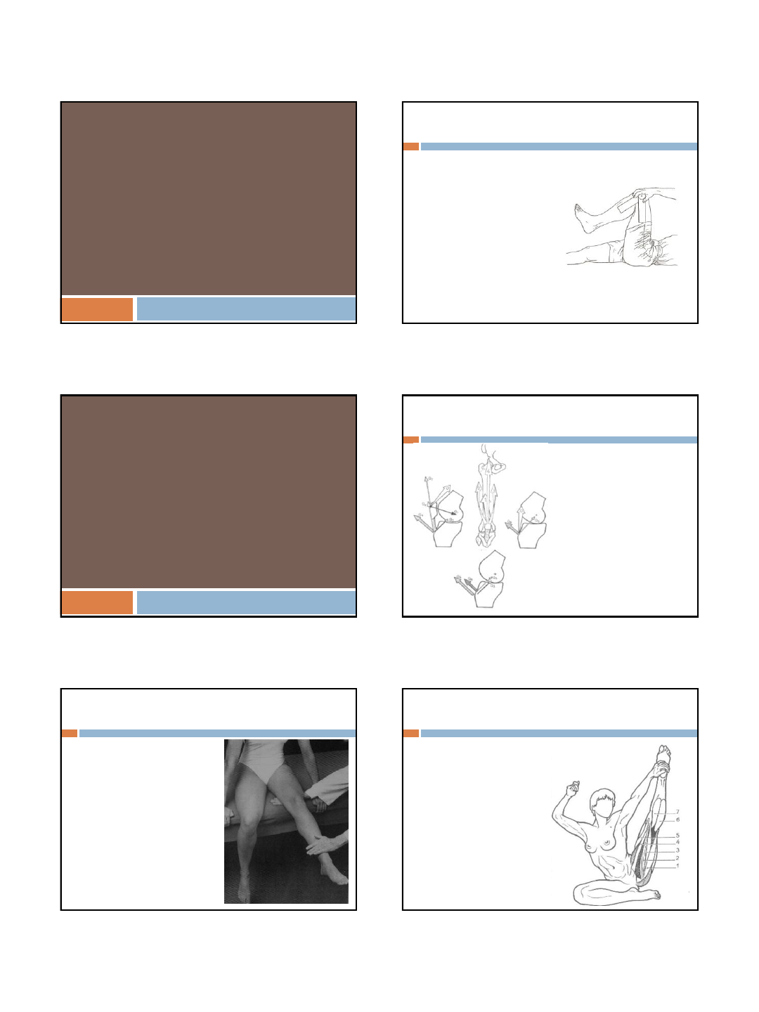 26/04/2019 1 GONIOMETRIA DO JOELHO Prof.ª Amanda Prof. Bernardo GONIOMETRIA FLEXÃO DE JOELHO (0-140º) Posição ideal: DD com joelho e quadril fletidos ou Sentado Braço fixo do goniômetro: paralelo à superfície lateral do fêmur dirigido para trocânter maior Braço móvel do goniômetro: paralelo à face lateral da fíbula dirigido para o maléolo lateral Eixo: sobre a linha articular do joelho PROVAS DE FORÇA E FUNÇÃO DO JOELHO EXTENSORES DO JOELHO 1. VASTO INTERMÉDIO 2. VASTO LATERAL 3. VASTO MEDIAL 4. RETO FEMORAL QUADRÍCEPS Paciente: Sentado Fixação: Apoiar sua mão debaixo da parte distal da coxa Prova: Extensão da articulação do joelho sem rotação da coxa Pressão: Contra a perna acima do tornozelo, na direção da flexão FLEXORES DO JOELHO 1. BÍCEPS FEMORAL 2. SEMITENDINOSO 3. SEMIMEMBRANOSO 4. ADUTOR LONGO 5. SARTÓRIO 6 - 7. GASTROCNÊMIO 26/04/2019 2 BÍCEPS FEMORAL Paciente: DV Fixação: Estabiliza a coxa sobre a mesa Prova: Flexão do joelho entre 50º e 70º com a coxa em leve RE e a perna em leve RE sobre a coxa Pressão: Contra a perna proximal ao tornozelo, na direção da extensão do joelho SEMIMENBRANOSO e SEMITENDINOSO Paciente: DV Fixação: Estabiliza a coxa firmemente sobre a mesa Prova: Flexão do joelho entre 50º e 70º, com a coxa em RI e a perna em RI sobre a coxa Pressão: Contra a perna proximal ao tornozelo, em direção à extensão do joelho ROTADORES DO JOELHO ROTADORES EXTERNOS 1. BÍCEPS FEMORAL 2. TENSOR DA FÁSCIA LATA ROTADORES INTERNOS 3. SARTÓRIO 4. SEMITENDINOSO 5. SEMIMEMBRANOSO 6. ADUTOR LONGO 7. POPLÍTEO POPLÍTEO – R.I. Paciente: Sentado com joelho fletido em ângulo reto e com perna em RE da tíbia Fixação: Nenhuma Prova: Rotação interna da tíbia sobre o fêmur Pressão: Raramente se aplica SARTÓRIO – R.I. Paciente: DD Fixação: Nenhuma Prova: Rotação externa, abdução, flexão do quadril e joelho Pressão: Contra a superfície ântero-lateral da coxa inferior, na direção da extensão, adução e rotação interna do quadril e extensão de joelho. ADUTORES – R.I. Paciente: DL em linha reta (direito para testar o lado direito e vice-versa) Fixação: Segurar a perna de cima em abdução Prova: Adução do membro de baixo no sentido superior (sem rotação, flexão ou extensão) Pressão: Contra a superfície medial da extremidade distal da coxa na direção da abdução (para baixo, no sentido da mesa). 26/04/2019 3 TENSOR F.LATA – R.E Paciente: DD Fixação: Nenhuma Prova: Abdução, flexão e rotação interna do quadril Pressão: Contra a perna na direção da extensão e adução Contratura: Flexão do quadril e geno valgo.