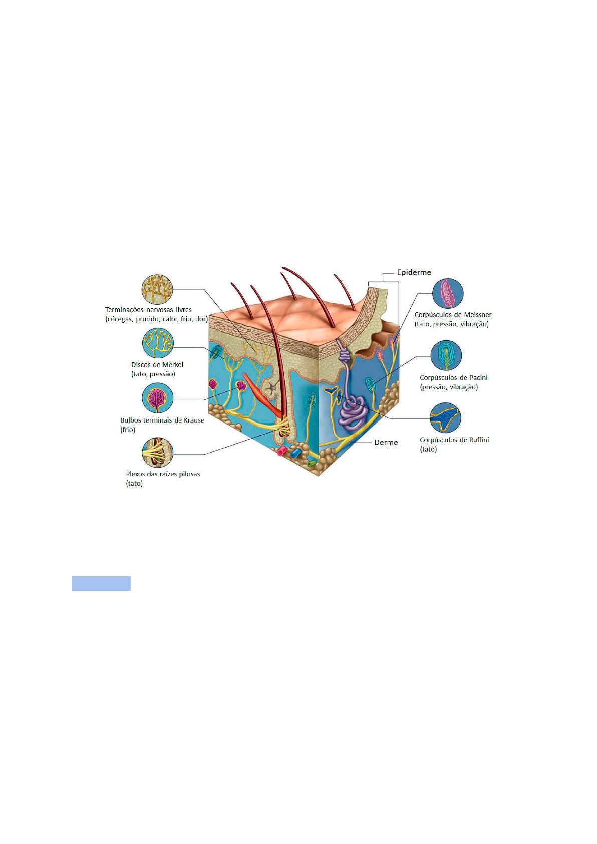 SISTEMA TEGUMENTAR TEGUMENTO = PELE e ANEXOS A pele reveste a área externa do corpo, sendo o maior órgão do corpo humano tanto em área de superfície quanto em peso. Possui 3 camadas: EPIDERME, DERME e HIPODERME. FUNÇÕES - Manter os órgãos em posição; - Proteger o organismo contra a perda d’água e atritos; - É um isolante térmico e controla a temperatura corporal; - É um órgão sensitivo (possui terminações nervosas); - Atua contra os raios UV (Melanina); - Formar vitamina D; - Eliminar escórias; - Pode refletir grande variedade de processos patológicos externos e internos. - Eliminar resíduos, agindo como sistema excretor. CAMADAS: - EPIDERME: Tecido epitelial estratificado pavimentoso queratinizado. (estratificado pois possui muitas camadas, pavimentoso pois é liso, e queratinizado pois possui queratinócitos). - DERME: Tecido conjuntivo frouxo (derme papilar) e Tecido conjuntivo denso não-modelado (derme reticular). - HIPODERME ou TECIDO CELULAR SUBCUTÂNEO ADIPOSO: Tecido conjuntivo adiposo, abaixo da derme. EPIDERME Tecido epitelial estratificado queratinizado; Queratinócitos abundantes; Apresenta 5 camadas: BASAL, ESPINHOSA, GRANULOSA, LÚCIDA, CÓRNEA. TIPOS DE CÉLULAS: - QUERATINÓCITOS: Produzem QUERATINA, proteína importante para a proteção da pele, dá cor branca-amarelada da pele; - MELANÓCITOS: Produzem MELANINA, protege o DNA das células contra os raios UV, se encontram na junção da epiderme com a derme, citoplasma globoso e prolongado, dá cor marrom à pele. - LANGERHANS: Muito ramificada, toda epiderme (espinhosa), MO, capta antígenos (defesa imunológica da pele): reações imunitárias cutâneas. - MERKEL: Maior quantidade na pele espessa (“ponta dos dedos”), parte profunda da epiderme, apoiadas na membrana Basal e presas aos Queratinócitos, possuem terminações nervosas tendo função sensorial e sensitiva. CAMADAS: A PELE ESPESSA é constituída pelas 5 camadas, e a PELE FINA é constituída por apenas 3: BASAL, ESPINHOSA e CÓRNEA. CAMADA BASAL: - Células prismáticas e cubóides; - Células repousadas sobre a membrana Basal; - Possui Queratina, constituí metade das proteínas da Camada Córnea; - Responsável pela constante renovação da epiderme. CAMADA ESPINHOSA: - Células cubóides ou ligeiramente achatadas, núcleo central; - Citoplasma com curtas expansões que contém feixes de filamento de Queratina (Tonofilamentos); - Resistência à atritos; - Desmossomos que aderem às células, mais espessa. CAMADA GRANULOSA - Apenas 3 - 5 filamentos celulares poligonais achatados, núcleo central; - Citoplasma repleto de granulas de Querato-hialina (Queratina mole); - Grânulos lamelares se fundem com a membrana plasmática e expulsam seu conteúdo no espaço intercelular (entre as células) da camada granulosa, lipídio se deposita; - Permeabilidade à pele. CAMADA LÚCIDA - Mais evidente e espessa; - Constituída por uma delgada camada de células achatadas e translúcidas; - Ausência de núcleo e organelas citoplasmáticas; - Citoplasma numerosos e filamentos de Queratina compactados. CAMADA CÓRNEA - Espessura muito variável; - Células achatadas, mortas e sem núcleo; - Citoplasma repleto de Queratina; - Tonofilamentos se modificam à medida que os Queratinócitos se diferenciam. DERME É a camada intermediária da pele, dá sustentação para a Epiderme, sendo a mais espessa das 3 camadas. Rica em Fibroblastos, células responsáveis pela produção de colágeno e elastina, proteínas que dão sustentação ao tecido. Dividem-se em 2 camadas: PAPILAR e RETICULAR. DERME PAPILAR: - Tecido conjuntivo frouxo, contém fibras de colágeno (superficial); - Capilares, fibras elásticas, fibras reticulares e colágeno. DERME RETICULAR: - Tecido conjuntivo denso não modelado, mais espessa, muitas fibras elásticas (camada mais profunda da derme); - Unhas, pelos/cabelos, glândulas sebáceas e sudoríparas; - Vasos sanguíneos e linfáticos e terminações nervosas que dão sensação de toque, dor, pressão e temperatura; A quantidade varia conforme a região do corpo, tornando algumas áreas mais sensíveis que as outras; - Também podem ser encontrados, em menor quantidade, macrófagos e mastócitos. CÉLULAS: - FIBROBLASTOS: são células fixas e alongadas, com citoplasma abundante, rico em retículo endoplasmático, aparelho de Golgi bem desenvolvido, além de inúmeros prolongamentos, o núcleo é grande e ovóide, apresentando um ou mais núcleos evidentes. São responsáveis pela produção de fibras e de uma substância gelatinosa, a substância amorfa, na qual os elementos dérmicos estão mergulhados. Também produzem fatores de crescimento, que atuam no metabolismo celular, como ocorre nos processos de cicatrização; - MACRÓFAGOS: estão relacionados à defesa do organismo, sendo envolvidas nas respostas imunitárias do organismo. São capazes de ingerir e destruir bactérias e células danificadas a partir de um processo chamado fagocitose Por exemplo, as tatuagens: ao morrer, um macrófago deixa como “herança” o pigmento que foi ingerido, que serão incorporados novamente pela nova célula; - MASTÓCITOS: são um importante componente da derme, apresentam forma alongada quando aderidos ao tecido conjuntivo. Apresentam grande quantidade de grânulos citoplasmáticos, poucas mitocôndrias, retículo endoplasmático, e complexo de Golgi, são pouco desenvolvidos e possuem núcleo central. São células ligadas a alergias e inflamação, envolvidas em processos como aparecimento de edemas, vermelhidão e coceiras; - PLASMÓCITOS: É uma célula agranulócita de aspecto ovóide, abundantes em locais sujeitos à penetração de bactérias, como a pele, são células anti-inflamatórias responsáveis por produzir uma proteína chamada globulina que sintetiza anticorpos contra substâncias e organismos estranhos que invadem o tecido conjuntivo; - LINFÓCITOS: São células pequenas e redondas no sangue e nos órgão