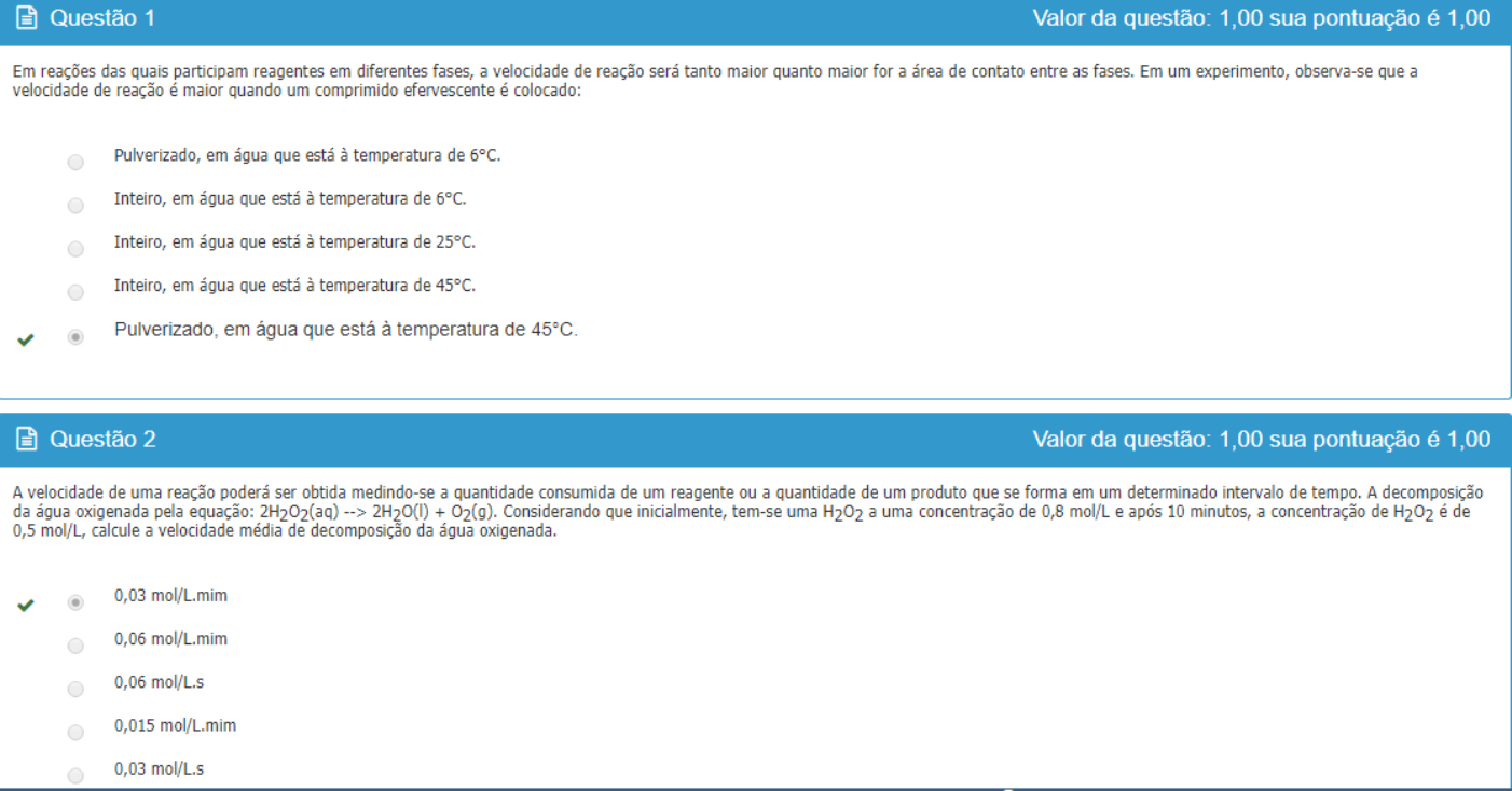 Físico química 1-De acordo com a equação abaixo é realizada segundo dois procedimentos: NaHSO4+CH3COONa → CH3COOH + Na2SO4. I. Triturando reagentes sólidos. II. Misturando soluções aquosas concentradas dos reagentes. Qual a alternativa que melhor atende quando se utiliza a mesma quantidade de NaHSO4 e mesma quantidade de CH3COONa nesses procedimentos, à mesma temperatura, a formação do ácido acético: ocorre em I e II com igual velocidade porque os reagentes são os mesmos. mais rápida em I porque no estado sólido a concentração dos reagentes é maior. mais rápida em II porque o ácido acético se dissolve na água. mais rápida em II porque em solução a frequência de colisões entre os reagentes é maior. mais rápida em I porque o ácido acético é liberado na forma de vapor. 2-A velocidade de uma reação poderá ser obtida medindo-se a quantidade consumida de um reagente ou a quantidade de um produto que se forma em um determinado intervalo de tempo. A decomposição da água oxigenada pela equação: 2H2O2(aq) --> 2H2O(l) + O2(g). Considerando que inicialmente, tem-se uma H2O2 a uma concentração de 0,8 mol/L e após 10 minutos, a concentração de H2O2 é de 0,5 mol/L, calcule a velocidade média de decomposição da água oxigenada. 0,03 mol/L.mim 0,06 mol/L.s 0,03 mol/L.s 0,06 mol/L.mim 0,015 mol/L.mim 3-O gráfico a seguir representa a variação de concentração das espécies A, B e C com o tempo: Qual das alternativas a seguir contém a equação química que melhor descreve a reação representada pelo gráfico? 2A + B → C B + C → A A → 2B + C 2B + C → A B + 2C → A 4-A reação entre o dióxido de nitrogênio e o ozônio, que forma trióxido de nitrogênio é uma das principais responsáveis pela poluição urbana. NO2(g) + O3(g) → NO3(g) + O2(g) Utilizando os dados a seguir para a equação fornecida, determine a expressão da velocidade e o valor da constante da velocidade desse processo: v = k · [NO2] e 2,2. 10 7 v = k · [NO2] + [O3] e 2,2. 10 7 v = k · [NO2] [O3] e 1,5. 10 7 v = k · [NO2] [O3] e 2,0. 10 7 v = k · [O3] e 4,4. 10 7 5-É natural pensarmos que ao se atingir o equilíbrio, a reação química para. Entretanto, isso não é verdade, pois no equilíbrio a velocidade de reação inversa é igual à da reação direta, o que faz com que as concentrações de todas as espécies se mantenham constantes. De acordo com a reação N2(g) + 3H2(g) <----> 2NH3(g), se 1,0 mol de N2 e 3,0 mols de H2 forem adicionados em um recipiente de 1,0 litro e depois de estabelecido o equilíbrio, o conteúdo do recipiente analisado foi 0,325 mol L-1 de N2, 0,975 mol L -1 de H2 e 1,350 mol L -1 de NH3, qual será o valor da constante de equilíbrio? 0,17 4,21 6,05 7,58 5,05 6-0,100 mols de PCl5 é colocado em um recipiente de 2,0 litros a 160°C. Após estabelecido o equilíbrio PCl5(g) <--> PCl3(g) + Cl2(g). Quais as concentrações de todas as espécies sabendo-se que o Kc é 2,11 x 10-2? [PCl3] e [Cl2] = 0,0236 mol L -1; [PCl5] = 0,0236 mol L -1. [PCl3] e [Cl2] = 0,0136 mol L -1; [PCl5] = 0,0264 mol L -1. [PCl3] e [Cl2] = 0,0264 mol L -1; [PCl5] = 0,0236 mol L -1. [PCl3] e [Cl2] = 0,0236 mol L -1; [PCl5] = 0,0264 mol L -1. [PCl3] e [Cl2] = 0,0136 mol L -1; [PCl5] = 0,0164 mol L -1. 7-Hidrogênio e iodo gasosos, foram misturados em condições reacionais adequadas gerando HI como produto através de uma reação endotérmica. A reação, em estado de equilíbrio, é representada por: H2(g) + I2(g) → 2 HI(g). Em um recipiente com capacidade de 2,0 L foram colocados 1 mol de H2 e 1 mol de I2. Após ter estabelecido o equilíbrio a 430 oC, verificou-se que o valor da constante de equilíbrio foi 49. As concentrações em mol.L-1no equilíbrio das espécies H2, I2, e HI são respectivamente: 0,111 M, 0,111 M e 0,778 M 0,446 M, 0,446 M e 3,108 M 1,554 M, 0,223 M e 0,223 M 0,778 M, 0,111 M e 0,111 M 0,223 M, 0,223 M, e 1,554 M 8- + 177 kJ.mol-1 + 585 kJ.mol-1 - 204 kJ.mol-1 - 558 kJ.mol-1 + 558 kJ.mol-1