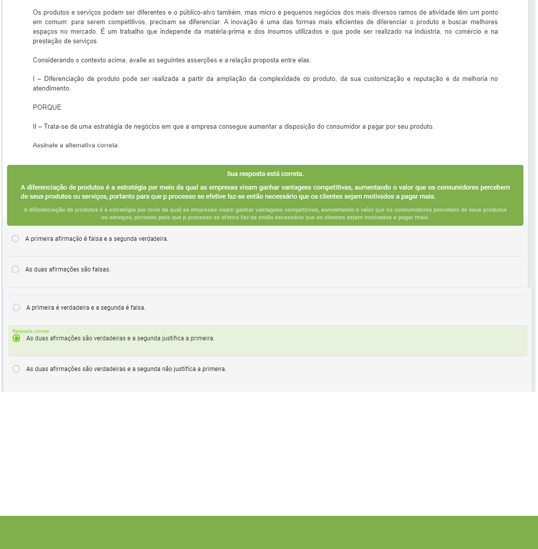 Unidade de ensino 3 - Inovação tecnológica e estratégia competitiva 5 questões - acertei tudo 100% Questão 1 Sua resposta está correta. A diferenciação de produtos é a estratégia por meio da qual as empresas visam ganhar vantagens competitivas, aumentando o valor que os consumidores percebem de seus produtos ou serviços, portanto para que p processo se efetive faz-se então necessário que os clientes sejam motivados a pagar mais. A diferenciação de produtos é a estratégia por meio da qual as empresas visam ganhar vantagens competitivas, aumentando o valor que os consumidore Questão 2: Sua resposta está correta. as estratégias organizacionais são ações que criam uma proteção ou até uma ação sobre um concorrente para criarem uma posição de defesa, em uma área de negócio, garantindo que a organização alcance o seu objetivo. As estratégias organizacionais são ações que atuam como guias para que a organização alcance o destino final, ou seja, seu objetivo. Questão 3: Sua resposta está correta. A diferenciação de produto é uma estratégia de negócios na qual uma empresa busca ganhar vantagem competitiva aumentando o preço de seus produtos/serviços em relação aos preços dos concorrentes. A diferenciação de produtos é a estratégia por meio da qual as empresas visam ganhar vantagens competitivas, aumentando o valor, e não os preços, que os consumidores percebem de seus produtos ou serviços, em relação ao que os consumidores sentem aos concorrentes. Questão 4: Sua resposta está correta.A diferenciação de produtos é a estratégia por meio da qual as empresas visam ganhar vantagens competitivas, aumentando o valor, e não os preços, que os consumidores percebem de seus produtos ou serviços, em relação ao que os consumidores sentem aos concorrentes. A diferenciação de produtos é a estratégia por meio da qual as empresas visam ganhar vantagens competitivas, aumentando o valor, e não os preços, que os consumidores percebem de seus produtos ou serviços, em relação ao que os consumidores sentem aos concorrentes. Questão 15 Sua resposta está correta.Com a entrada da internet no cenário ela passa a atender as necessidades dos clientes dos Correios de uma forma diferenciada. Agindo como um produto substituto aos serviços dos Correios Com a entrada da internet no cenário ela passa a atender as necessidades dos clientes dos Correios de uma forma diferenciada. Agindo como um produto substituto aos serviços dos Correios. Questão aberta unidade 3 Pergunta: “Há muitas formas de competir no mercado. Há possibilidades de se sobressair em relação a seus concorrentes através de preços, custos, tipo de recursos utilizados, qualidade do serviço, entre outros. Mas o essencial é diferenciar seus produtos da concorrência através de estratégias que sejam sustentáveis tanto para o cliente, quanto para a sua empresa”. Fonte: https://www.promoline.com.br/blog/index.php/diferenciar-seus-produtos/ Diante do texto exposto acima explique como a diferenciação de produtos pode gerar uma vantagem competitiva para as organizações. Resposta esperada: Diferenciar seus produtos da concorrência é tão importante, pois pode gerar vantagem competitiva à sua empresa. Isso acontece se os produtos e serviços oferecidos agregarem mais valor aos clientes e, ao mesmo tempo, não puderem ser copiados. Isso faz com que a empresa gere receita e ao mesmo tempo crie valor aos seus clientes. Resposta que eu dei: Ter uma vasta gama de produtos, além de ser mais rentável, trás uma vantagem competitiva e organizacional. A organização pode por exemplo, trazer promoções onde sua margem de lucro será menor, para valorizar um produto específico, e em contrapartida, aumentar o lucro em outro setor de produtos. E claro, num tempo determinado. Também, em relação à diferenciação de produtos, em termos de trazer benefícios e vantagens sobre o seu produto em detrimento da concorrência, trás uma vantagem competitiva, pois é uma estratégia de demonstrar ao consumidor que sua empresa pensa na necessidade, na opinião, bem como entende bem o cliente, issso faz com que o cliente se identifique mais com o eu produto. Unidade de ensino 4 - Aspectos legais da inovação e apropriação de resultados