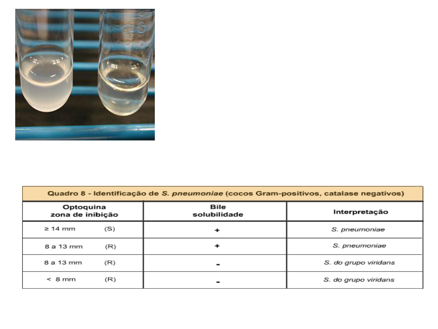 Procedimento: Preparar uma suspensão bacteriana densa a partir da cultura recente; Separar dois tubos de ensaio , marcar um com “C” (tubo controle) e outro com “T” (tubo teste); Adicionar solução de desoxicolato de sódio a 2% ao tubo “T” e solução salina a 0,85% ao tubo “C”. Adicionar a cada tubo o mesmo volume, por exemplo, 0,5 mL da suspensão bacteriana; Homogeneizar e fazer a leitura imediatamente, após 1 h e até 2 h de incubação a 35±2ºC. G R U P E D H I N S T I T U T O Educação em Saúde Diferenciação dos Streptococcus agalactiae e S.pyogenes A identificação de espécies de Streptococcus β- hemolítico pode ser realizados pela prova de aglutinação com soro específico contra os antígenos de Lancefield (A,B,C,D,F e G). Esta é uma prova rápida, porém de alto custo. Teste de CAMP: O teste visa a identificação de cepas de S. agalactiae (grupo B). Estas cepas produzem o fator CAMP (Christie, Atkins e Munch-Petersen) que atua sinergicamente com a β-hemolisina produzida pelo Staphylococcus aureus em ágar sangue. Positivo: A formação de uma seta ou meia-lua convergindo para o S.aureus na intersecção do crescimento das duas bactérias indica que o teste é positivo Negativo: Se não houver formação de seta ou meia-lua, o teste é negativo e a cepa não pertence ao grupo B de Lancefield. Procedimento: Semear Staphylococcus aureus ATCC 25923 de um ponto a outro da placa de ágar sangue; Semear perpendicularmente (90°) a colônia de Streptococcus β-hemolítico a ser testada, sem que haja o contato com a estria de Staphylococcus aureus; Incubar a 35±2ºC em atmosfera de 5% de CO2 por 48 h G R U P E D H I N S T I T U T O Educação em Saúde Teste de PYR: determina a atividade da enzima pyrrolidonil aminopeptidase produzida pelo S. pyogenes. Colônias β-hemolíticas de Enterococcus podem ser confundidas com S. pyogenes, pois ambas apresentam positividade neste teste. Positivo: Apresenta o desenvolvimento de cor vermelha; Negativo: Coloração amarela ou alaranjada Procedimento: Com auxílio de uma pinça, colocar um disco de PYR sobre uma lâmina ou placa de Petri vazia; Pingar uma gota de água destilada estéril ; Realizar um esfregaço com a bactéria a ser testada, recém-isolada, sobre o disco de PYR umedecido; Aguardar alguns minutos e colocar uma gota do reagente PYR. PYR Neg. Pos. Obs.: O Teste de Hidrólise de hipurato, que forma glicina e ácido benzoico, pode ser usado para identificação de S. agalactiae, tem o mesmo valor que o teste de CAMP. G R U P E D H I N S T I T U T O Educação em Saúde Teste de Bacitracina: O teste tem a finalidade de diferenciar S. pyogenes de outras cepas do grupo A ou de outras espécies com colônias β-hemolíticas PYR positivas. Positivo: A presença de qualquer halo de inibição ao redor do disco é interpretado como sensibilidade a bacitracina e indicativo de S. pyogenes. Procedimento: Colocar um disco de 0,04 U de bacitracina em uma placa de ágar sangue de carneiro que tenha um inóculo com 4 ou 5 colônias puras de Streptococcus spp. a ser testado. Incubar 12 horas (overnight) a 35± 2ºC Teste de Bile esculina: A prova de Bile-Esculina é baseada na capacidade de algumas bactérias hidrolisarem esculina em presença de bílis. Positivo: formação um complexo negro, Enterococcus e dos S. do grupo D. Os S. pyogenes são negativos G R U P E D H I N S T I T U T O Educação em Saúde G R U P E D H I N S T I T U T O Educação em Saúde Diferenciação dos Enterococcus, Streptococcus do grupo D e Outros Streptococcus Todos os Enterococcus sp. e os Streptococcus do grupo D (S. bovis) são positivos no teste de bile esculina os outros são negativos. Teste de crescimento em NaCl 6,5%: Capacidade do microrganismo crescer em altas concentrações de sal. Tem por finalidade diferenciar Enterococcus spp. de Streptococcus spp. Positivo: A turvação ou mudança de cor do meio indica o crescimento de bactérias Enterococcus Procedimento: Inocular 2 a 3 colônias a serem testadas em um caldo BHI suplementado com 6,5% de NaCl ; Incubam-se a 35±2ºC por até 72 h. G R U P E D H I N S T I T U T O Educação em Saúde G R U P E D H I N S T I T U T O Educação em Saúde Teste de motilidade: indica indiretamente a produção de flagelos. A prova é efetuada inoculando-se em linha reta, através da técnica da punctura (com agulha), 2/3 de um meio semi-sólido. Positivo: quando os microrganismos crescem deslocando-se da linha de inoculação, turvando o meio. Negativa: quando os microrganismos ficam restritos ao local da inoculação sem, contudo, turvar o meio. Teste de carboidrato: Existem diversos testes convencionais que levam à identificação das espécies de Enterococcus e gêneros relacionados, dentre eles a detecção da produção de ácido a partir de diferentes carboidratos: arabinose , sorbitol. Positivo: O meio mudar de cor indicando a presença de ácidos Negativo: O meio permanece na cor natural G R U P E D H I N S T I T U T O Educação em Saúde G R U P E D H I N S T I T U T O Educação em Saúde RESULTADOS DOS TESTE PARA ENTEROBACTERIAS MEIO DE EPM (ágar inclinado verde): Permite a leitura das provas do LTD, Glicose, Gás e H2S. O LTD (desaminação doL-Triptofano) é evidenciado pelo desenvolvimento de cor verde-garrafa no ápice do tubo. A leitura da Glicose é feita pela observação de coloração amarela na base do tubo, com ou sem produção de gás, evidenciado pela ruptura do meio ou a formação de bolhas. 3. A produção de gás sulfídrico é verificada pelo aparecimento de cor negra. CALDO LISINA (caldo púrpura) : Permite a leitura da reação de descarboxilação da L-Lisina. A cor amarela brilhante revela uma reação negativa e qualquer cor diferente de amarelo é considerado positivo. CALDO RHANMOSE: Usa este açúcar no metabolismo Amarelo: positivo Verde: negativo G R U P E D H I N S T I T U T O Educação em Saúde MEIO DE MIO (meio semi-sólido púrpura): Permite a