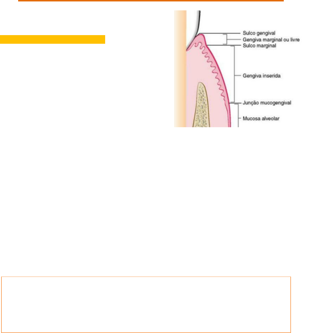 ANATOMIA MACROSCOPICA – 1ª AULA Porque a gengiva é o artista principal? Porque conseguimos analisar clinicamente. Periodonto de proteção gengiva Periodonto de sustentação osso alveolar e cemento radicular A gengiva é um periodonto de proteção porque ela esta externamente, ou seja, em volta do dente, protegendo-o tanto fisicamente quanto histologicamente. Na cavidade bucal temos 3 tipos de mucosa: MUCOSA MASTIGATÓRIA gengiva Cobre o processo alveolar, faz o colarinho cervical no elemento dentário (para resistir aos impactos da mastigação), então a gengiva também se insere no cemento, ou seja, a gengiva se insere tanto no osso quanto no cemento. MUCOSA DE REVESTIMENTO toda mucosa q reveste a cavidade bucal – lábios, bochecha, assoalho da língua essa mucosa tem características elásticas (então a principal composição da mucosa são as fibras elásticas porque a mucosa tem que ter essa expansão na hora da fala, na hora de ingerir alimentos..) diferente da gengiva que precisa de resistência, então a gengiva é uma mucosa diferenciada, é uma mucosa mastigatória, sendo então queratinizada. Alem disso, a composição da gengiva é colágena, diferente da de revestimento. MUCOSA ESPECIALIZADA dorso da lingua Diferença entre osso alveolar e processo alveolar. Osso alveolar é o osso que forma o alvéolo dentário, ou seja, é o alvéolo dentário, osso dependente. Processo alveolar é a base da mandíbula e da maxila onde esta inserido o osso alveolar (alvéolo dentário) O que acontece com o dente que não tem gengiva? Ele perde a proteção. E quando ocorre essa recessão gengiva? Quando ocorre perda óssea em uma determinada região e a gengiva acompanha a perda óssea. E por que a gengiva acompanha a perda óssea? Porque a vascularização da gengiva é proveniente do periósteo, e no momento que perde osso/periósteo, a gengiva não tem nutrição e por isso necrosa. Então para ter recessão gengival, tem que ter perda óssea. A gengiva vai ser dividida em algumas regiões: GENGIVA MARGINAL/ GENGIVA MARGINAL LIVRE/GENGIVA LIVRE a gengiva não esta inserida no dente mas sim sobre o esmalte. Coloração rosa, superficie opaca, consistência firme vai ate a ranhura gengival livre RANHURA GENGIVAL = é uma linha que passa na junção cemento-esmalte , ou seja, separa a gengiva livre da gengiva inseridaa gengiva normalmente cobre a JCE sendo uma proteção a mais. A JCE é uma área bem sensível porque muitas vezes se tem uma falha: aonde acaba o esmalte, não necessariamente começa o cemento, tendo dentina exposta fazendo o paciente apresentar uma quadro de hipersensibilidade dentinaria. Faixa de gengiva que esta na cora dentaria. LIVRO A gengiva marginal, ou não inserida, é a porção terminal ou borda da gengiva aoredor dos dentes em forma de colar . Em torno de 50% dos casos, ela é demarcada da gengiva inserida adjacente por uma depressão linear rasa, o sulco gengival livre.3 Normalmente medindo aproximadamente 1 mm de largura, a gengiva marginal forma a parede de tecido mole do sulco gengival e pode ser separada da superfície dental com uma sonda periodontal. GENGIVA INSERIDA esta inserida no cemento e no osso. Vai desde a ranhura gengival livre ate a junção mucogengival. Coloração rosa, consistência firme e o aspecto de casca de laranja é visível em algumas pessoas mas não caracteriza estado de normalidade ou não. É muito importante na proteção, podendo variar de 1mm ate 9mm de largura LIVRO A gengiva inserida é contínua com a gengiva marginal. Ela é firme, resiliente e fortemente ligada ao periósteo do osso alveolar subjacente. O aspecto vestibular da gengiva inserida se estende à mucosa alveolar relativamente frouxa e móvel e é demarcada pela junção mucogengival A faixa da gengiva inserida é muito fina em alguns pacientes, estando mais susceptível a retração. Mas independente da faixa, todos tem proteção. Logo, se um paciente que tenha um faixa gengvial inserida mais fina escovar os dentes de forma traumática sofrera mais do um paciente que possui uma faixa gengival inserida maior. Por isso, hoje em dia prestamos muita atenção No FENOTIPO, que a pouco tempo atras não se falava muito, tratando todo mundo como se o periodonto fosse igual. O sulco de um paciente com periodonto fino é muito mais raso do que um paciente com periodonto espesso que o sulco vai ser mais fundo. Entre a gengiva inserida e a mucosa encontra-se a linha muco-gengival que separa a gengiva da mucosa. Podendo ser observada diferenças entre a gengiva e a mucosa: Gengiva é mais opaca por ser constituída por colágeno e queratina e é firme Mucosa é mais vermelha por conta da maior vascularização e possui consistência amolecida GENGIVA PAPILAR gengiva que preenche o espaço interproximal. Para ter essa papila ocupando o espaço interproximal precisa que o osso esteja próximo a região (precisa sempre ter osso para ter gengiva). Quando perdemos osso e esse osso é reabsorvido nesses espaços, acontece o que chamamos de Black space (buraco negro) as papilas piramidais na região anterior e achatada na região posterior. A papila se forma a partir do ponto de contato, na região anterior o dente é muito delgado, então ao encostar um dente no outro, temos apenas um ponto de contato, ficando mais pontiaguda/piramidal. A partir do momento que vai para a região posterior a área de contato aumenta, então ao encostar um dente no outro, não é mais um ponto de contato e sim uma área, ficando mais achatada ou conhecida como COL (papila achatada formato em cela) LIVRO A forma da gengiva em um determinado espaço interdental depende do ponto de contato entre dois dentes adjacentes e da presença ou ausência de algum grau de retração. Na nossa boca tem bactéria mesmo na saúde, ninguém é ‘germe-free’’/ sem bactéria, mas são bactérias que vivem em harmonia com a nossa cavidade bucal em estado de saúde. Essa harmonia é chamada de SIMBIOSE