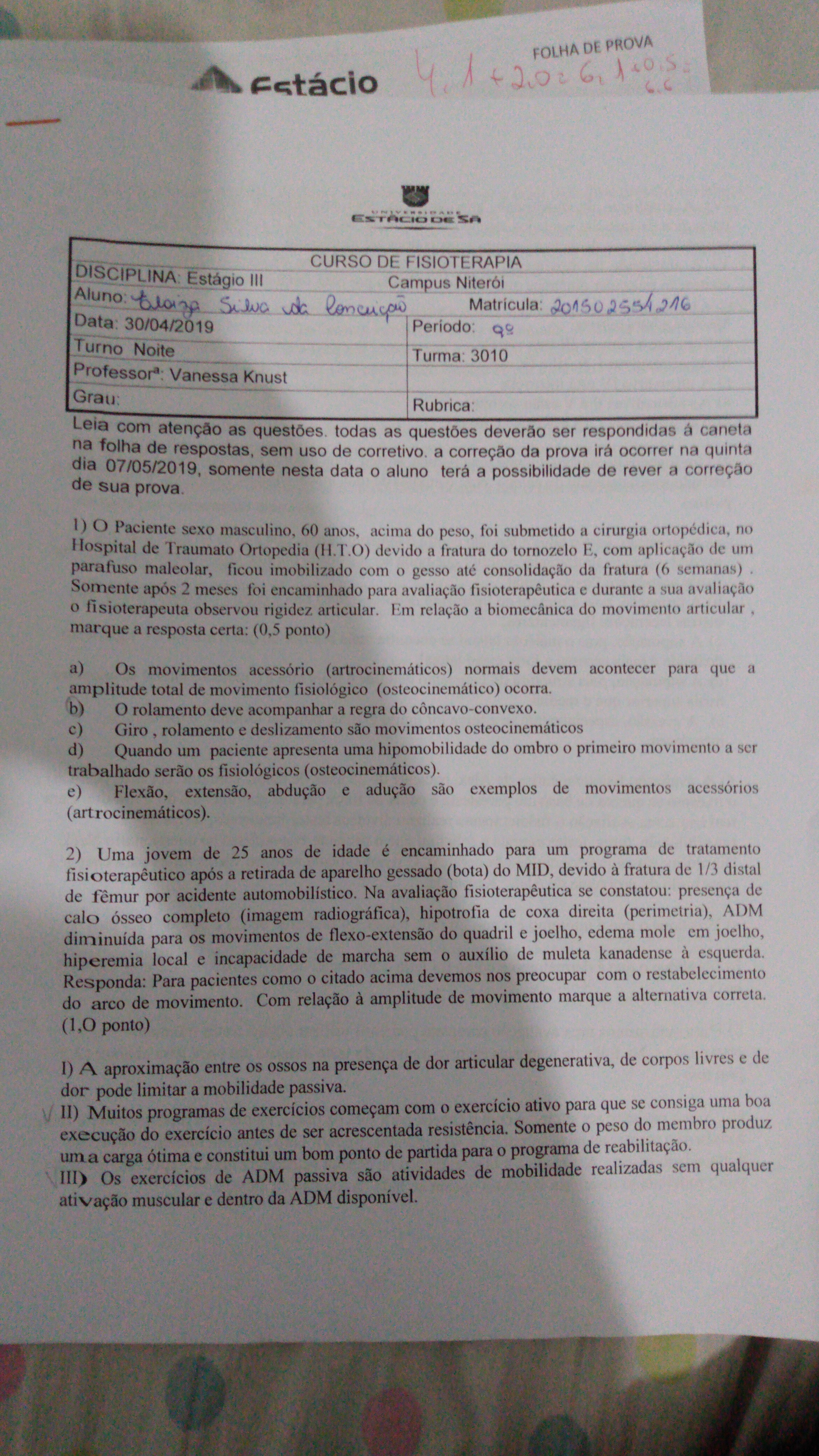 Paciente sexo masculino, 60 anos, acima do peso, foi submetido a cirurgia ortopedica, no Hospital de Traumato Ortopedia (H.T.O) devido a fratura do tornozelo E, com aplicacao de um parafuso maleolar, ficou imobilizado com gesso ate consolidacao da fratura (6 semanas) Somente apos 2 meses foi encaminhado para avaliacao fisioterapeutica durante a sua avaliacao fisioterapeuta observou rigidez articular. Em relacao a biomecanica do movimento articular marque a resposta certa: (0,5 ponto) a) Os movimentos acessorio (artrocinematicos) normais devem acontecer para que a amplitude total de movimento fisiologico (osteocinematico) ocorra. b) rolamento deve acompanhar a regra do concavo-convexo. c) Giro rolamento e deslizamento sao movimentos osteocinematicos. d) Quando um paciente apresenta uma hipomobilidade do ombro primeiro movimento a ser trabalhado serao fisiologicos (osteocinematicos). e) Flexao, extensao, abducao e aducao sao exemplos de movimentos acessorios (artrocinematicos).
