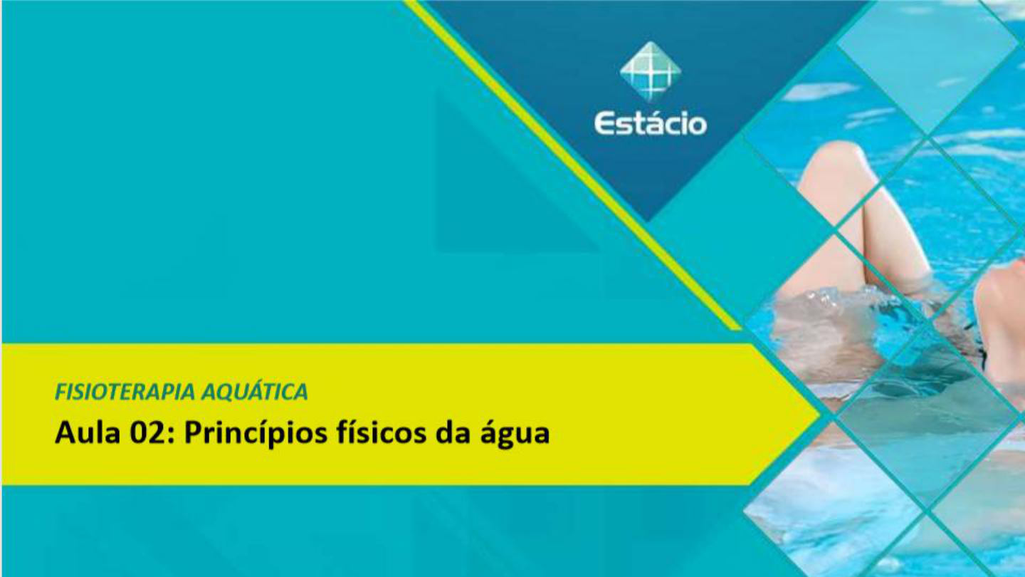 Densidade do líquido +Densidade +Flutuação Profundidade: +profundidade +maior a pressão A PH influencia diretamente na descarga de peso sobre o corpo imerso. O que acontece é que quando relaxa-se os músculos da caixa torácica e ela então expande, diminuindo a densidade do corpo. Relaxar facilita a flutuação! Arquimedes: o empuxo é a força exercida pela água com intensidade igual ao peso do volume de água deslocado pelo corpo submerso e com direção igual da força peso, mas com sentido contrário. VIDEO: https://www.youtube.com/watch?v=99uQFnZMXCE FLUTUAÇÃO A flutuação pode ser : assistente (assistiva) resistente (resistiva) de apoio (suporte). A força resistiva da tensão superficial torna-se uma variável ativa na medida em que a área da superfície aumenta. Um mergulhador que penetra na água na posição vertical desloca pouca água, assim o gasto energético será menor no seu deslocamento do ar para água. enquanto que uma pessoa que mergulha na água de “barriga” irá deslocar mais água no momento do impacto e seu gasto energético será maior. A condutividade térmica, é a capacidade de um material conduzir calor. Da água é cerca de 23 vezes maior do que do ar, fazendo com que troquemos muito mais calor (e mais rapidamente) com a água do que com o ar. CALOR ESPECIFICO Para a fisioterapia aquática, temperaturas da ordem de 32 ºC são geralmente recomendáveis, mas podem chegar a até 35 ºC. Para a prática de atividades mais intensas como corrida na água ou natação as temperaturas baixam consideravelmente são da ordem de 22 a 27 ºC. “Se a temperatura da água for maior que o corpo, esse vai aquecer através da transferência de energia calórica, a partir da água, e a água resfria através da perda de energia calórica para o corpo” A transferência de calor de um corpo para outro ocorre mediante a diferença de temperatura, o calor flui do corpo de maior temperatura para o corpo de menor temperatura Transferência de energia térmica A utilidade da terapia pela água depende tanto da sua capacidade de reter calor, quanto de transferir energia em forma de calorias. EX : àgua da pscina –> corpo –> Suor Condução: consiste na transferência de energia entre as partículas formadoras do corpo, sem que ocorra o transporte de matéria. A transmissão de calor pode ocorrer de três formas: condução, convecção e irradiação. CONVECÇÃO: Processo que ocorre nos fluidos (líquidos, gases e vapores) em razão das diferenças na densidade dos fluidos envolvidos no sistema, onde ocorre uma transferência de calor por meio do movimento em massa de grandes quantidades de moléculas ao longo de uma grande distância. IRRADIAÇÃO: ao contrário dos processos de condução e convecção que necessitam de um meio material para a transferência de calor, a irradiação é o processo que pode acontecer sem que exista meio material. O principal mecanismo de dissipação de calor corporal é por convecção, quando o sangue, aquecido na região central do corpo, se desloca para a pele e pulmões, onde se encontra com o ar mais frio, permitindo a perda de calor por evaporação, suor e troca respiratória que resfriam ainda mais a pele. A transferência de calor é diretamente proporcional a velocidade do movimento, assim uma pessoa que se movimenta na água perde mais calor do que aquele que fica parado A água em movimento pode ter muitas características. Em um fluxo suave, como de um rio com pouca correnteza, podemos classificar como fluxo laminar ou corrente. Movimento de fluxo Os principais determinantes do movimento da água são a viscosidade, a turbulência e a velocidade. VISCOSIDADE Temperatura Viscosidade Pressão Quando ocorre o movimento de um objeto em relação a um líquido, ele sofre efeitos resistivos desse líquido que determina uma força chamada força de arrasto. Quando nos movemos em velocidade através de um líquido, aumentamos a força de arrasto. Esse efeito que causada pela força do arrasto é chamado de efeito esteira Força de arrasto A viscosidade, com todas as suas propriedades físicas agregadas, é a qualidade que torna a água um meio eficaz para trabalhos direcionados para o fortalecimento muscular, pois sua resistência aumenta à medida que mais força é exercida contra ela, embora ao cessar essa força sua resistência caia a zero instantaneamente. Resistência CHEGAR antes para Trocar de Roupa ( +ou- 20 min ) 20:10 Orientações e Ambientação 20:30 Entrada na Pscina 09:45 Prazo Máximo pra deixar a Pscina ATENÇÂO AULA PRÀTICA 26/02 Vestuário e Itens OBRIGATÓRIOS para aula Prática : Touca Para Natação Maiô ou Macaquinho para Mulheres ( Uso de Short de Lycra com o Maiô Opcional ) Sunga ou short de Natação Homens Toalha Chinelo ( emborrachado ) Roupão ( Opcional ) Óculos de Natação ( opcional )