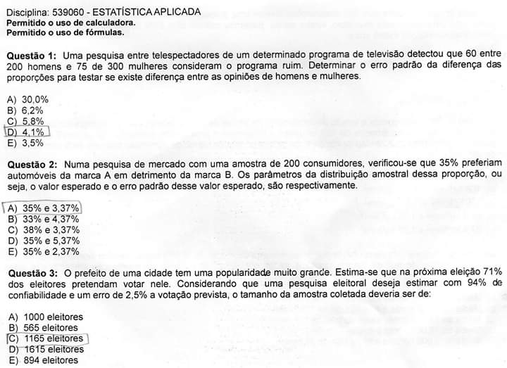 Questao 2: Numa pesquisa de mercado com uma amostra de 200 consumidores, verificou-se que 35% preferiam automoveis da marca A em detrimento da marca B. Os parametros da distribuicao amostral dessa proporcao, ou seja, valor esperado e erro padrao desse valor esperado, sao respectivamente. A) 35% e 3,37% B) 33% e 4,37% C) 38% e 3.37% D) 35% e 5,37% E) 35% e 2,37%